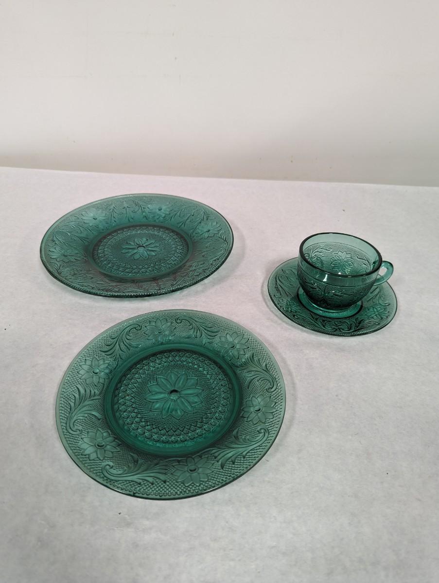 4 dinner plates, 3 salad plates, 3 cups, 4 saucers
