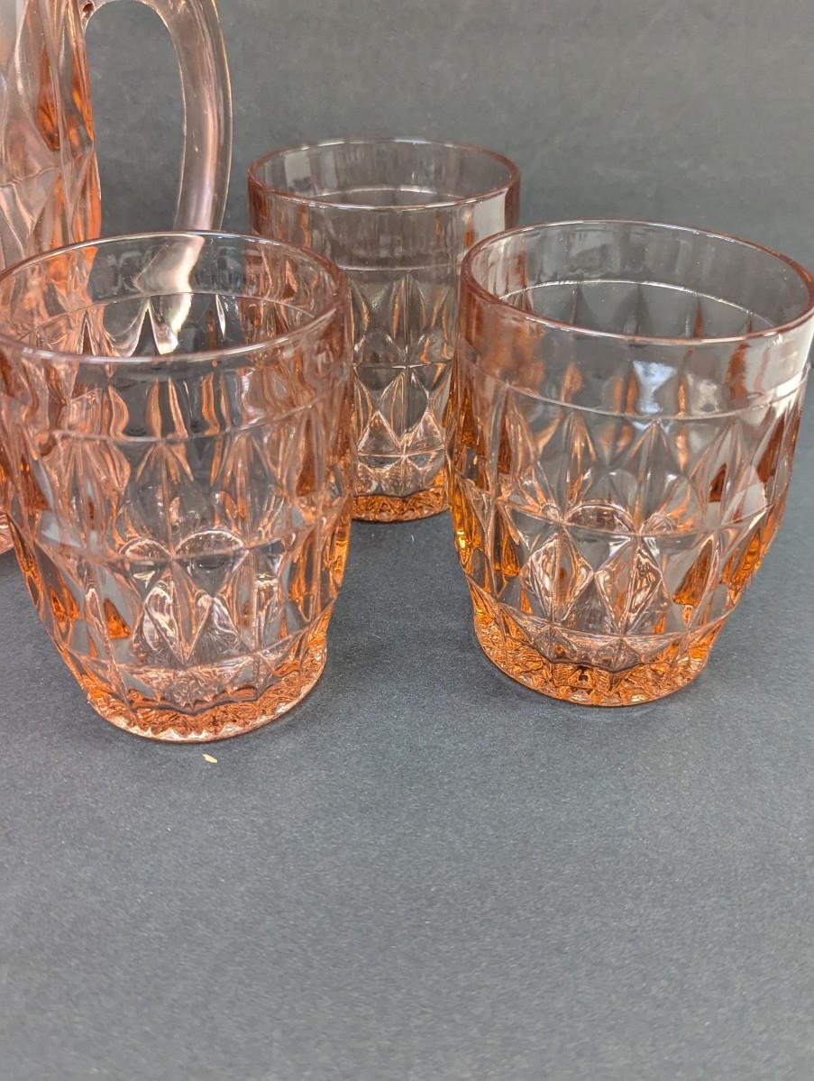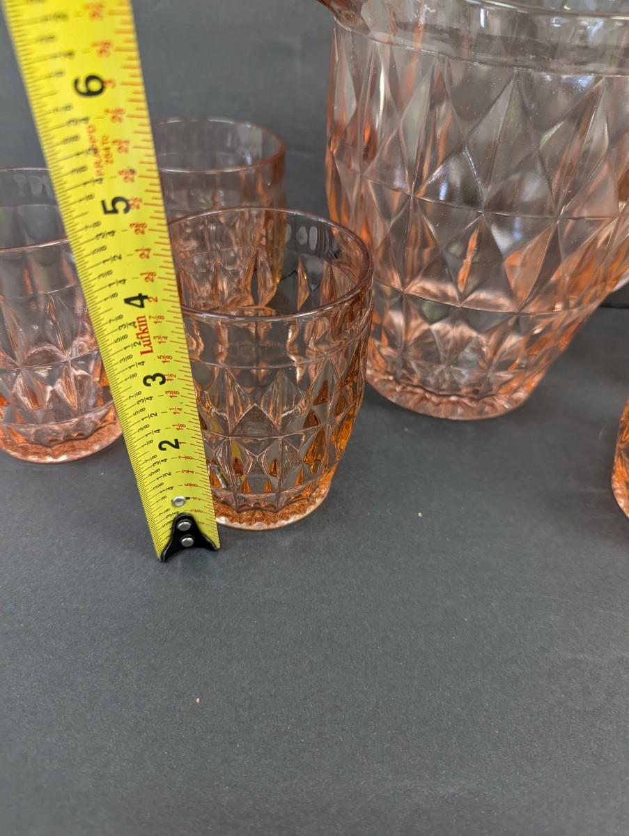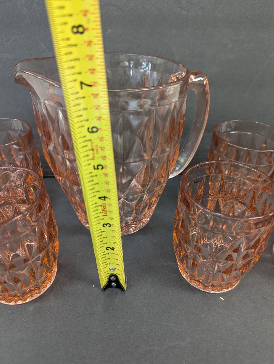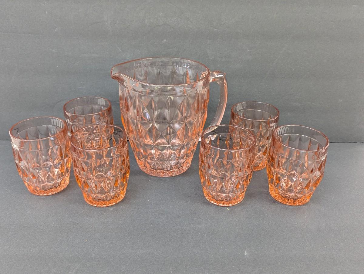 Tiara Jeanette Windsor Diamond Pink Depression Glass Pitcher With 6 Glasses