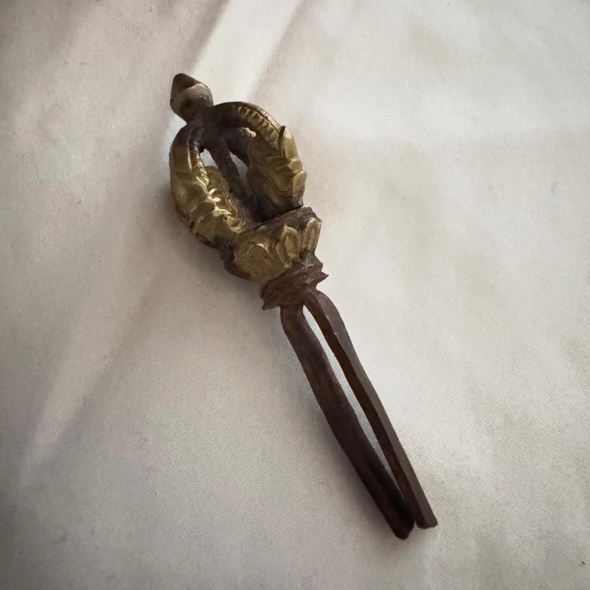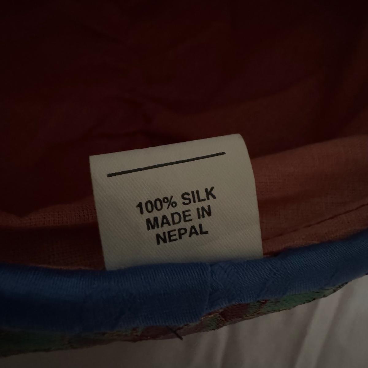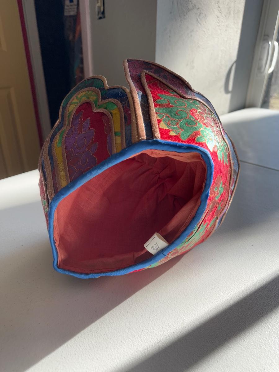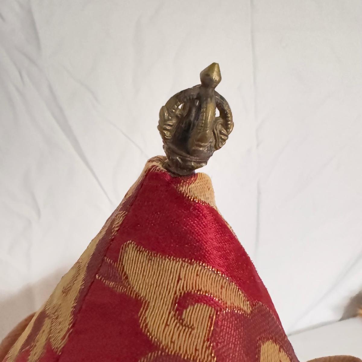 Lot includes one hat that was made in Nepal and marked 100% silk. Hat appears to be a Tibetan Monk ritual hat. The hat has a brass pendant on the top that is easily removable. The hat measures 12”D x 11”H. Shipping available.
