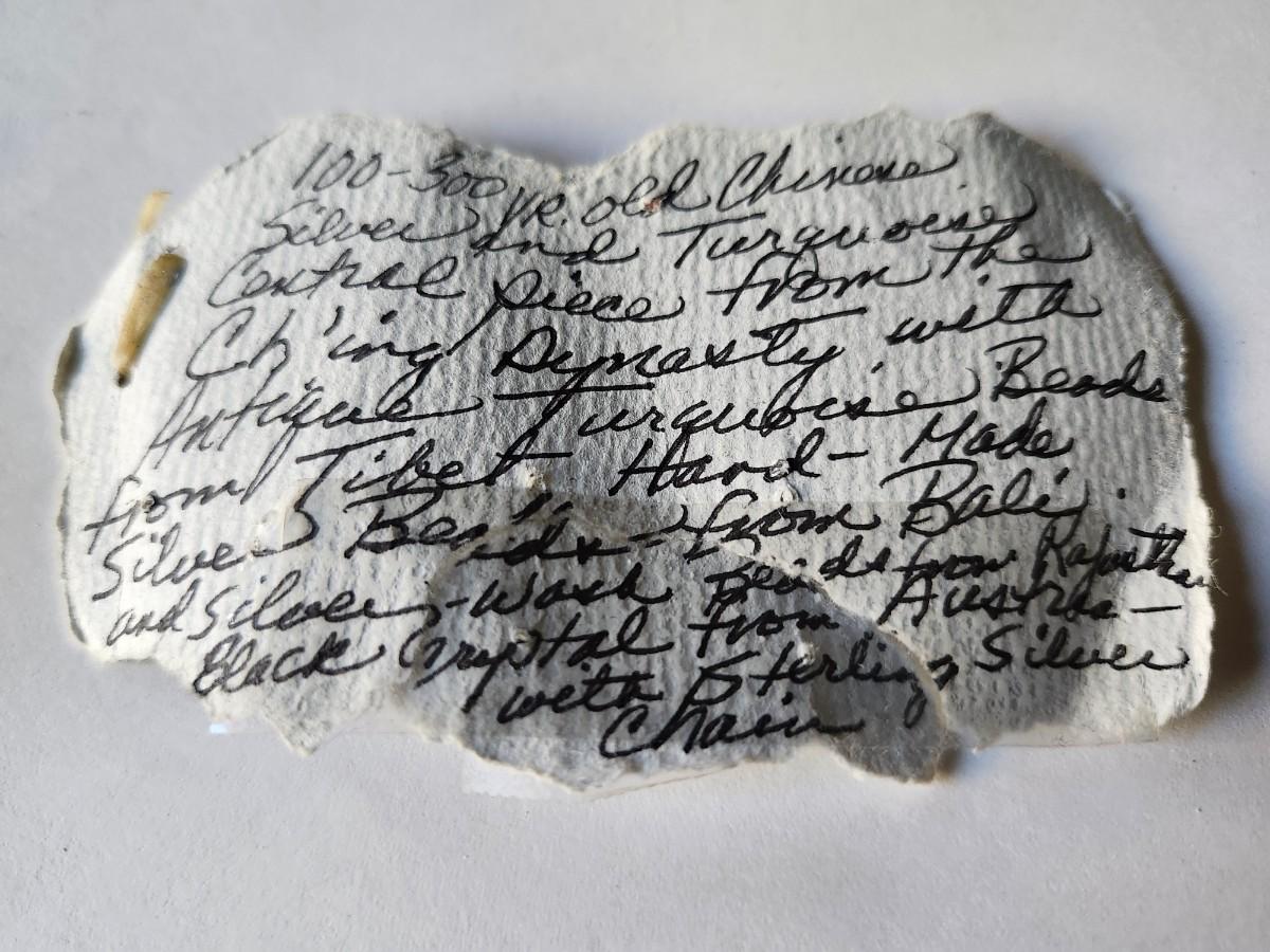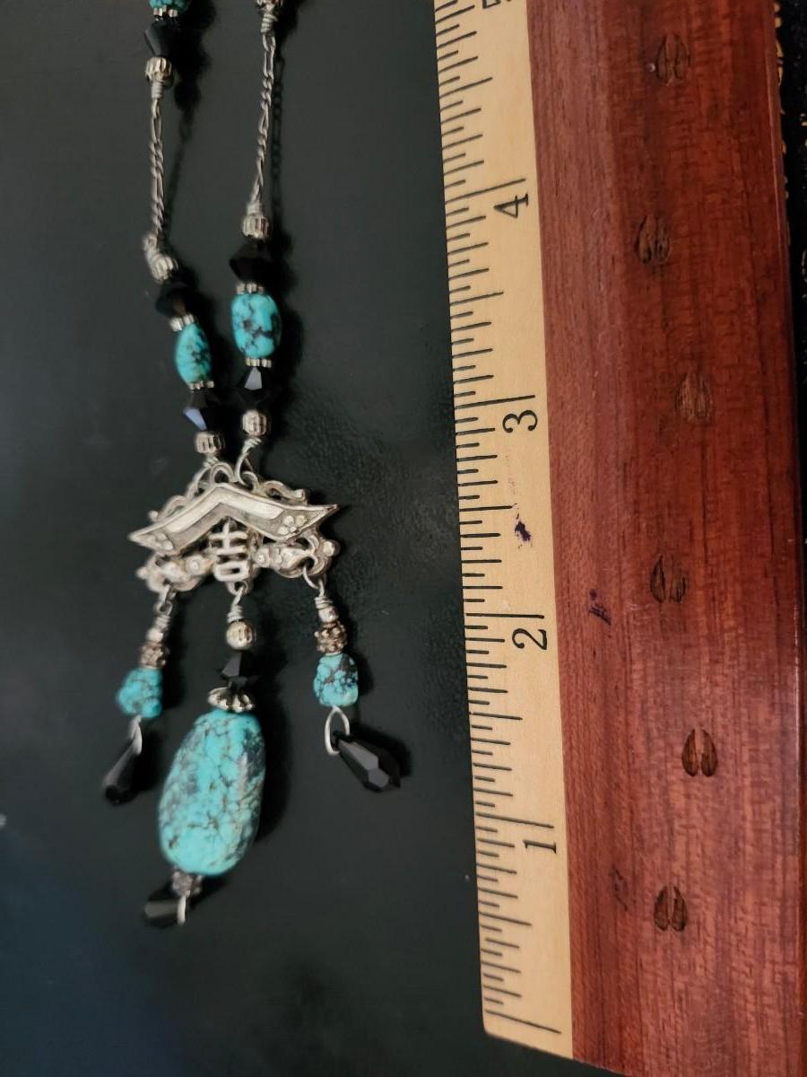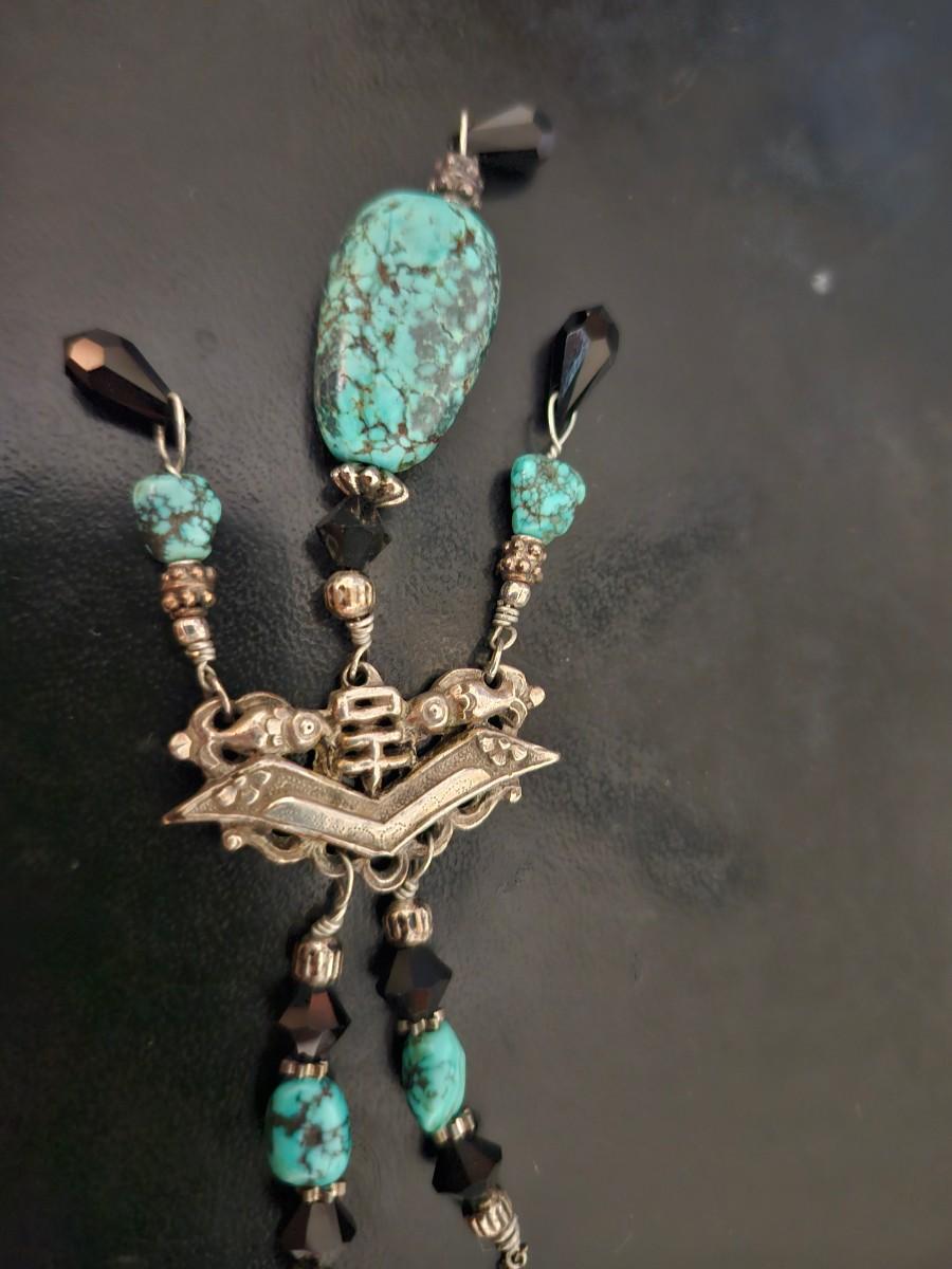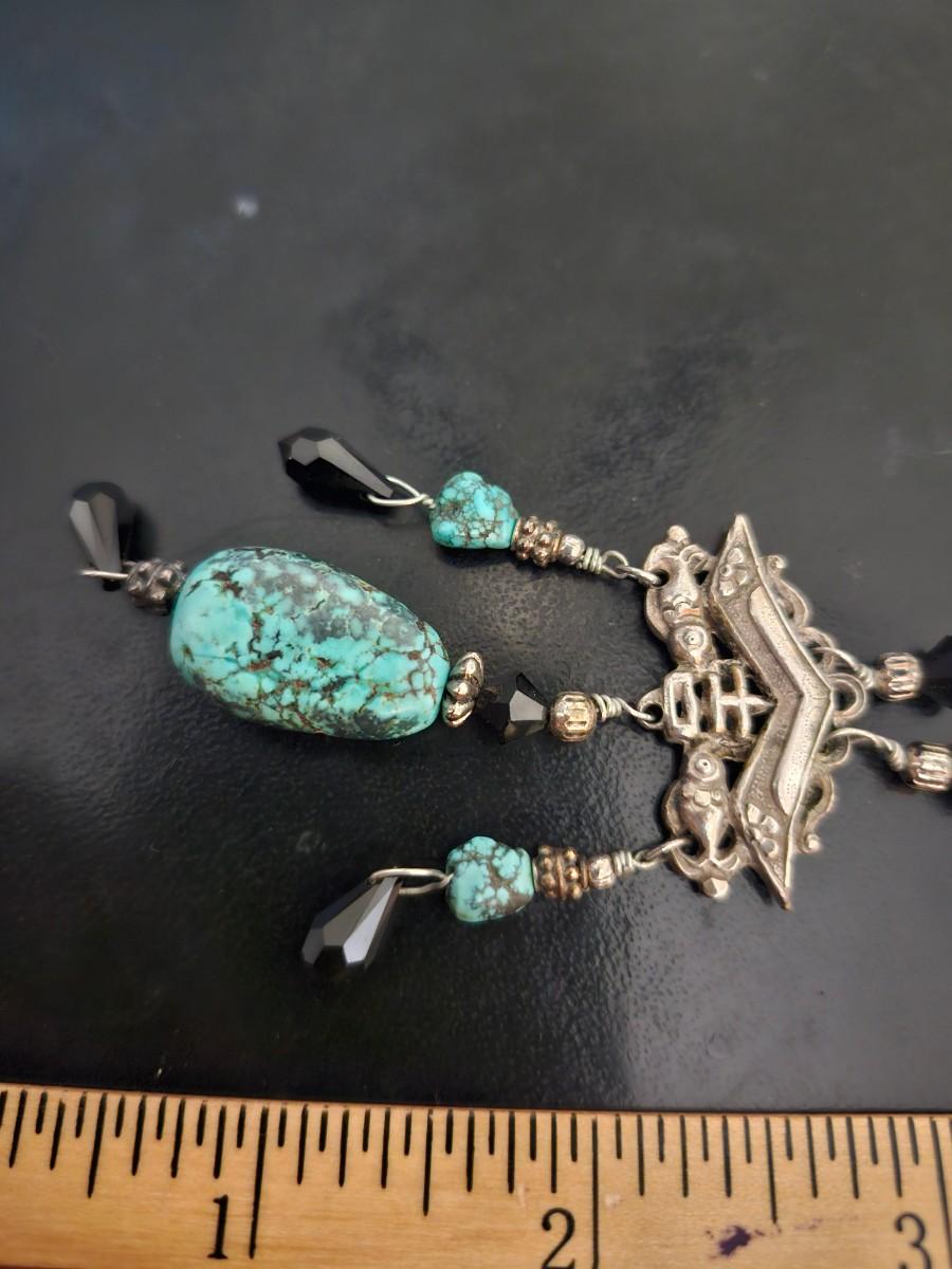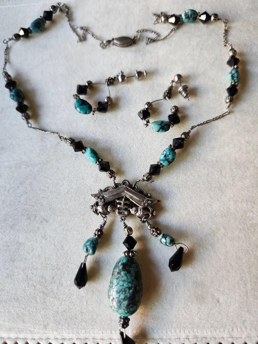 Beautiful necklace and pierced earrings with handmade beads from Bali, black crystal from Austria, and turquoise from Tibet. Silver chain. 24" length Very nice condition.