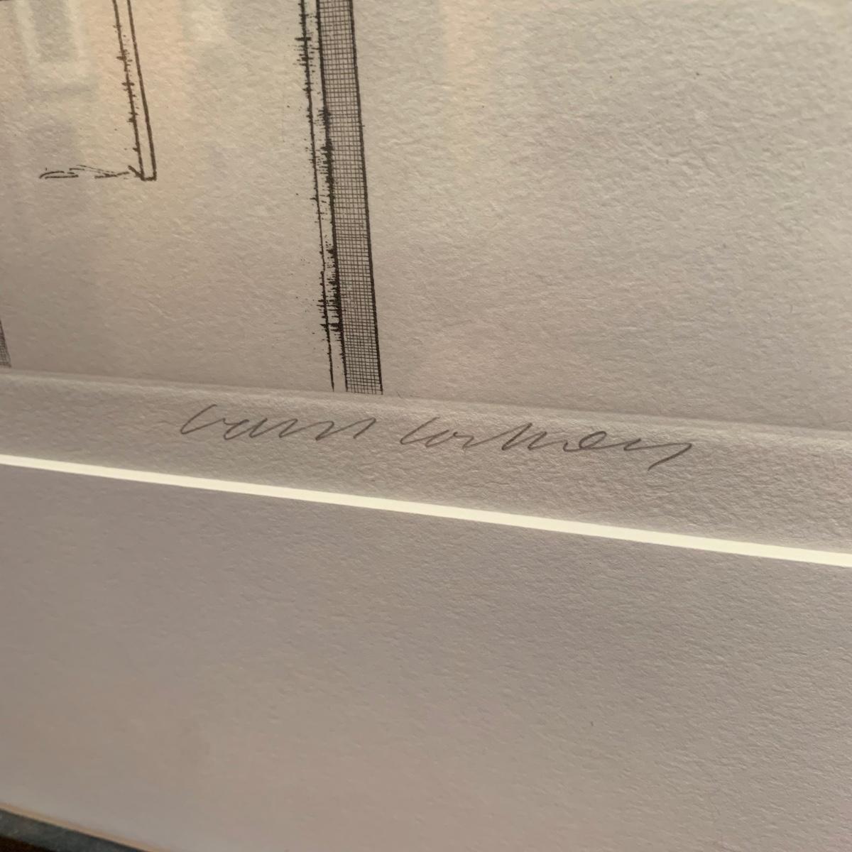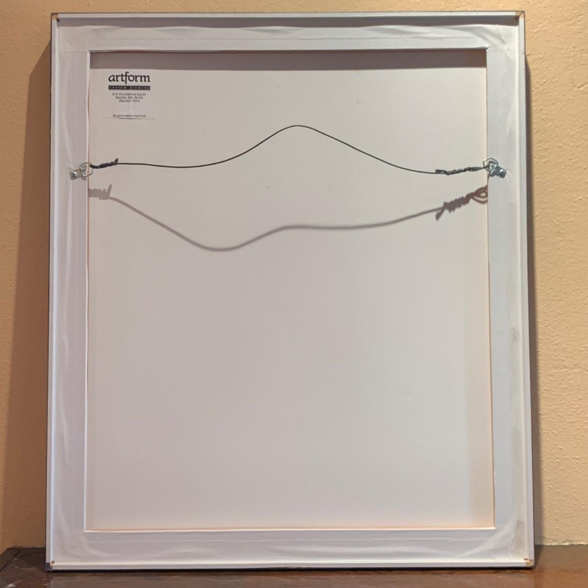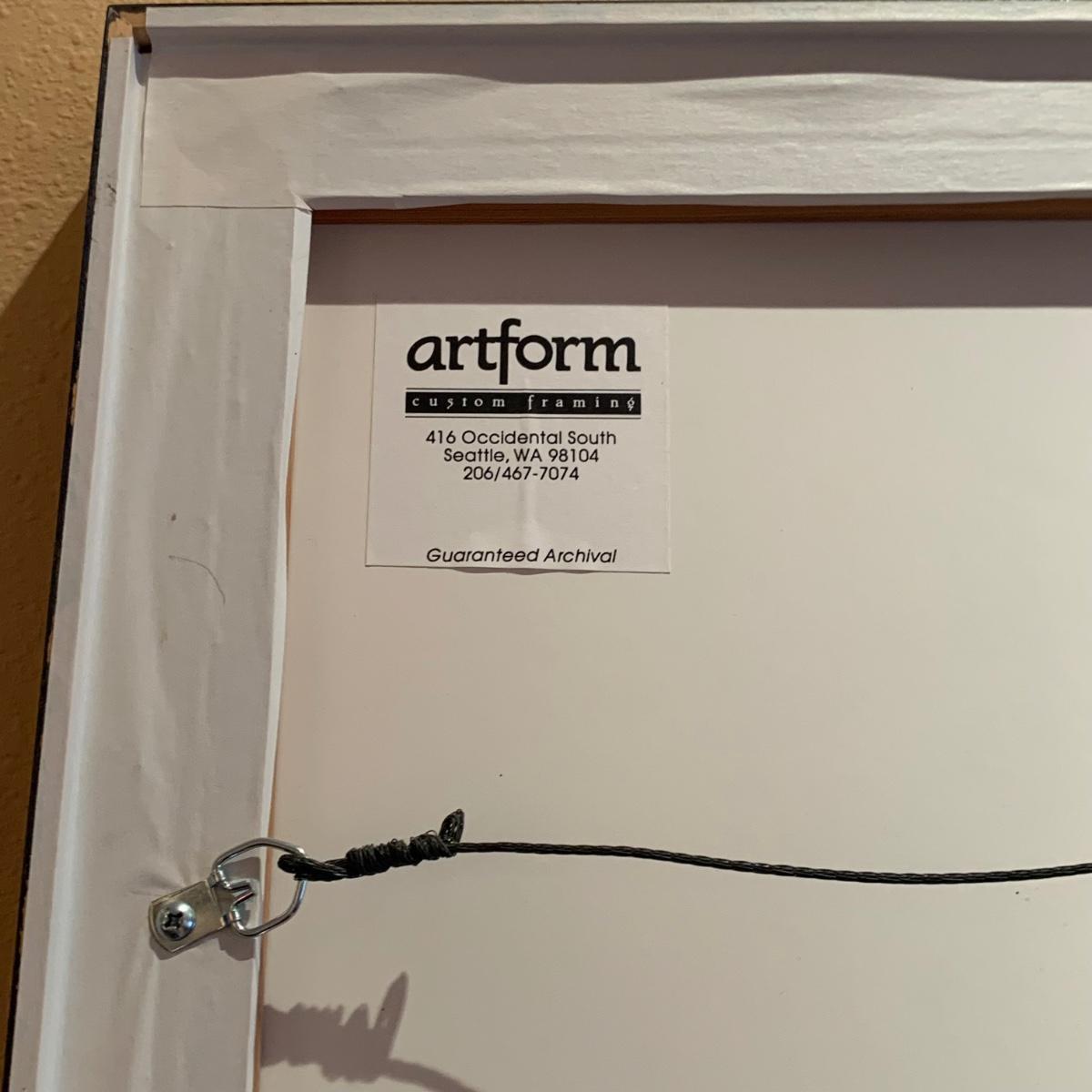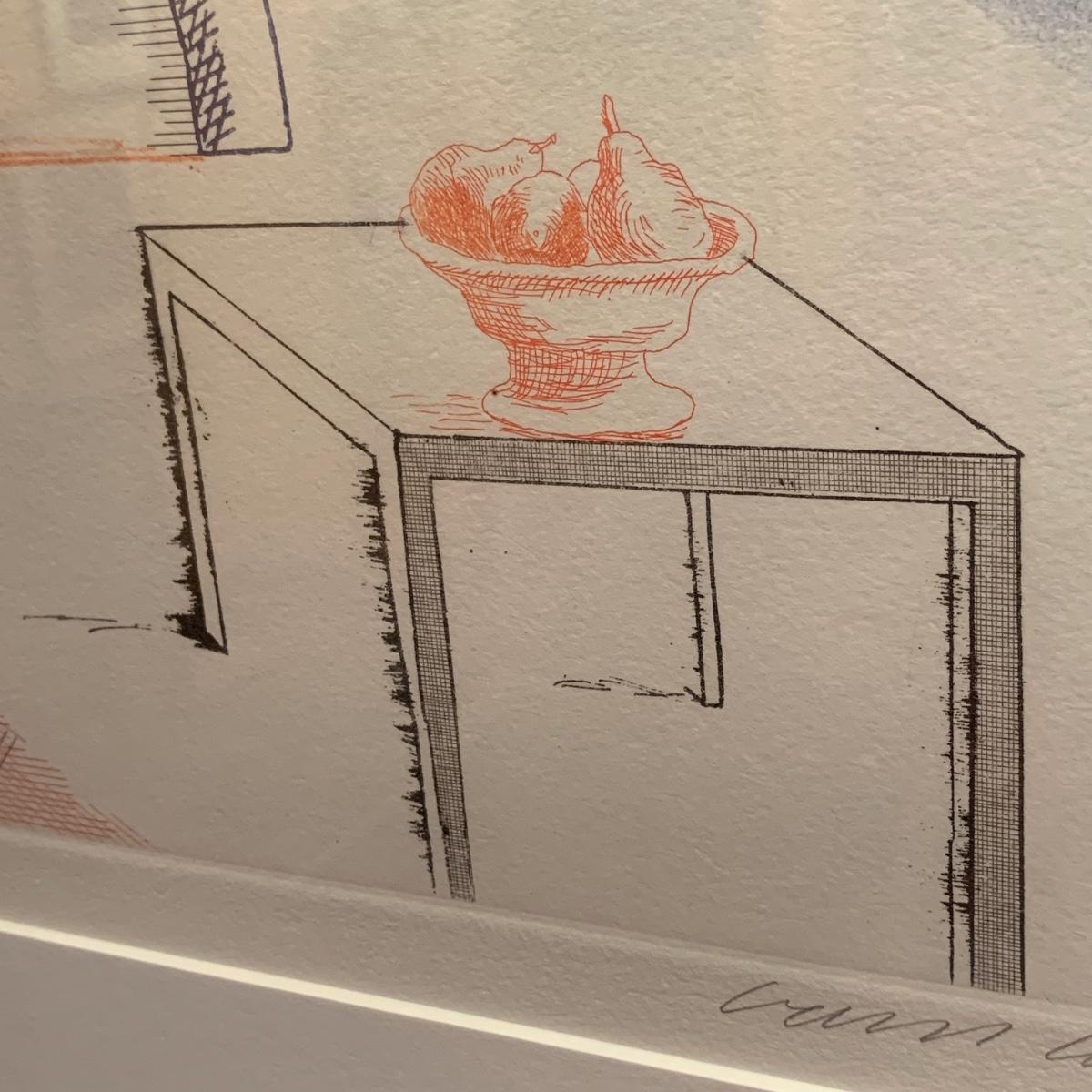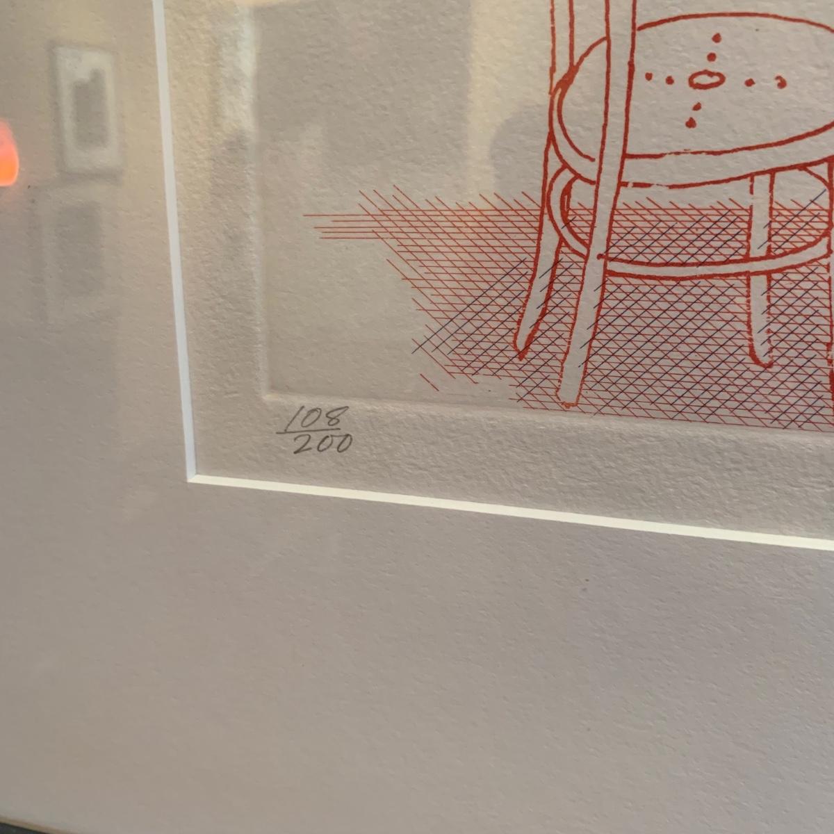 This lithograph is titled “Tick It, Tock It, Turn It, True” by David Hockney. It is signed with pencil in the bottom right corner and numbered 108/200. The art is protected with a white matting and glass. It is framed in a wooden frame that measures 22.5” x 26”H. Shipping available. Shipping can be costly. We suggest contacting our preferred local shipping provider, Postage Express, with dimensions and getting an estimate before bidding: (828) 255-9250 or shipping@postageexpressnc.com.