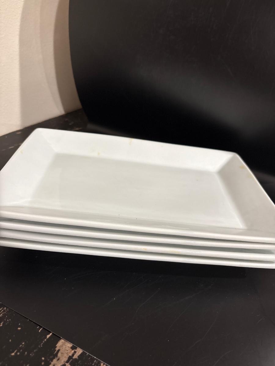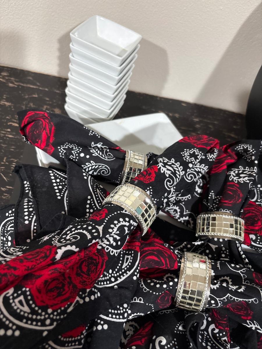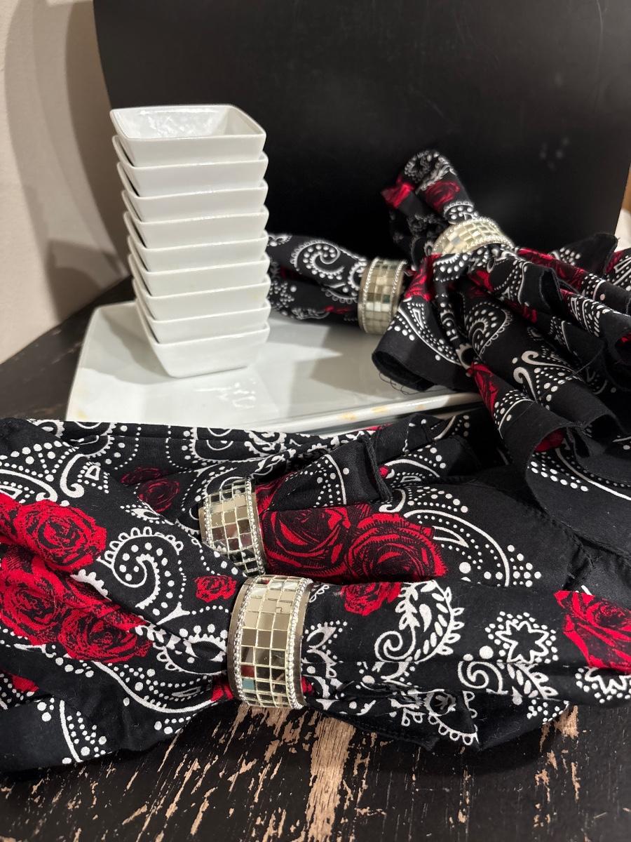 Nine white ceramic tidbit bowls. Four white ceramic trays. Six cloth napkins and a little glitz with four mirrored napkins rings!