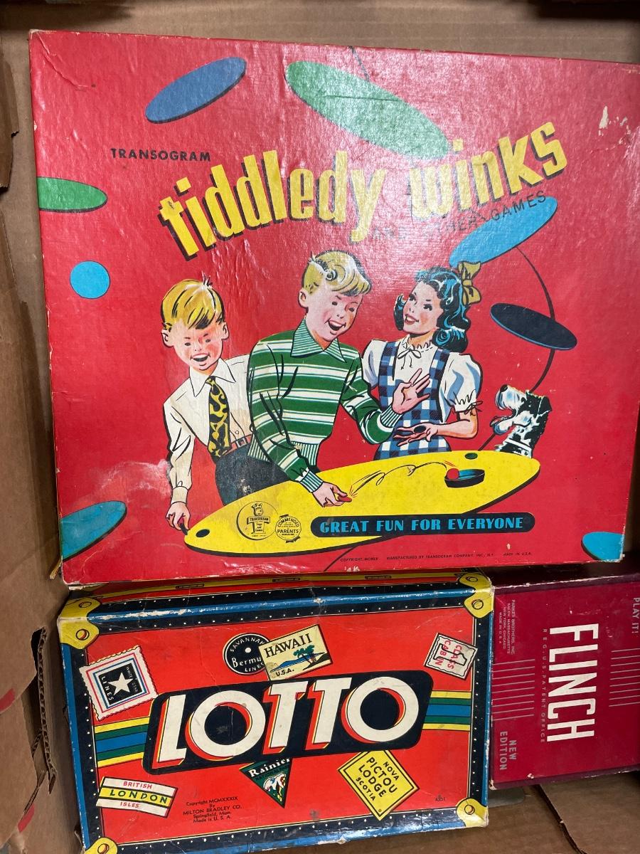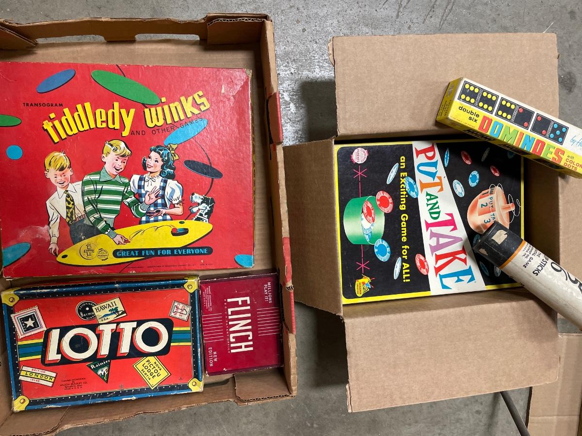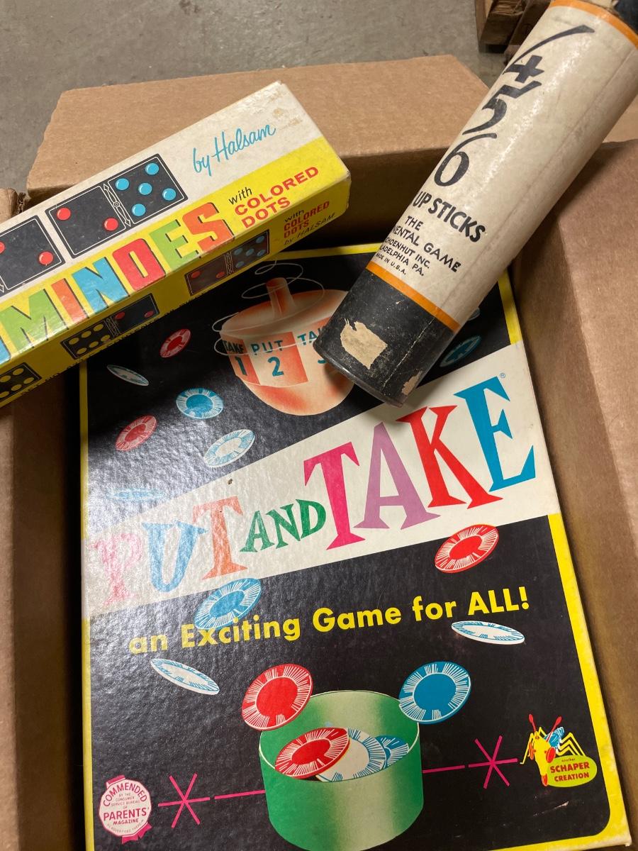 Tiddlywinks, lotto, flinch, put and take, pick up sticks and dominoes