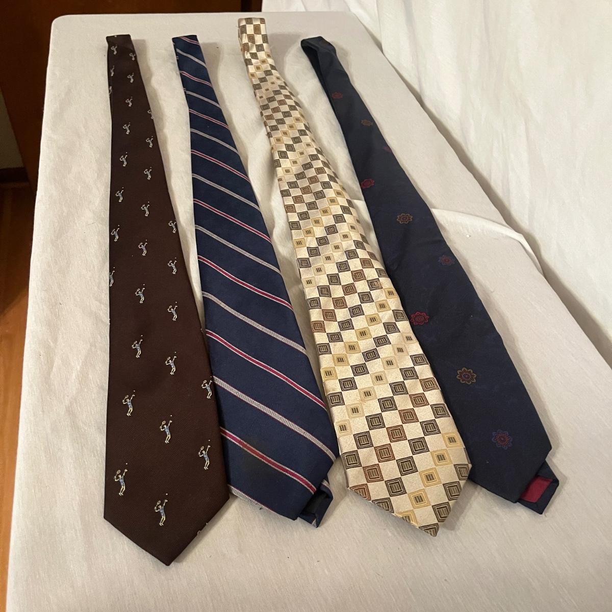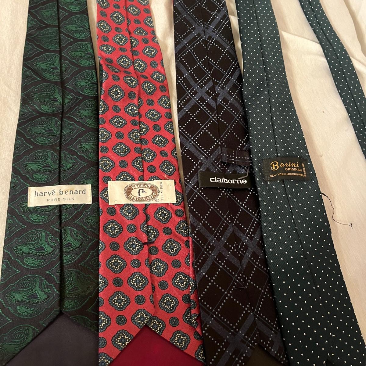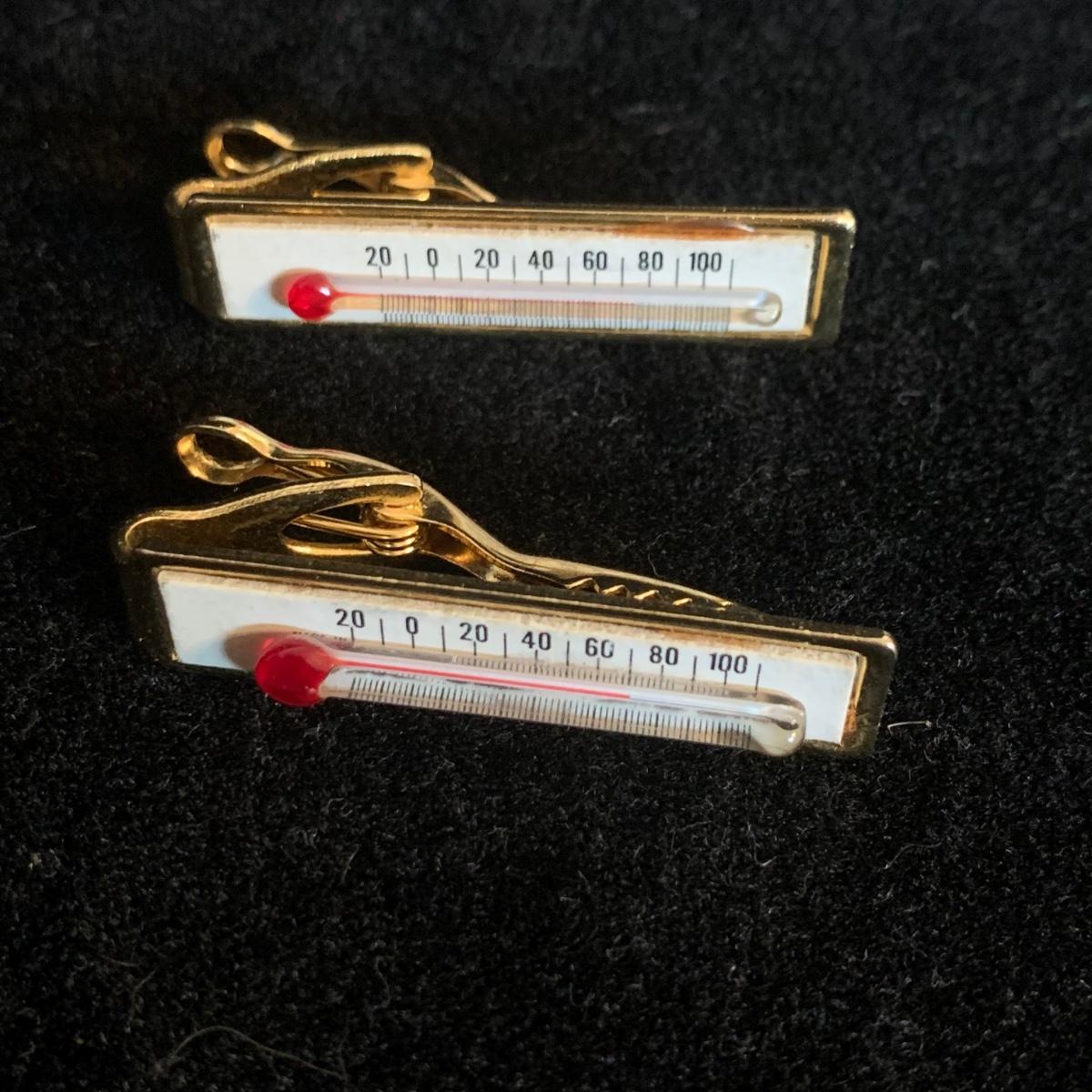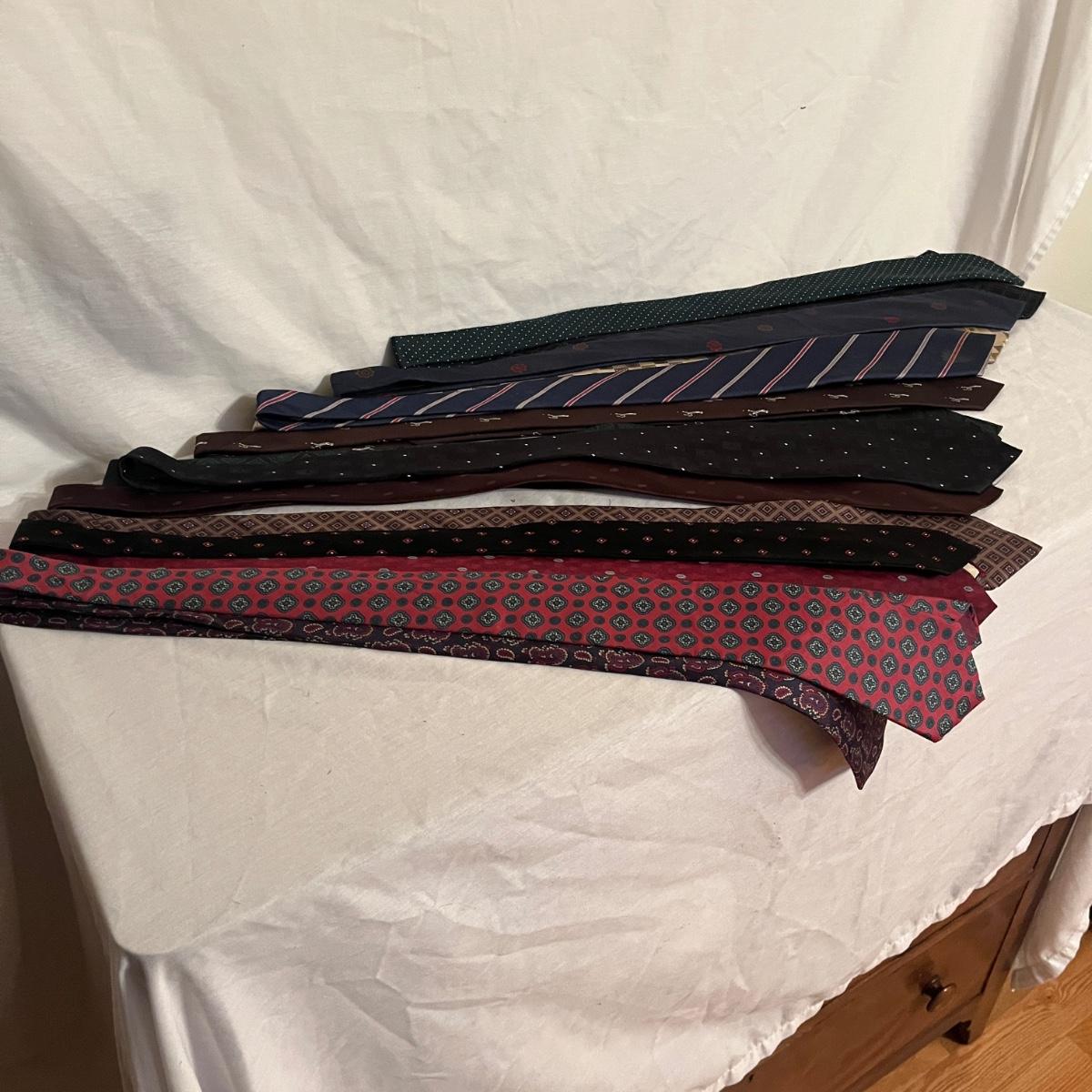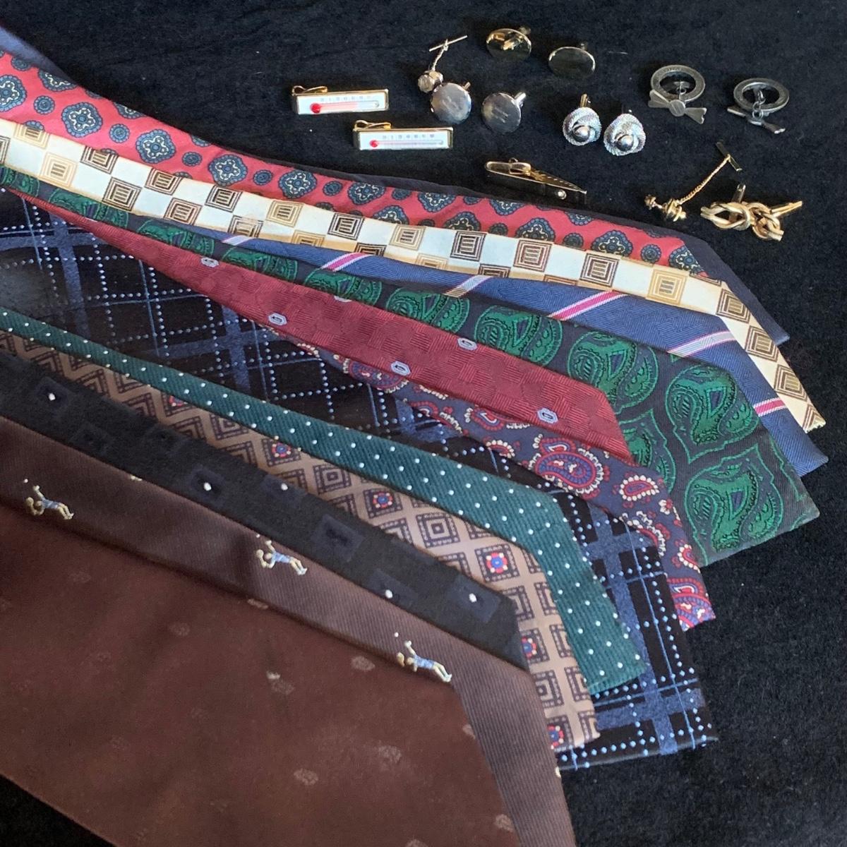 Lot contains 14 ties with brands including Van Heusen, Harve Bernard, Claiborne, Peacock, 5850 and more. Also, two cufflink and tie clip sets, two pairs of cuff links, and two thermometer clips. The set monogrammed with “B” is stamped “Hadley Sterling”.
