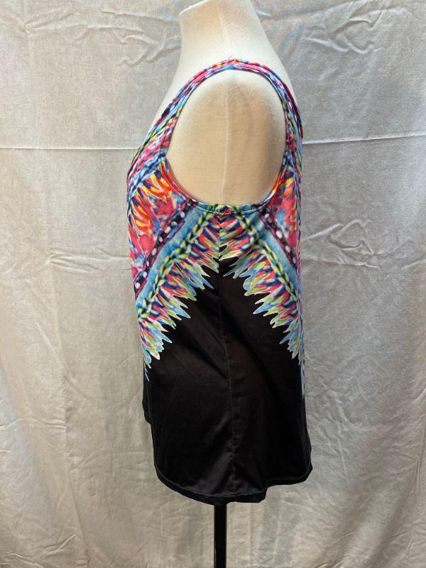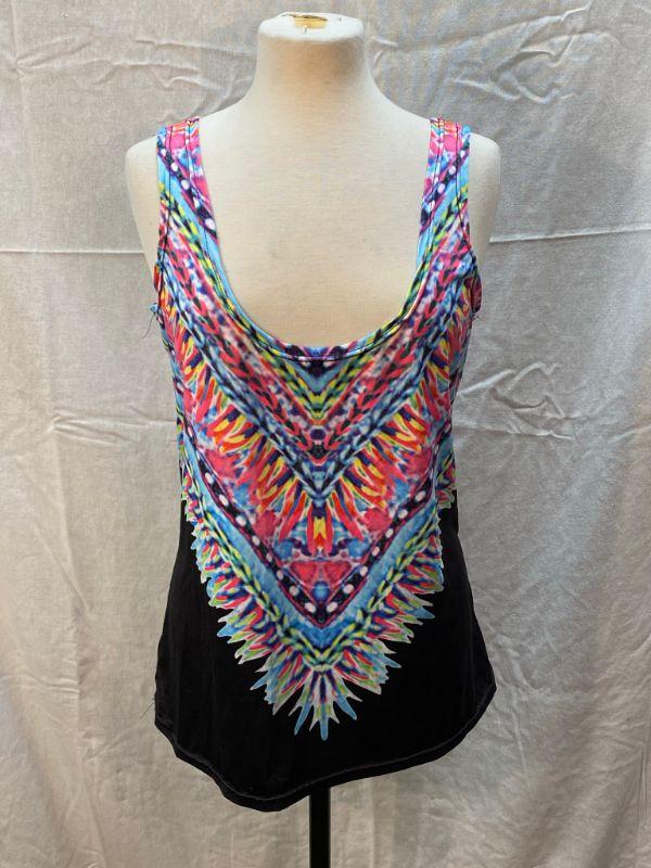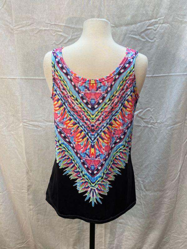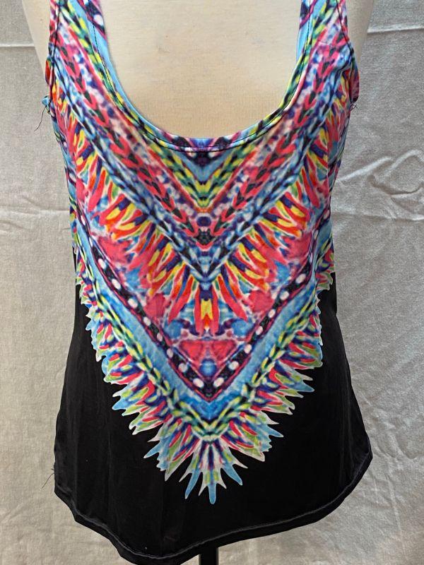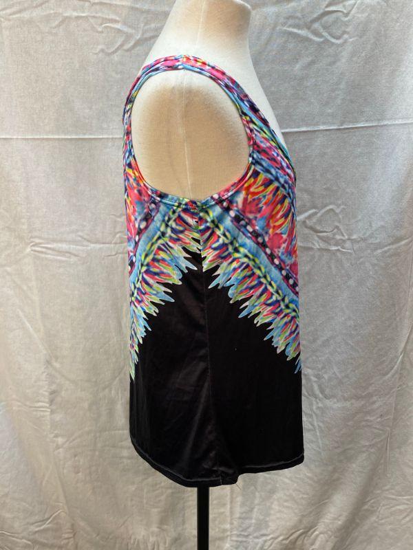 Colorful tie dye print tank. Great with a black suit to give some color or with your favorite denim. Tags were removed, guessing it is a large, maybe even a xlarge. Does have some stretch. Good condition.