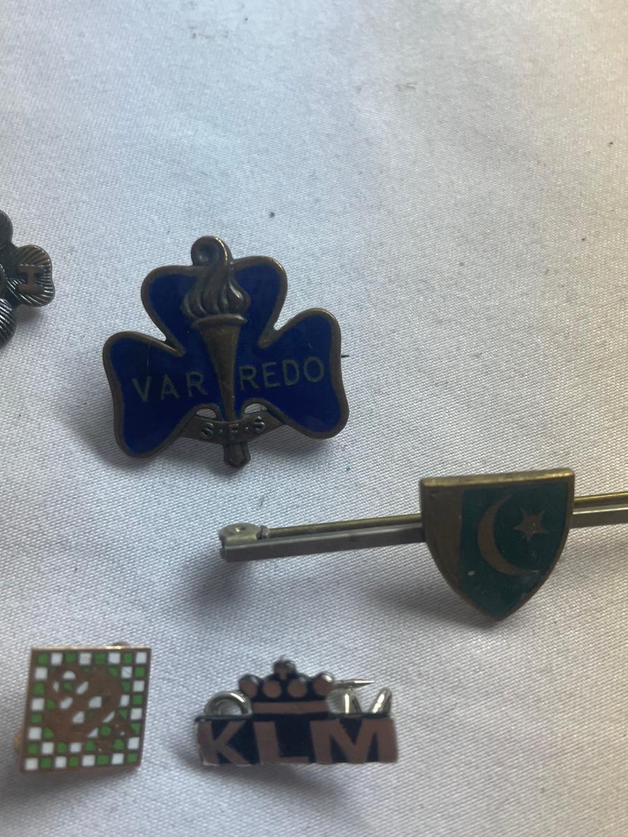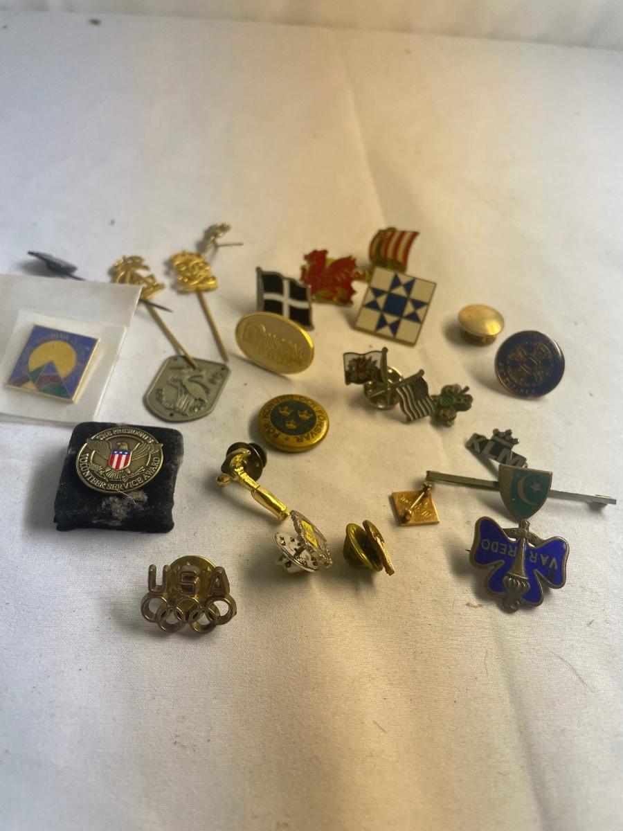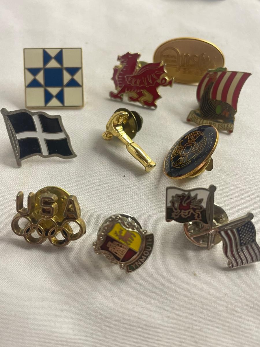 This lot includes plenty of International pieces from places such as Scotland, England, Wales and more. Lot includes 6 tie pins (largest measures @ 2” long), 11 lapel pins plus 15 smaller pins, a pair of cufflinks and a small plaque with herons that measures 0.75” x 1”.