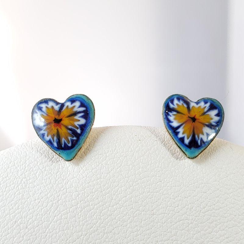 Gold Stud Heart-shaped Earrings w/ Pretty Tie-dye/Flower-like Pattern