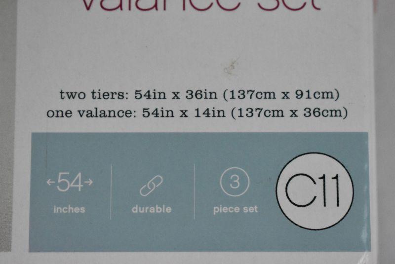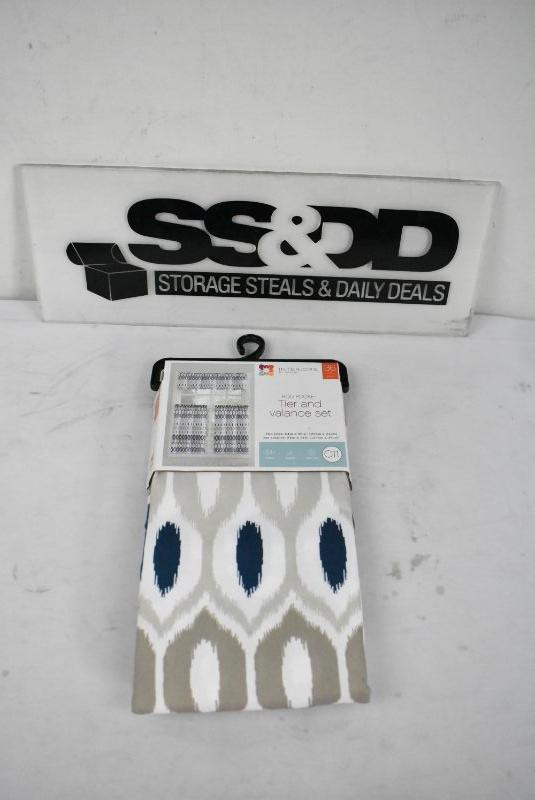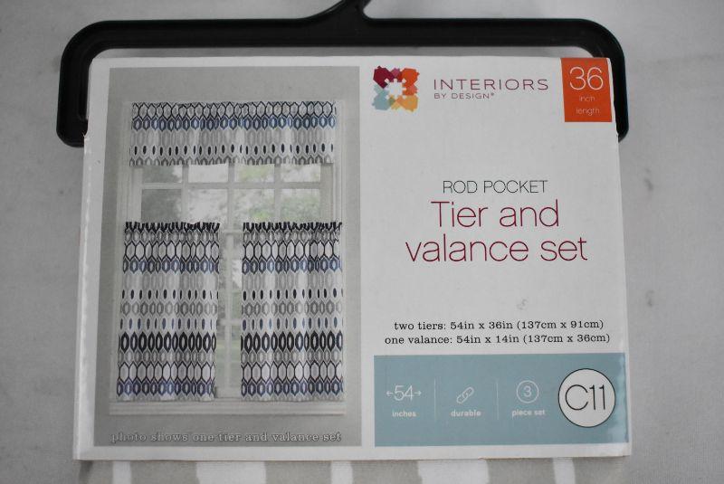 Tier & Valance Set, Navy & Taupe Ikat Print - New