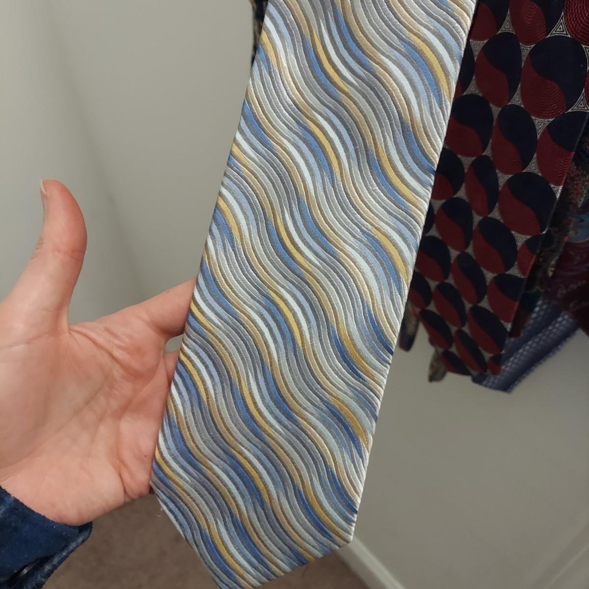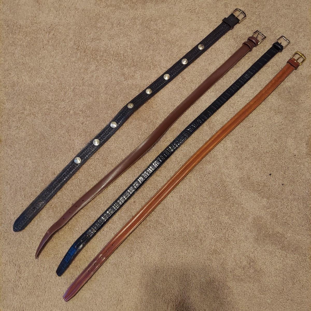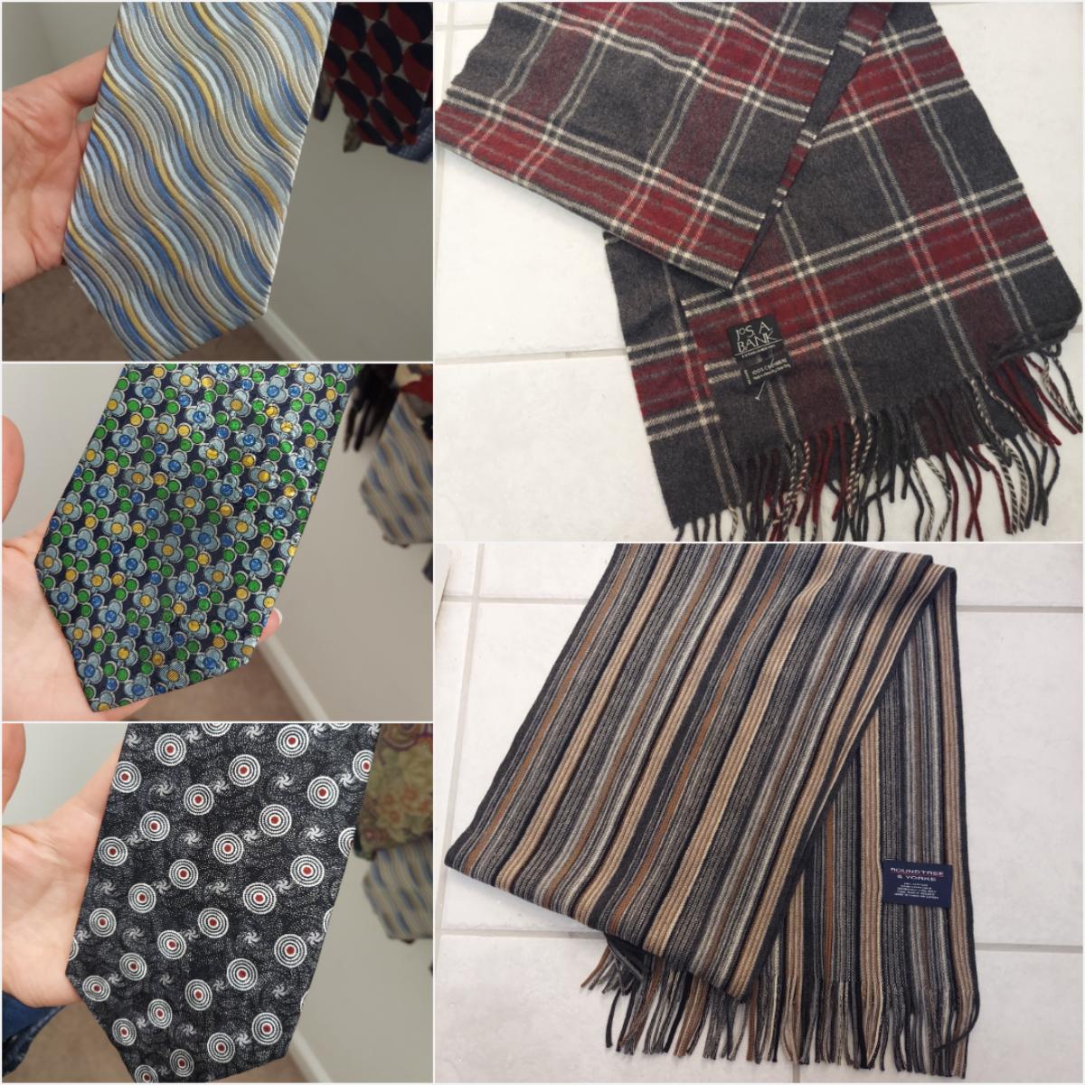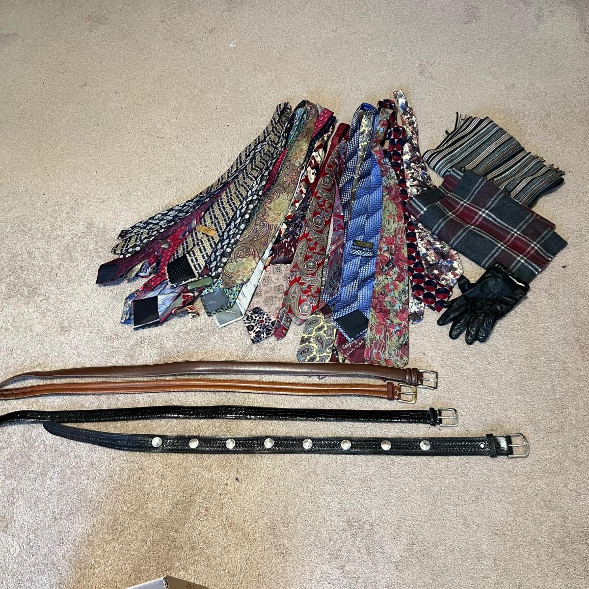 Lot includes 20+ neckties, four leather belts size 34 waist and one pair of leather driving gloves. Please see photos for details. Shipping available