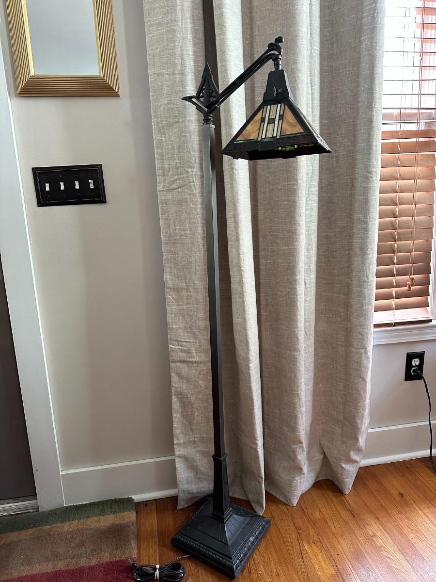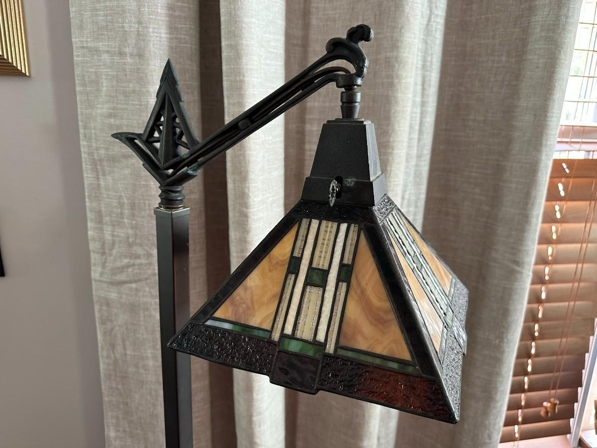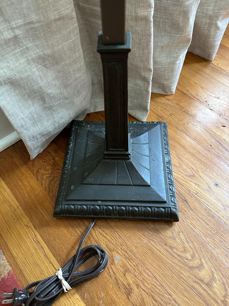 Metal w/cut glass shade. Measures 58.5" H, shade is 9" square