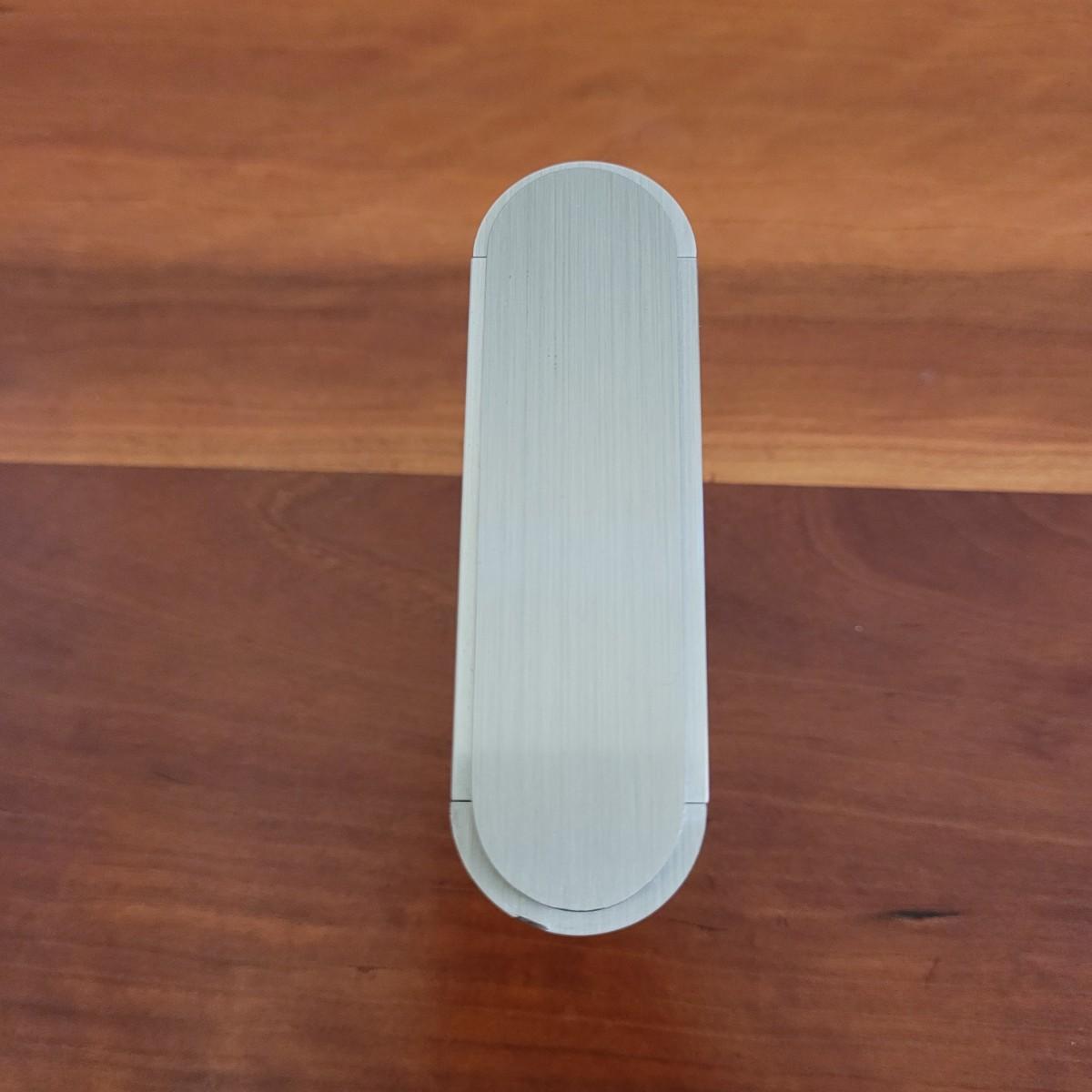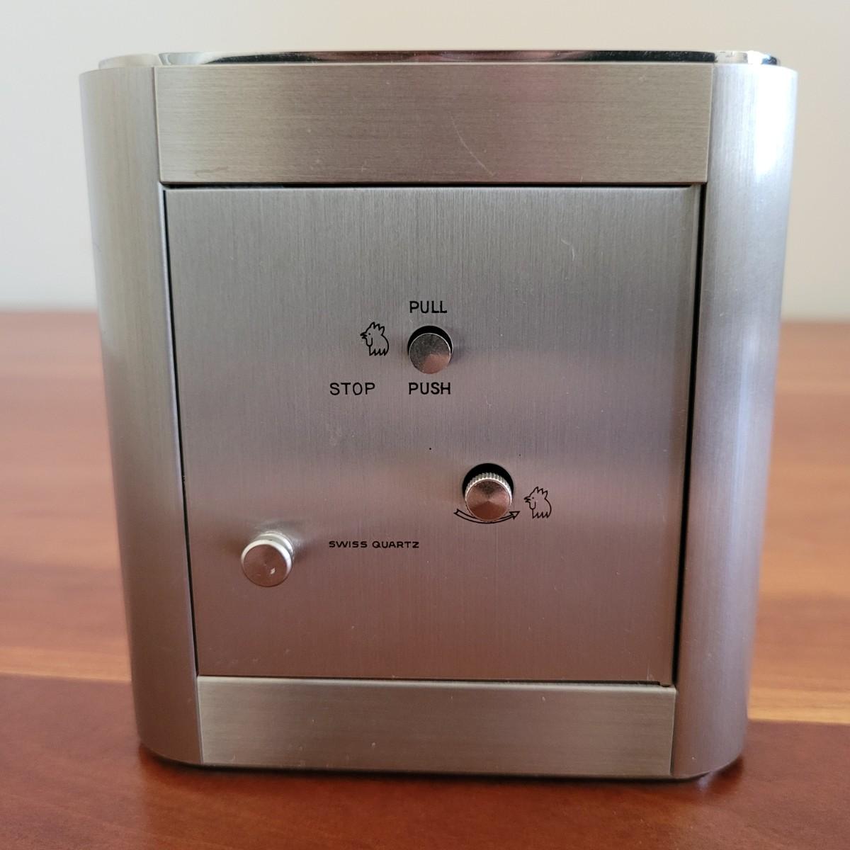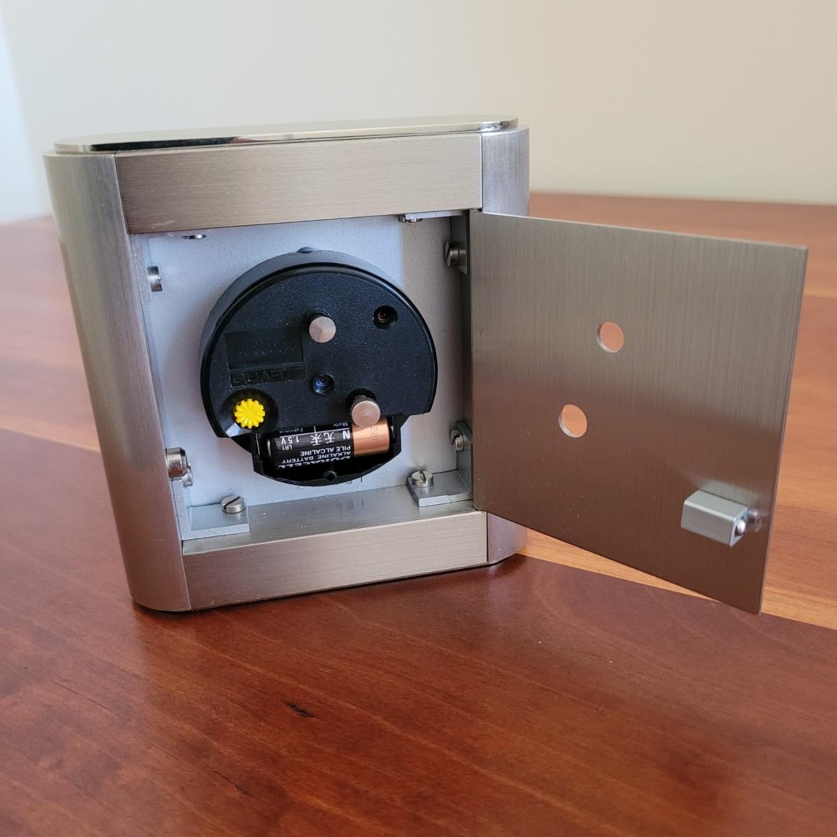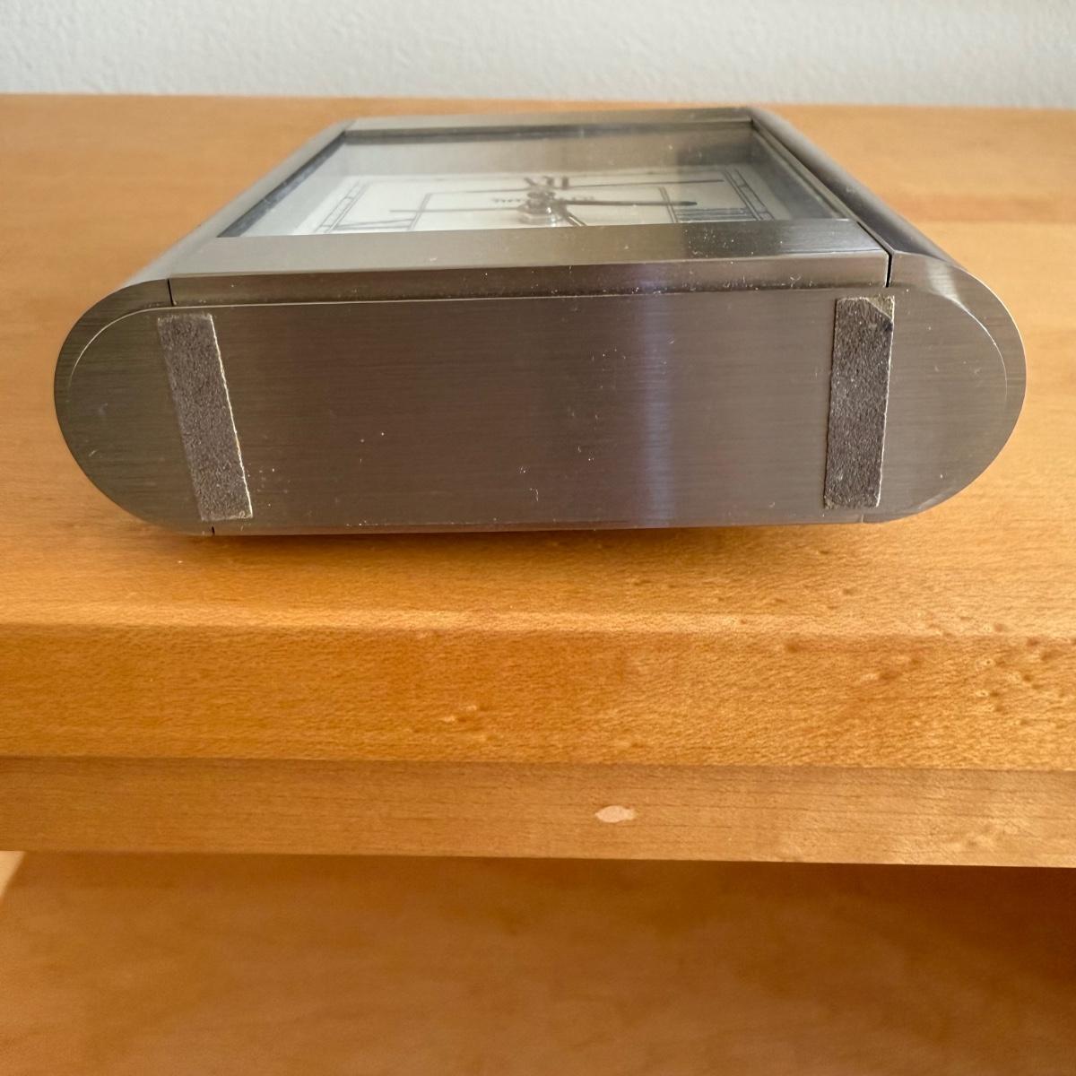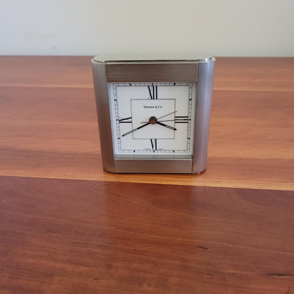 This lot includes one Tiffany and Co. Swiss made metal alarm or desk clock. It appears to be made from brushed nickel and steel. This clock is battery operated, and features a rear door that opens revealing battery and inner workings. This item is not tested as its current battery is dead. Requires a specific size battery, see photos. There is a small blemish on the top right edge that may have been a manufacturer error or tiny dent. The clock measures 4" x 1.5" x 4"H.