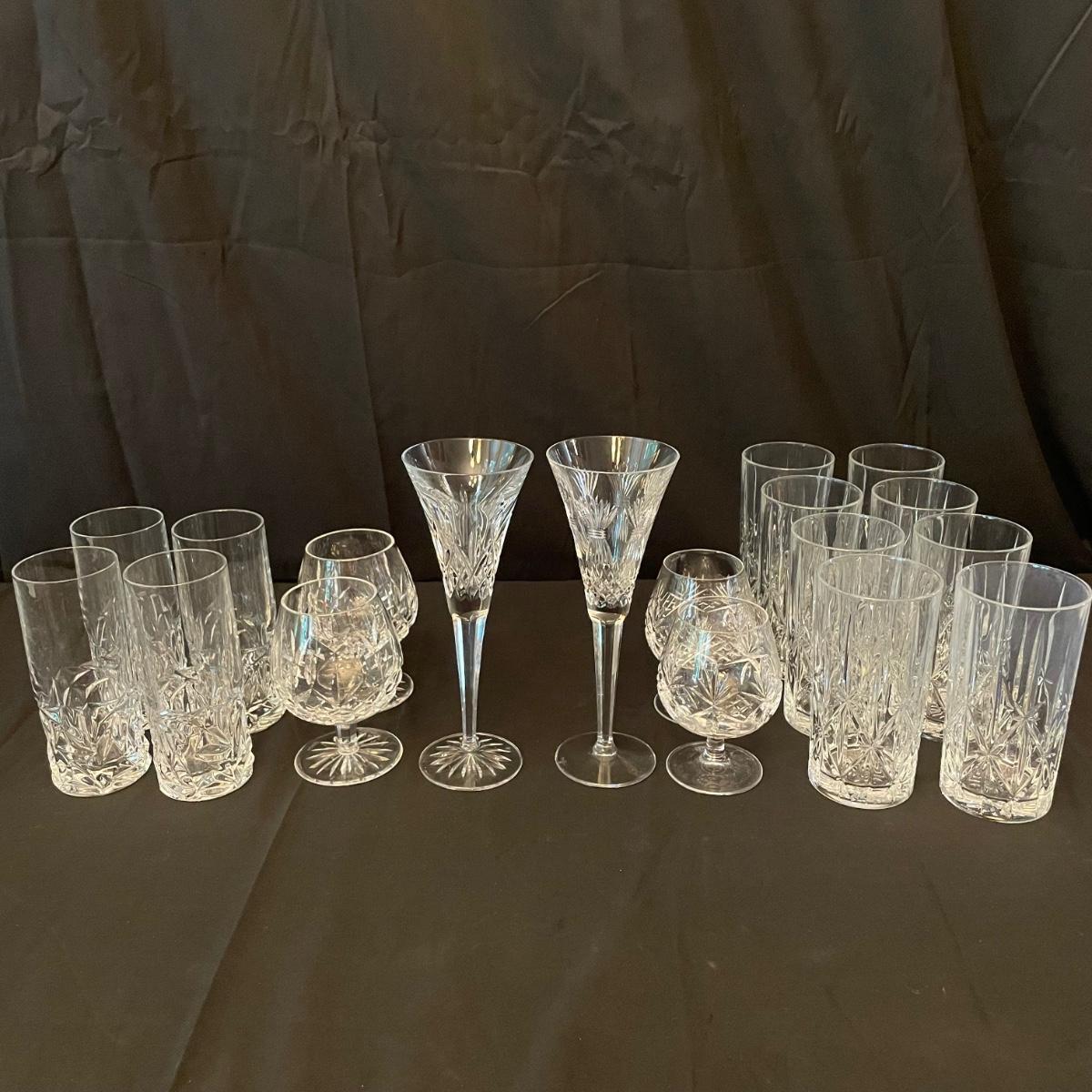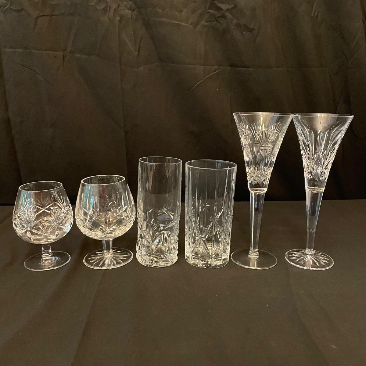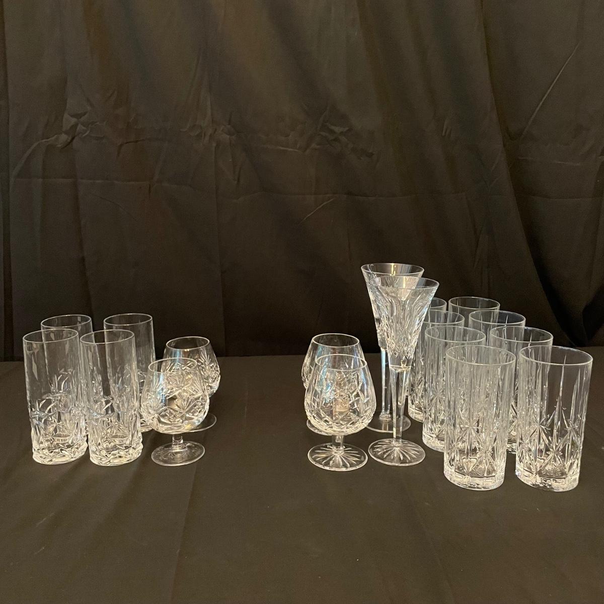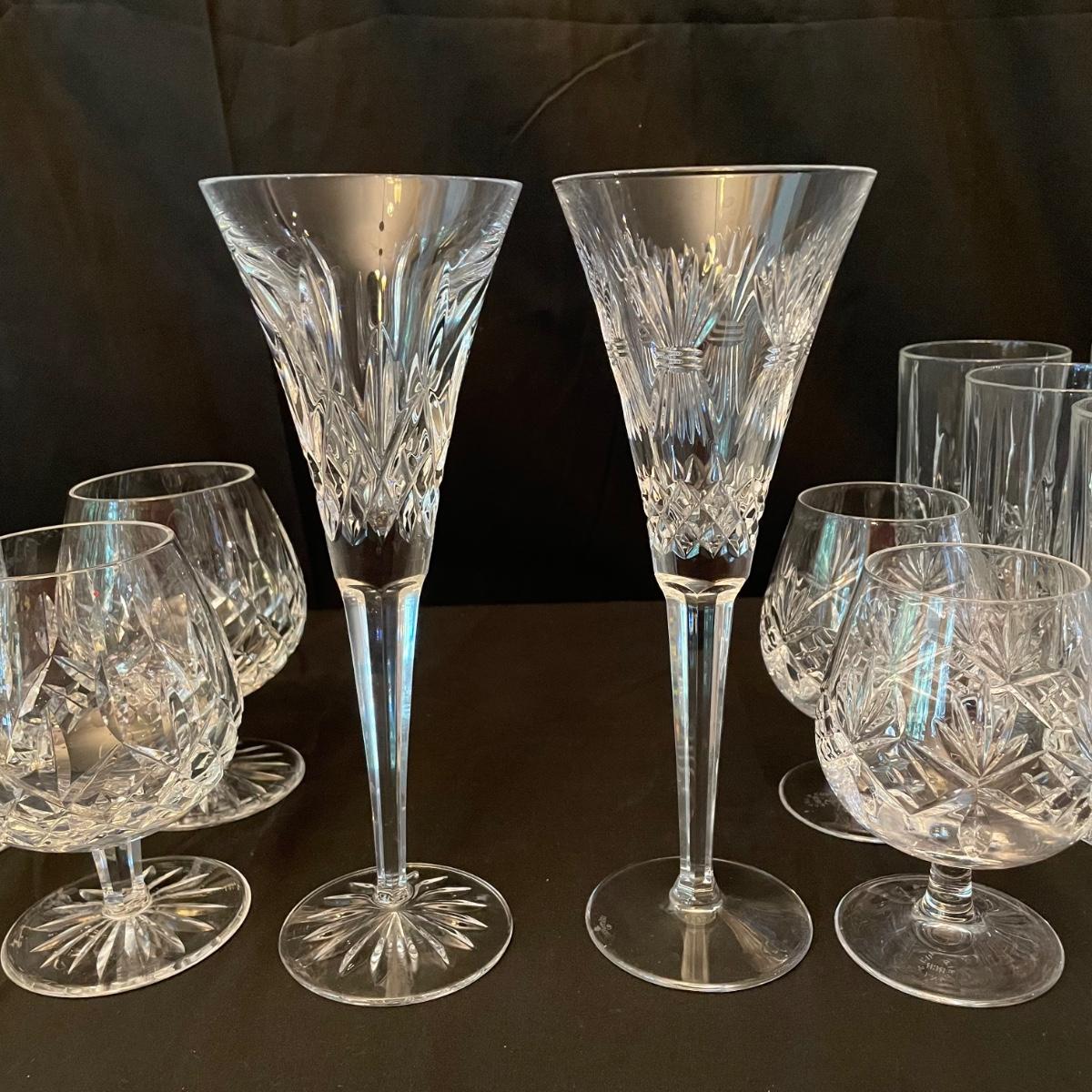 Two high-end brands for this barware collection. Two snifters and four tumblers are Tiffany & Co. Waterford marks are found on two snifters, both flutes and eight tumblers. The set of eight is marked Marquis by Waterford. The flutes are the tallest, both are 9.25”H. Shipping available.