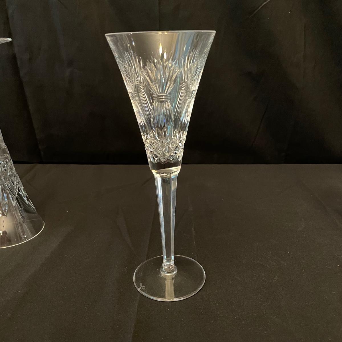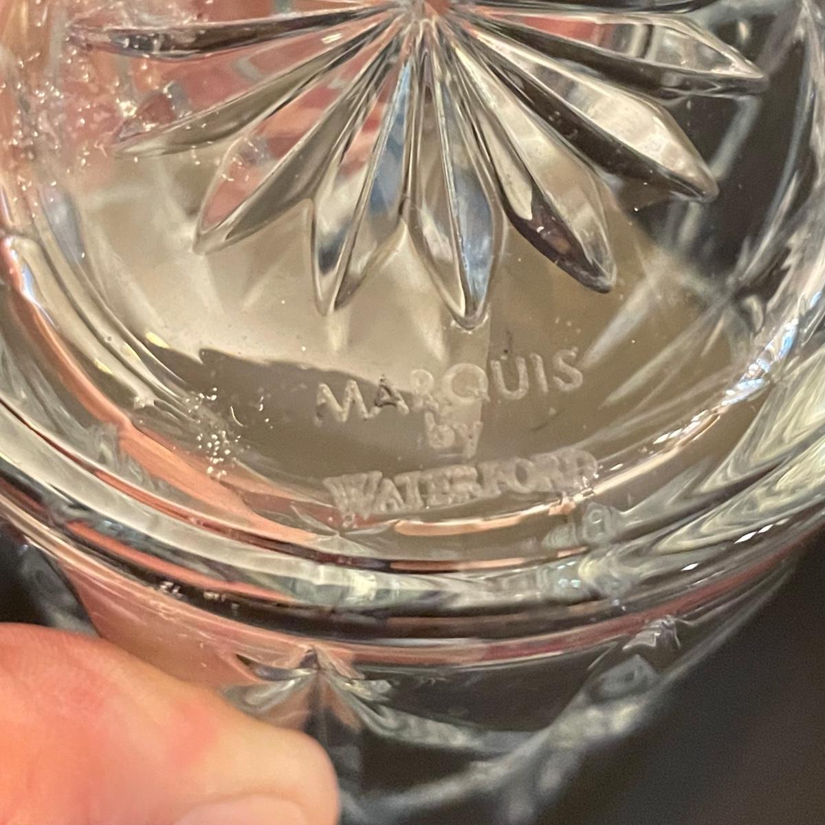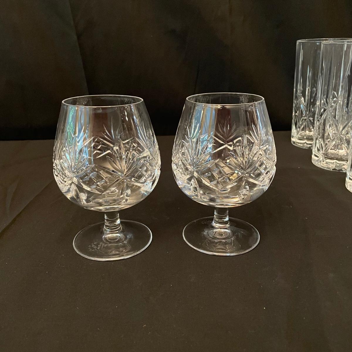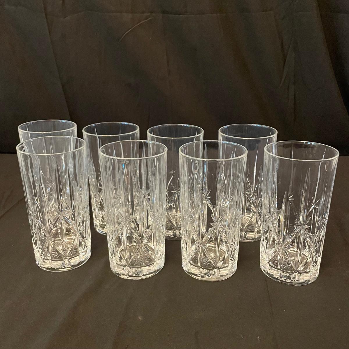 Two high-end brands for this barware collection. Two snifters and four tumblers are Tiffany & Co. Waterford marks are found on two snifters, both flutes and eight tumblers. The set of eight is marked Marquis by Waterford. The flutes are the tallest, both are 9.25”H. Shipping available.