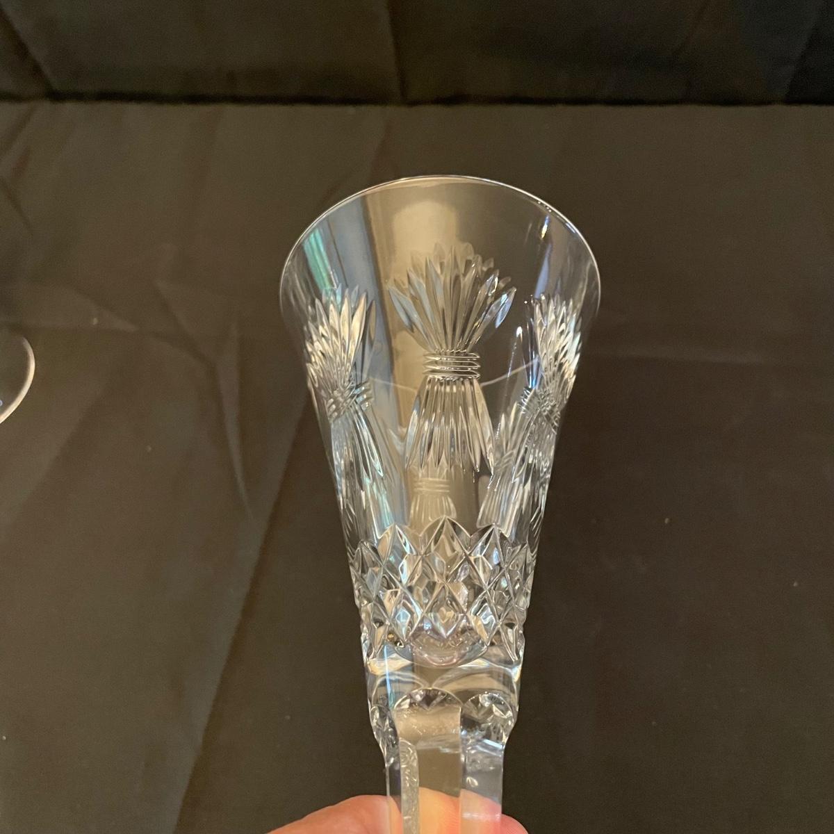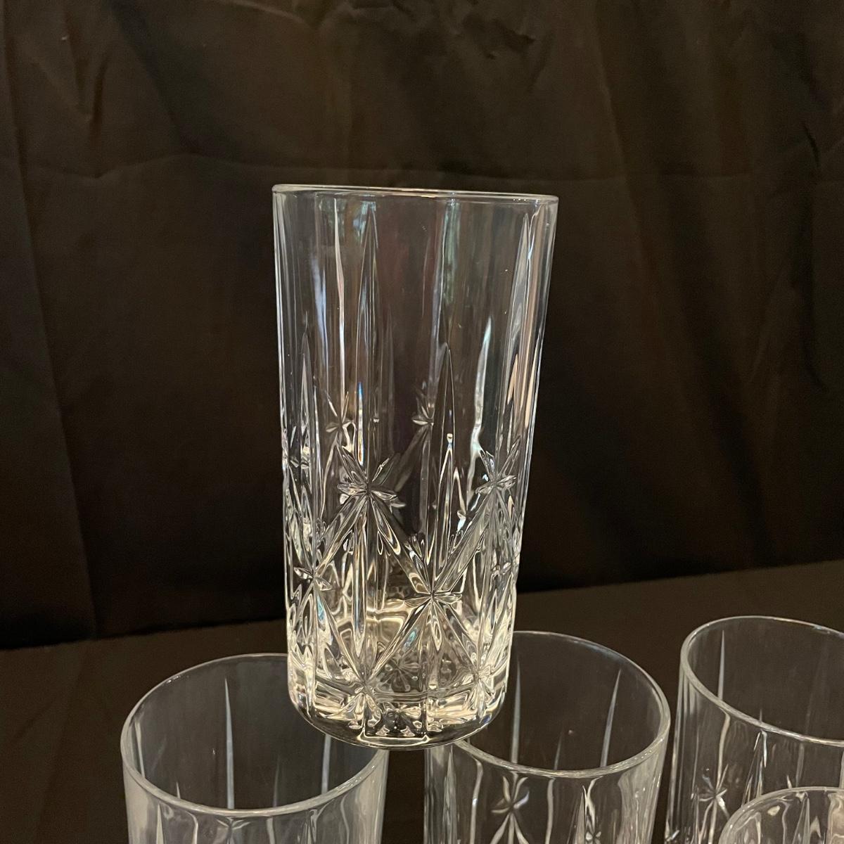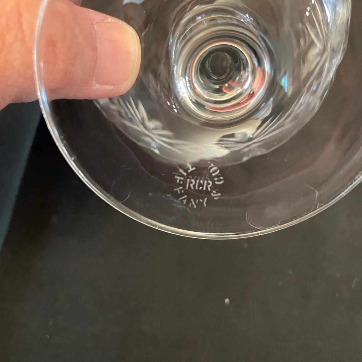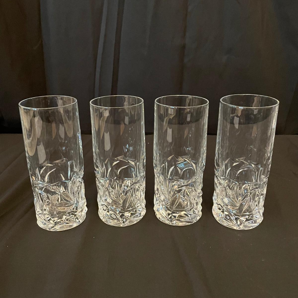 Two high-end brands for this barware collection. Two snifters and four tumblers are Tiffany & Co. Waterford marks are found on two snifters, both flutes and eight tumblers. The set of eight is marked Marquis by Waterford. The flutes are the tallest, both are 9.25”H. Shipping available.