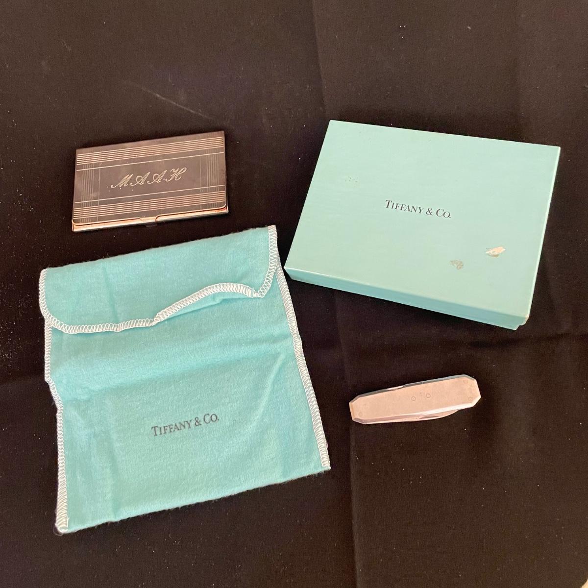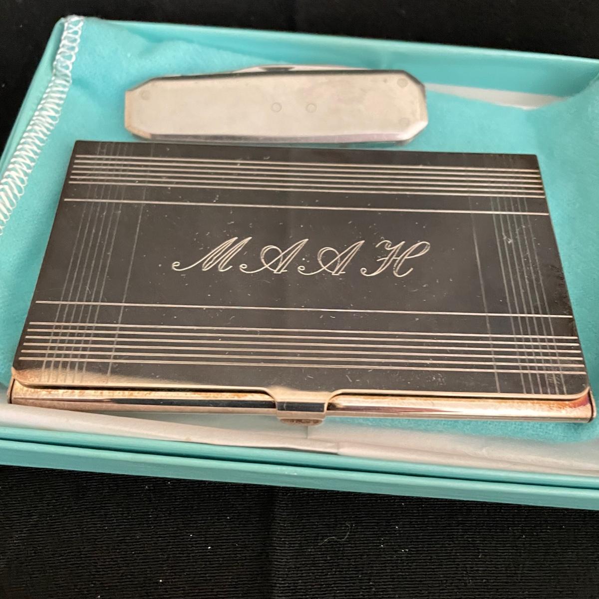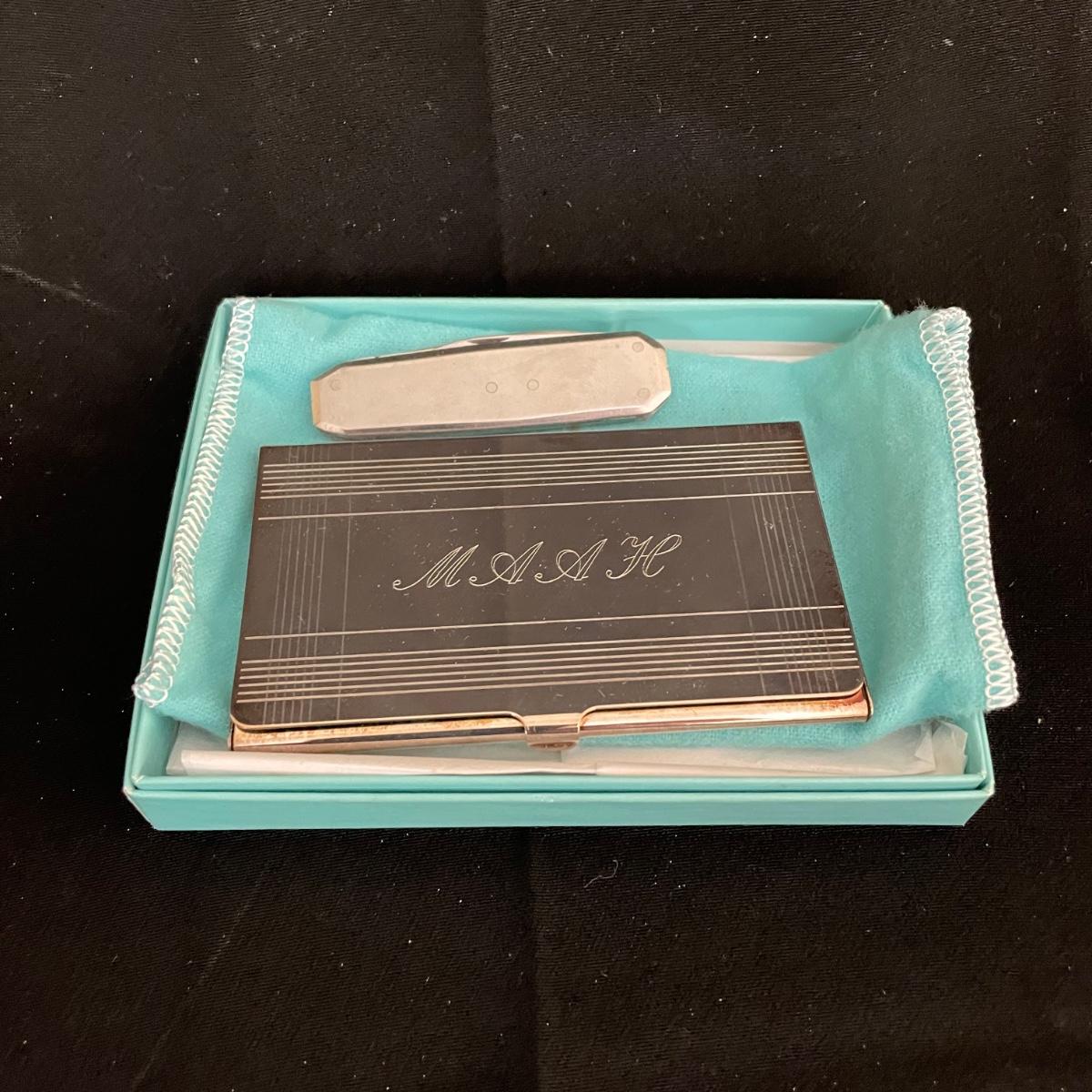 Engraved Tiffany & Co business card case with bag and box. Lot also includes a 2.5” stainless pocket knife. See images. Shipping available.