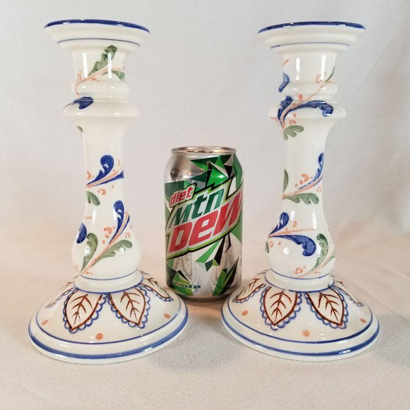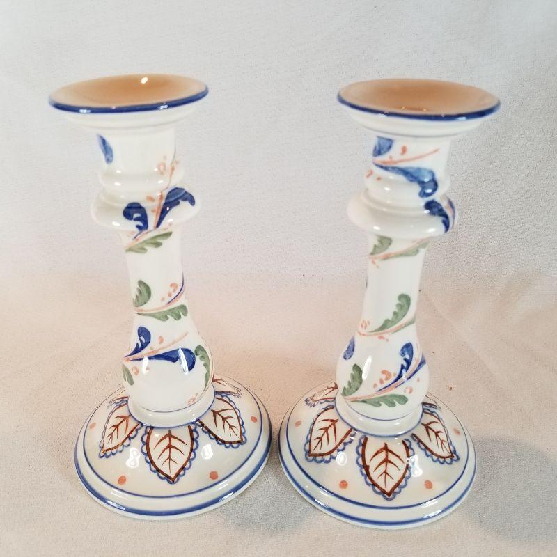 Tiffany Ceramic Candlestick Holders. Pair of floral ceramic candlestick holders by Tiffany and Co. 8-1/4-inches tall. There is a small glaze hairline crack at the mouth of the candle hole, most likely caused by burning candle too low, on one of the holders. Overall very good condition.