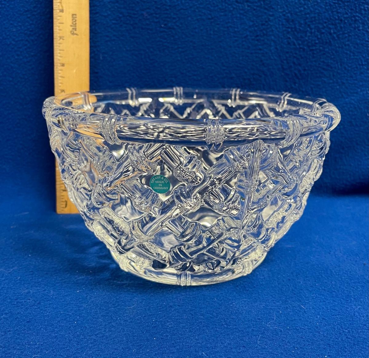 Tiffany & Co. Crystal Glass Bamboo Lattice Design Bowl 9". In Original Blue Tiffany Box. Bowl has sticker still attached and is marked. Bowl is in very good condition; box has some wear.