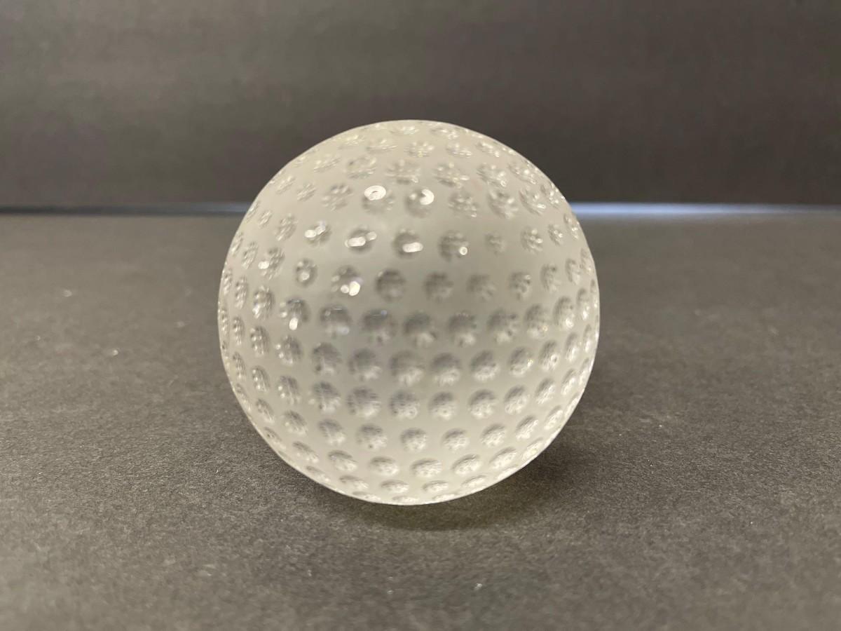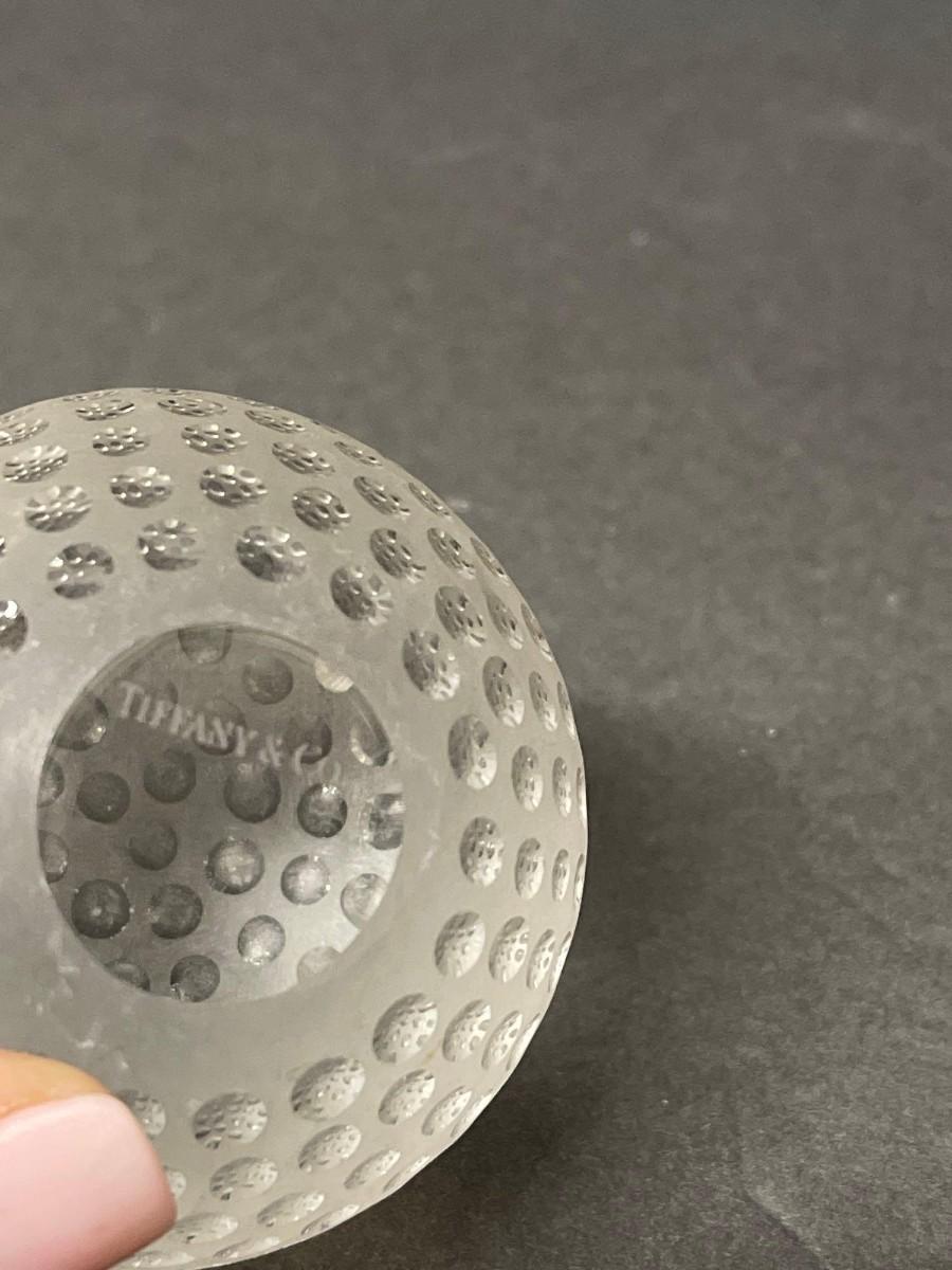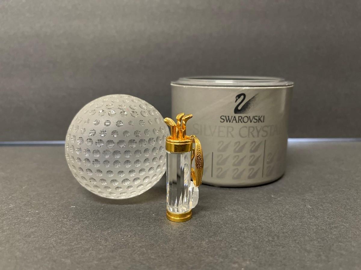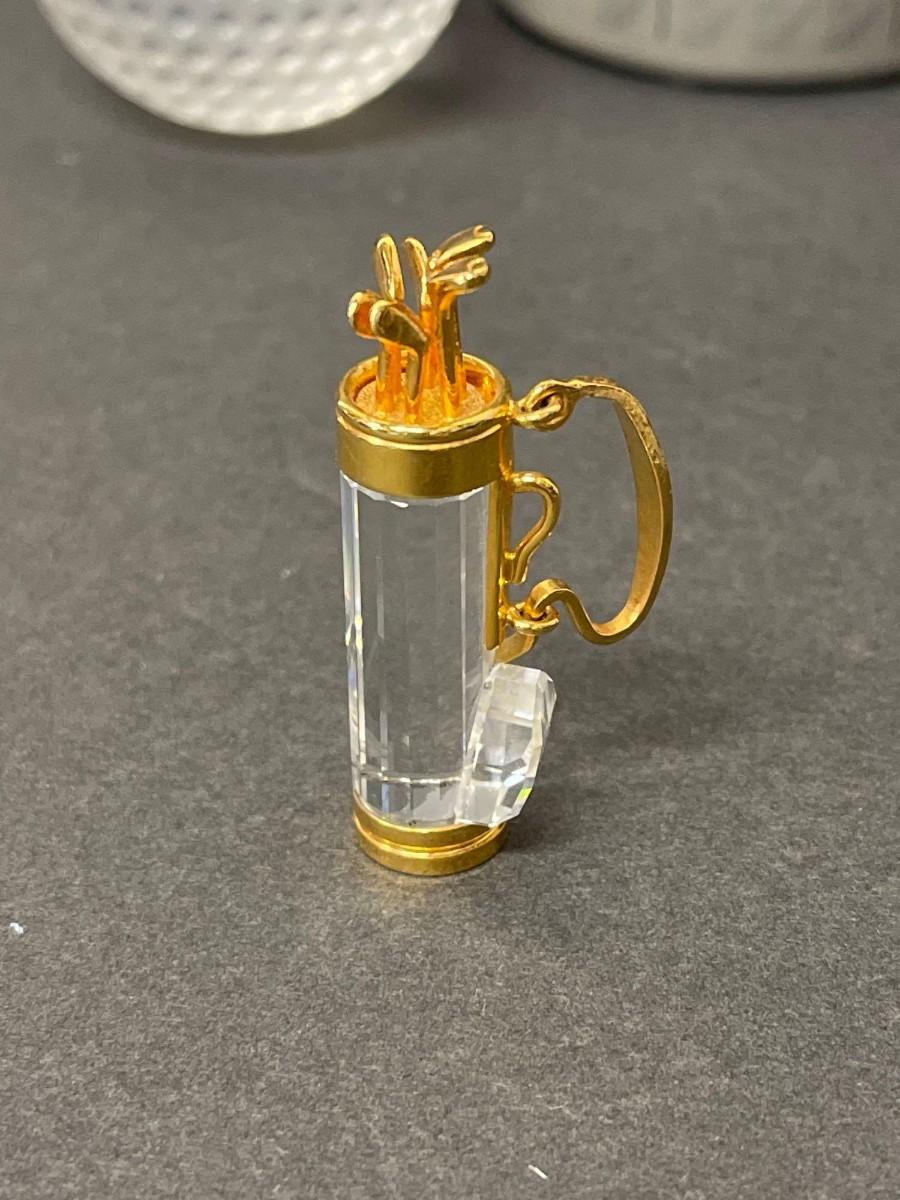 TIFFANY and Company, Crystal golf ball, excellent condition with minor scratches on the bottom. Marked Tiffany & Co. 2 1/4”. Does not come in original box.Swaroski Crystal golf bag with gold tone clubs. Excellent condition. 2”. In original box.