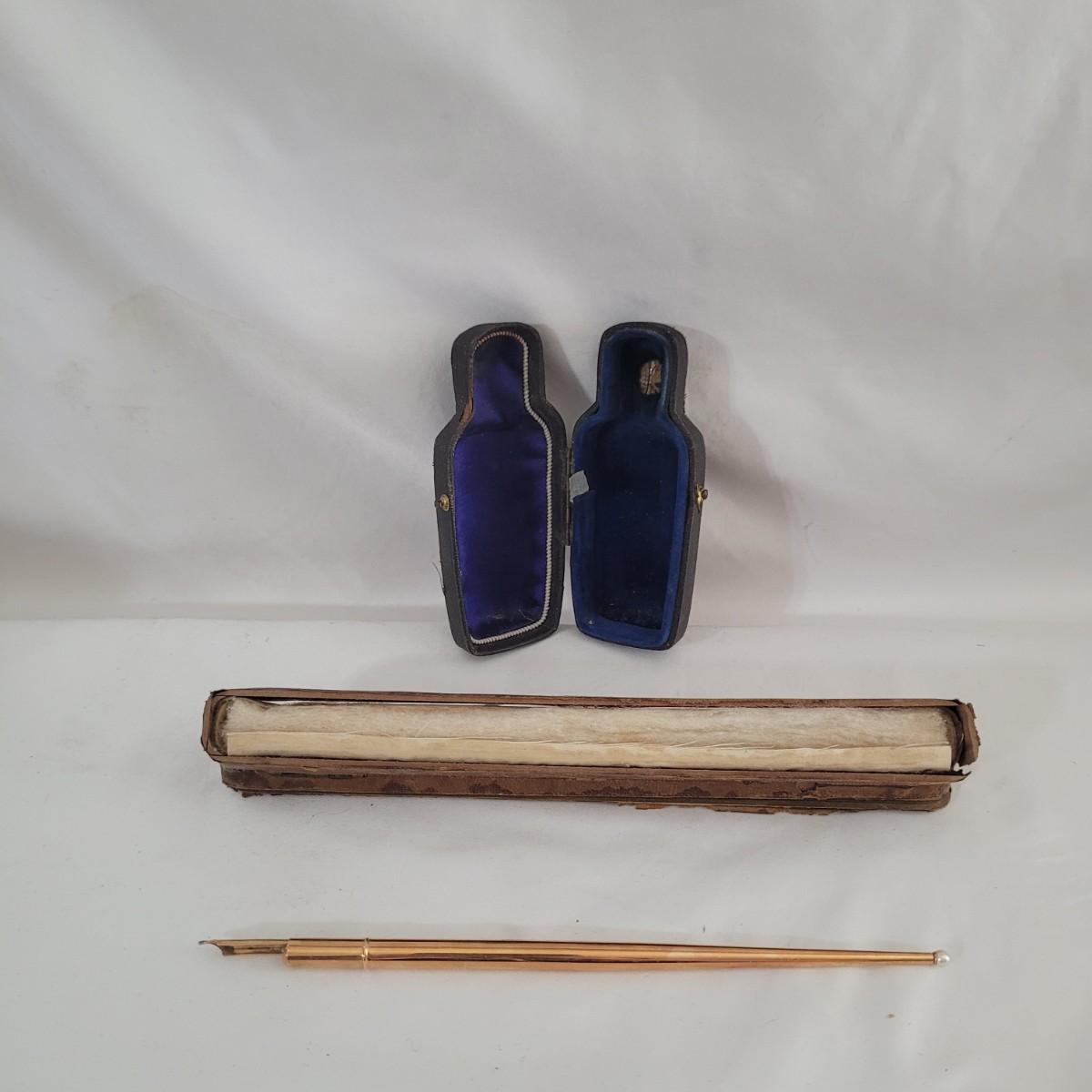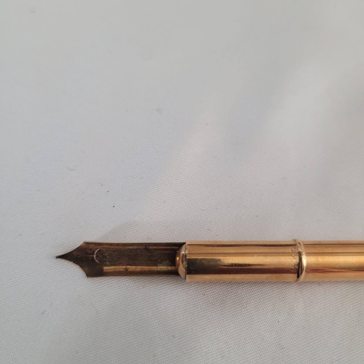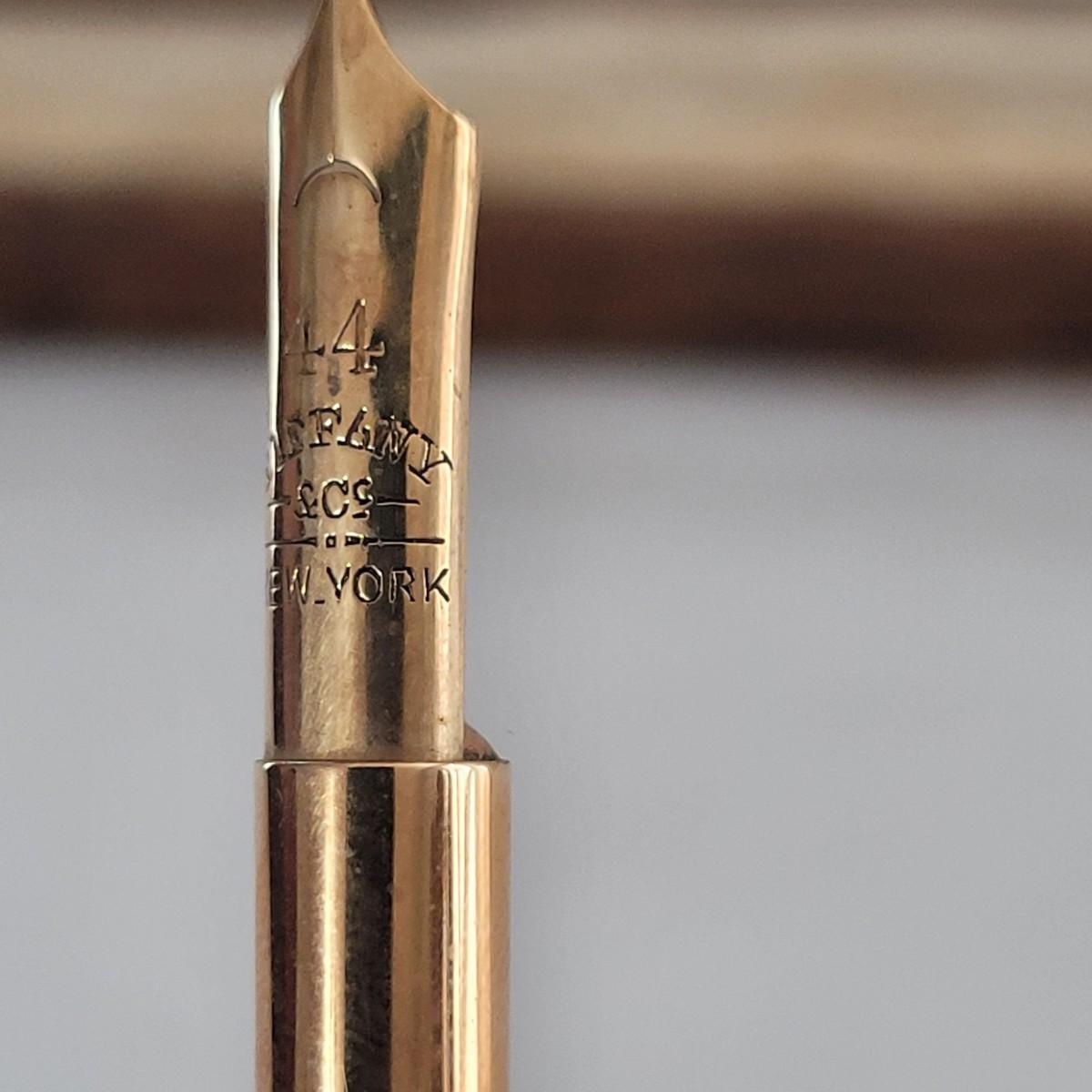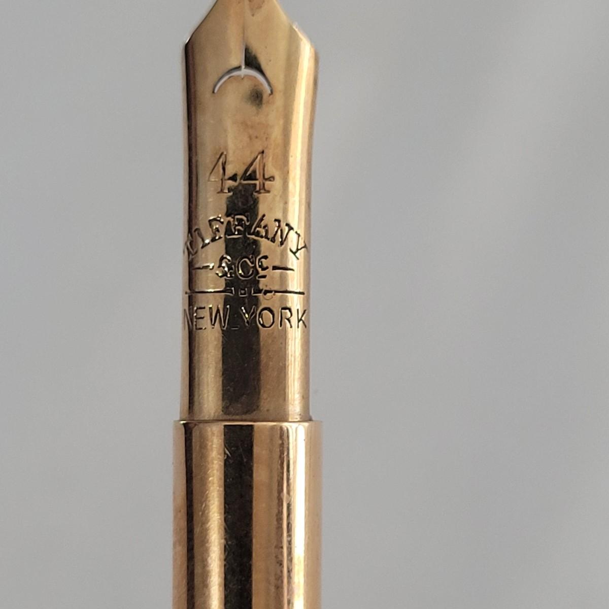 This classic Tiffany & Co. 44 fountain pen comes with the original case that has not stayed in tact, as well as an ink bottle case. Pen measures approximately 7.5”L. Shipping available.