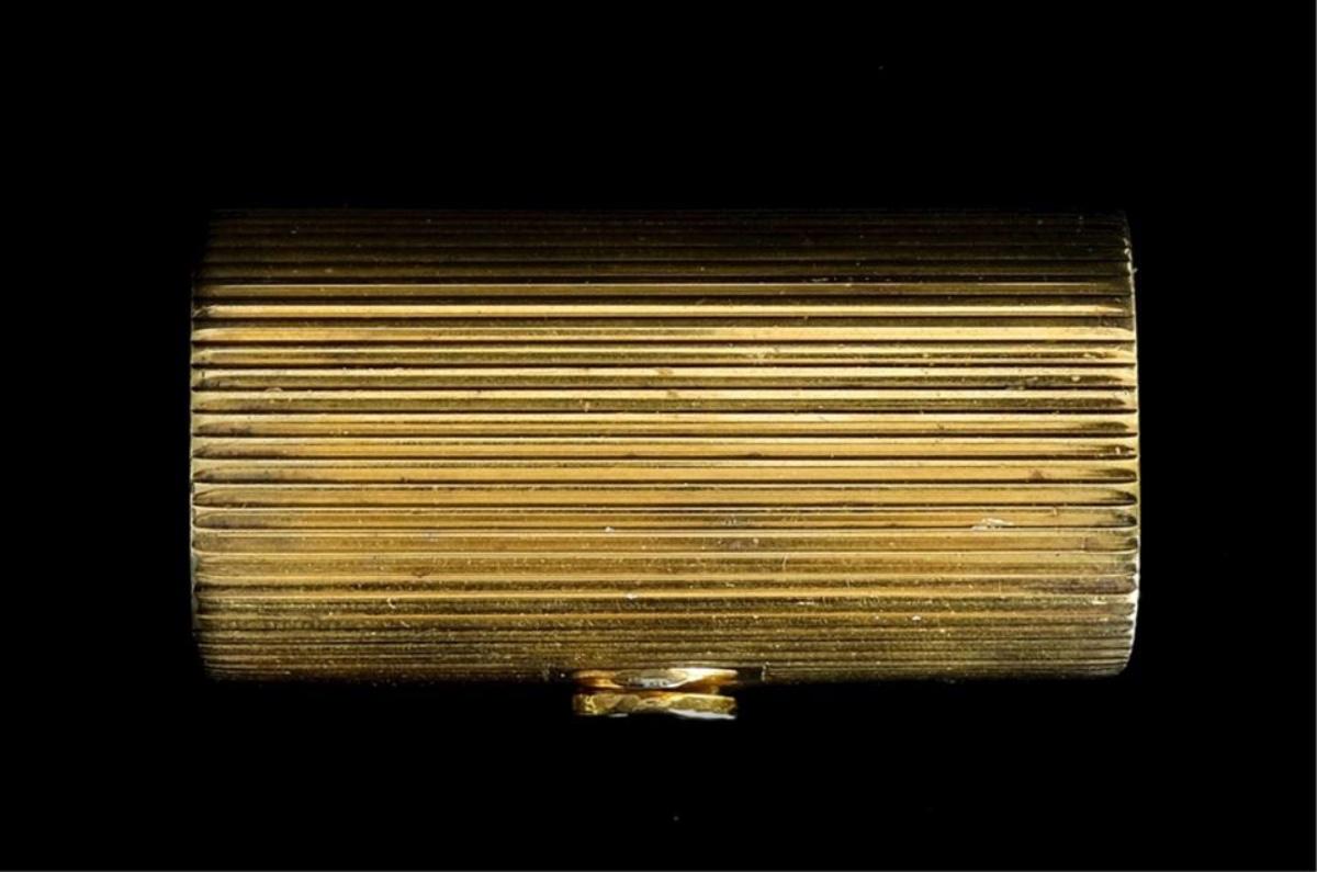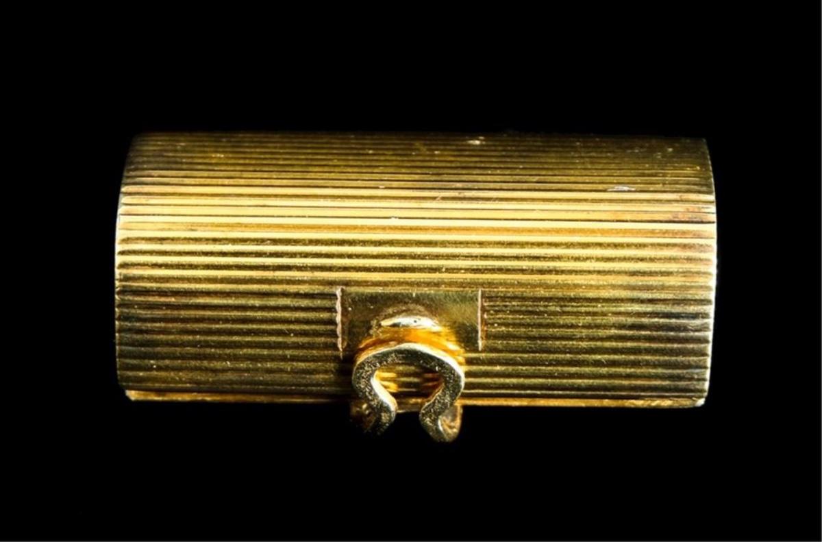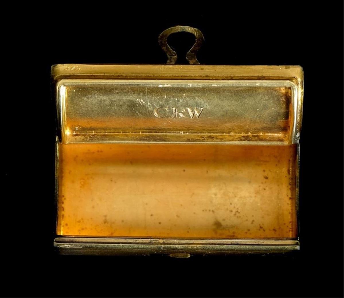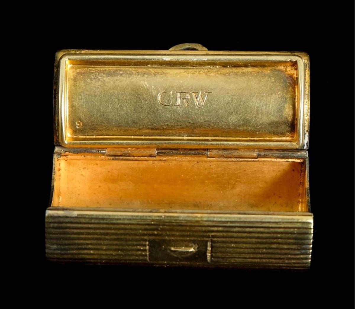 Unusual Tiffany & Co gold vermeil over sterling silver hinged box. Interior lid monogrammed CRW. Lid rim stamped 925 TIFFANY & CO. Approx. .62" x 1.87" x 1". Approx. weight 30.6 grams.