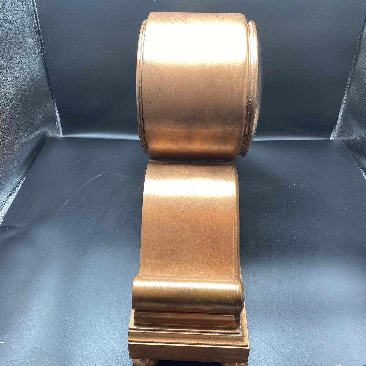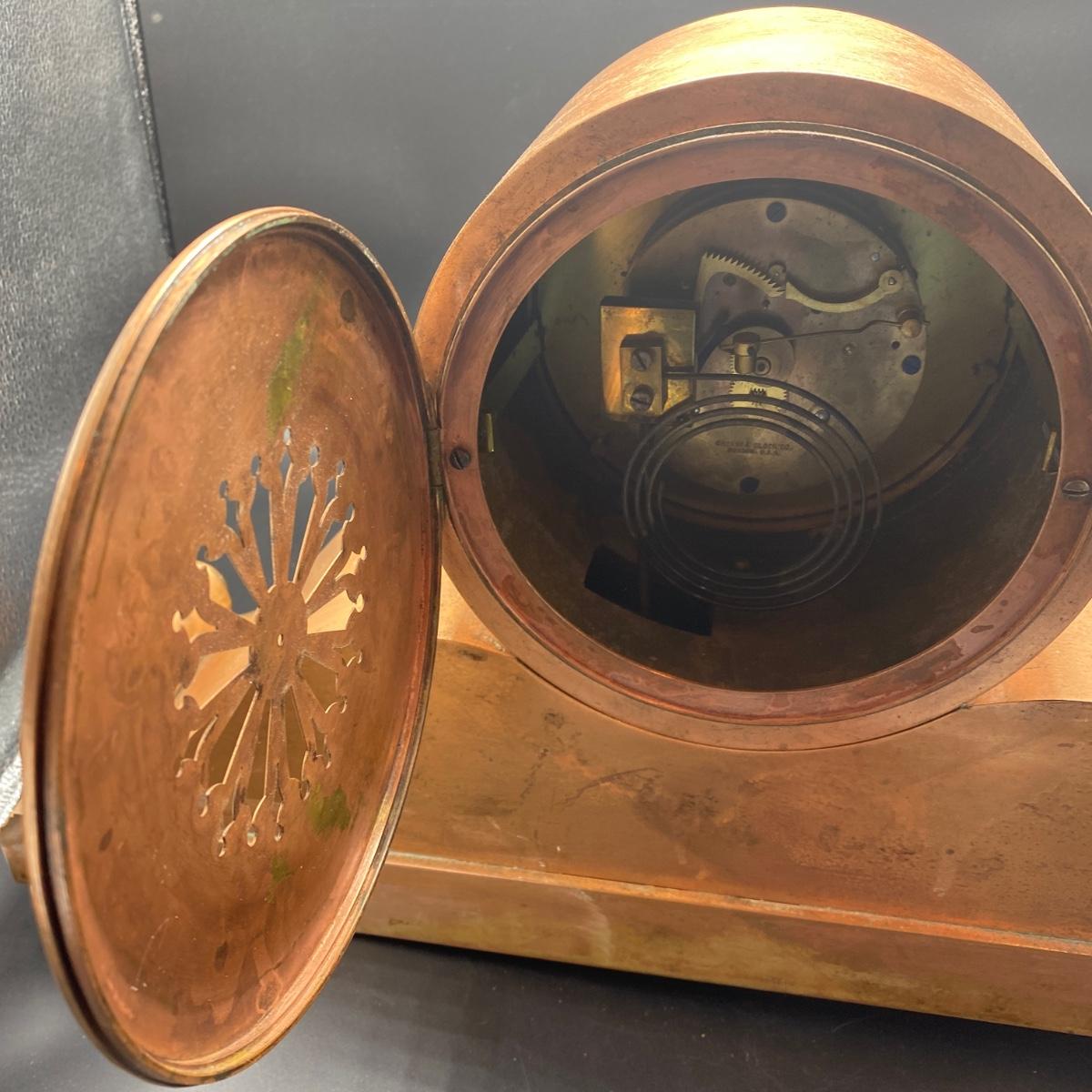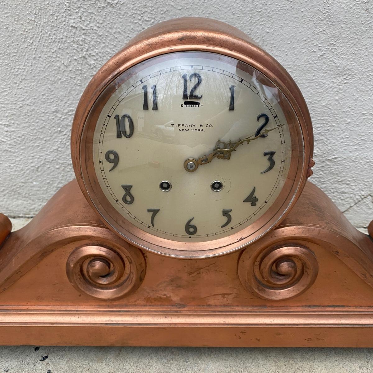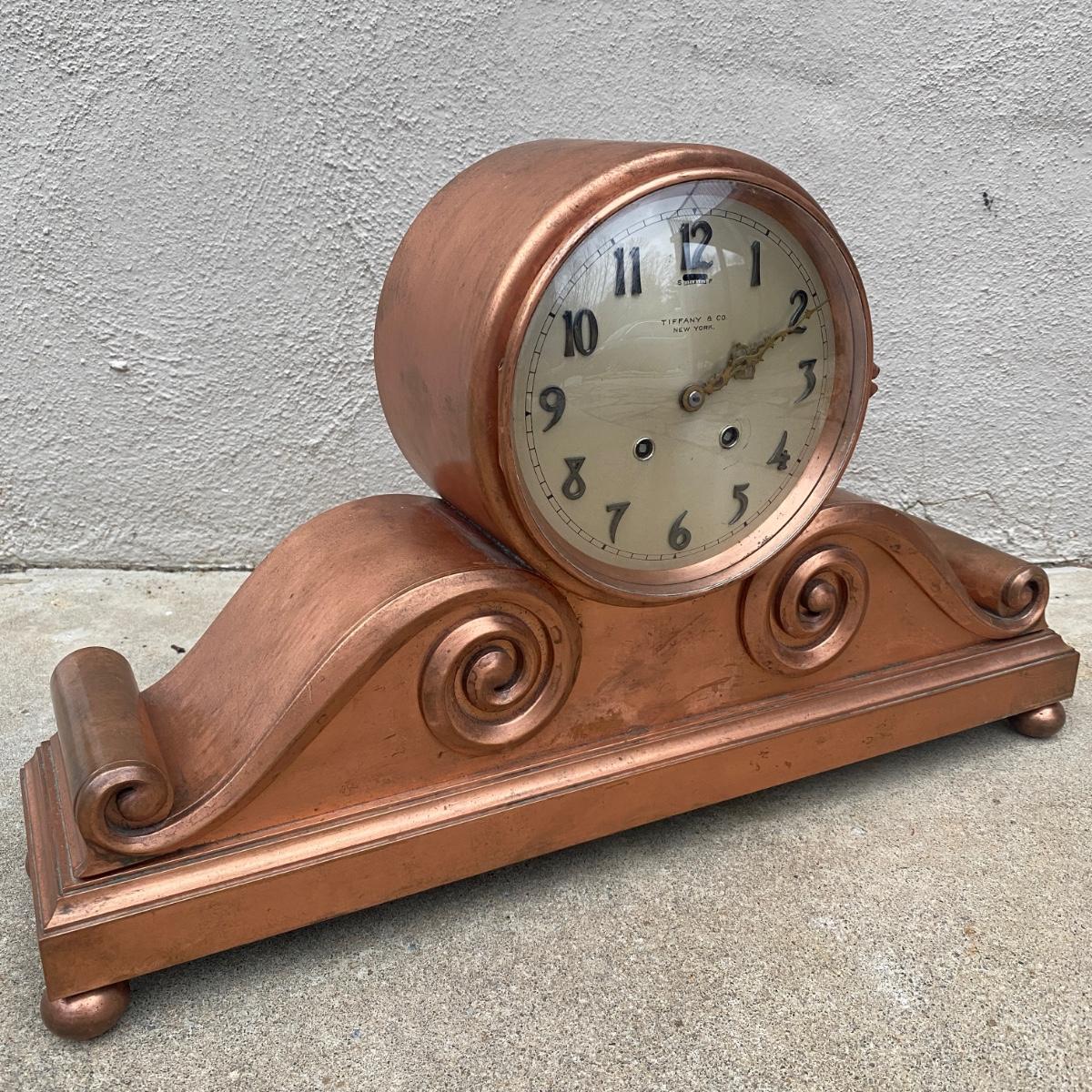 Tiffany & Co. cast brass mantle clock. Very heavy. Drum head tambour #3 style. Made by Chelsea Clock Co in Boston originally retailed by Tiffany & Co. Comes with key and is in working order. Lovely chime. This can be shipped but be aware it is very heavy. It has a copper look to the finish on the outside but it is brass. Measures 21” x 5” by 12” tall. Call UPS for quote 828-252-6930