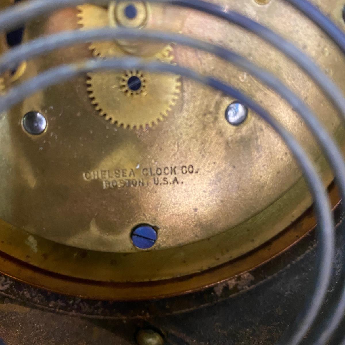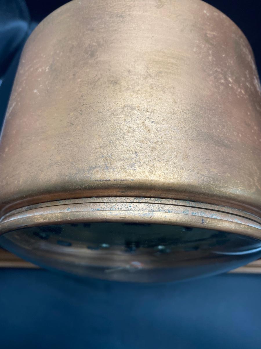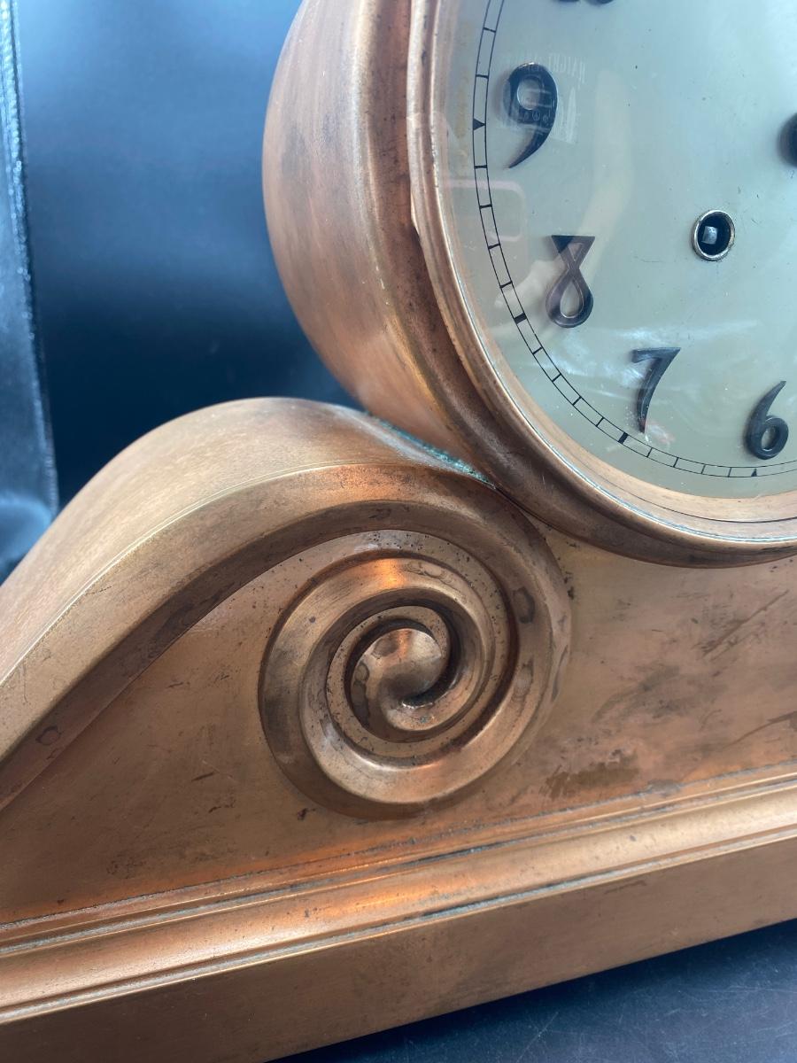 Tiffany & Co. cast brass mantle clock. Very heavy. Drum head tambour #3 style. Made by Chelsea Clock Co in Boston originally retailed by Tiffany & Co. Comes with key and is in working order. Lovely chime. This can be shipped but be aware it is very heavy. It has a copper look to the finish on the outside but it is brass. Measures 21” x 5” by 12” tall. Call UPS for quote 828-252-6930