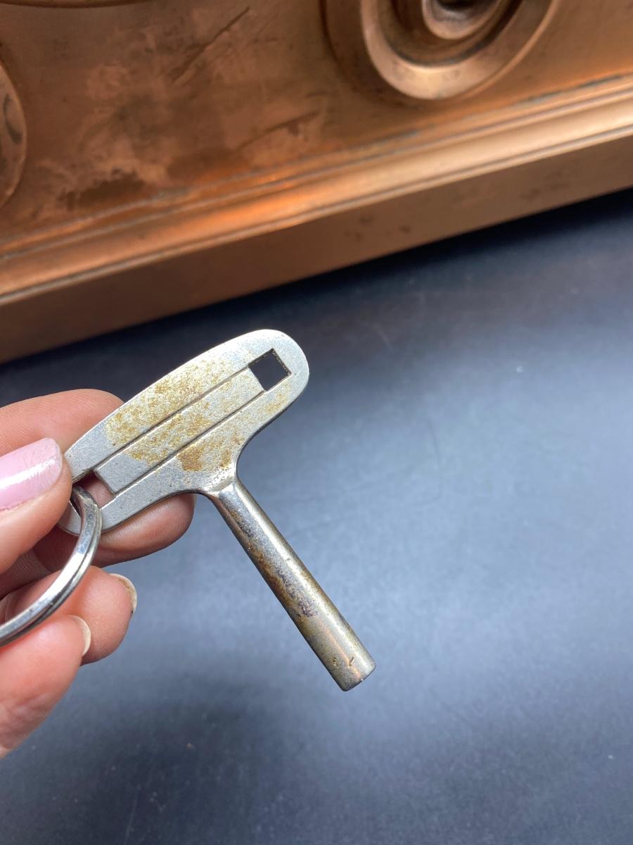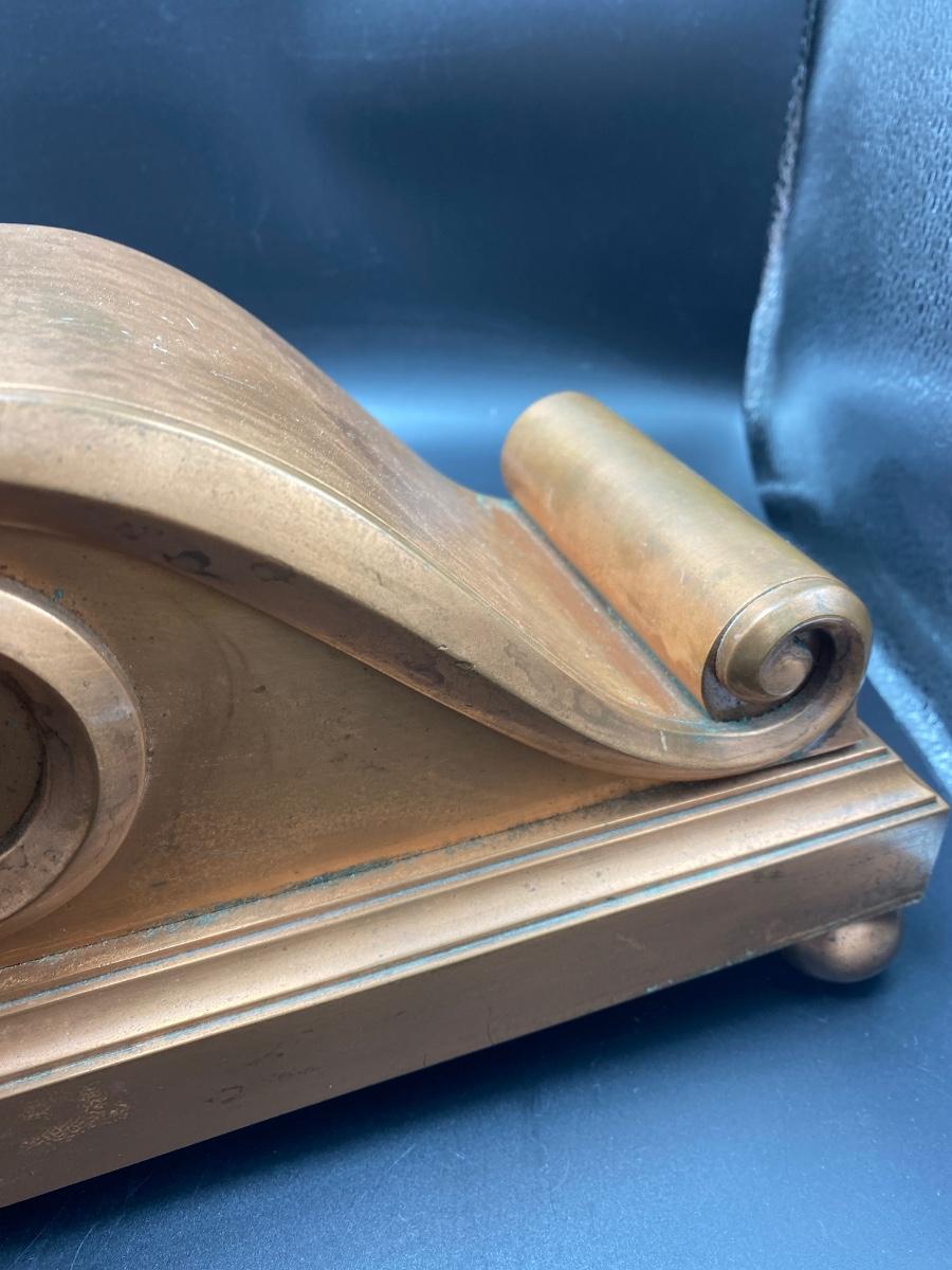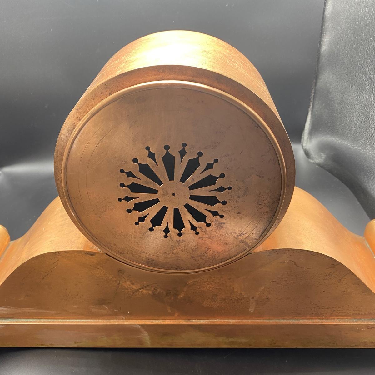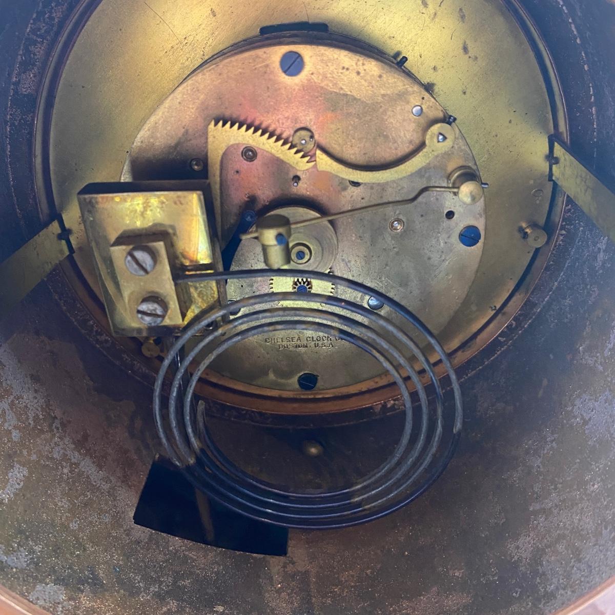 Tiffany & Co. cast brass mantle clock. Very heavy. Drum head tambour #3 style. Made by Chelsea Clock Co in Boston originally retailed by Tiffany & Co. Comes with key and is in working order. Lovely chime. This can be shipped but be aware it is very heavy. It has a copper look to the finish on the outside but it is brass. Measures 21” x 5” by 12” tall. Call UPS for quote 828-252-6930