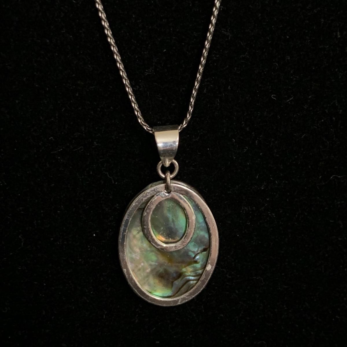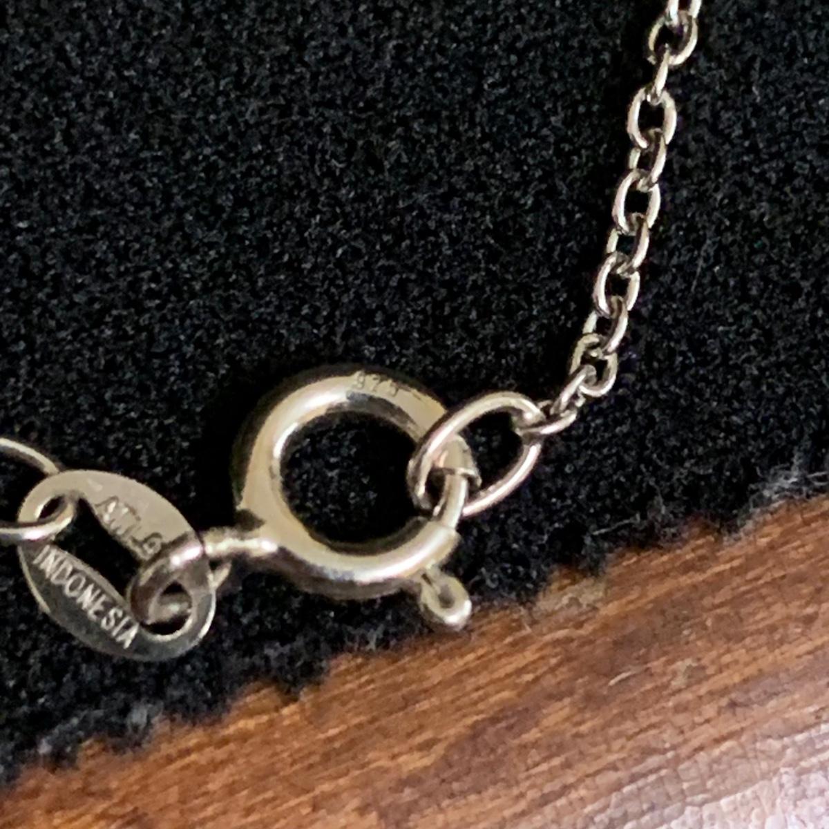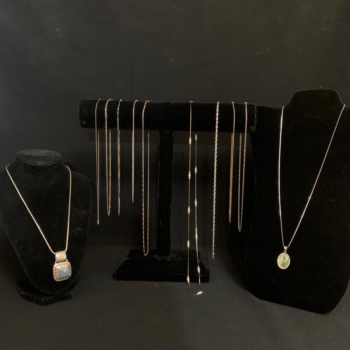 Eleven total necklaces in this collection, including three pendants. The necklace with the small teardrop shaped pendant is marked “Tiffany & Co.” & “Peretti”. The Tiffany chain is 18”. Six necklaces (including the Tiffany & Co.), as well as the two larger pendants, are marked Sterling/925. The gold-toned necklace chain is marked “1/20 12k GF”. The longest necklace, the gold-toned chain with the pearl-like beads, is 30“, and the shortest chain is 16“.