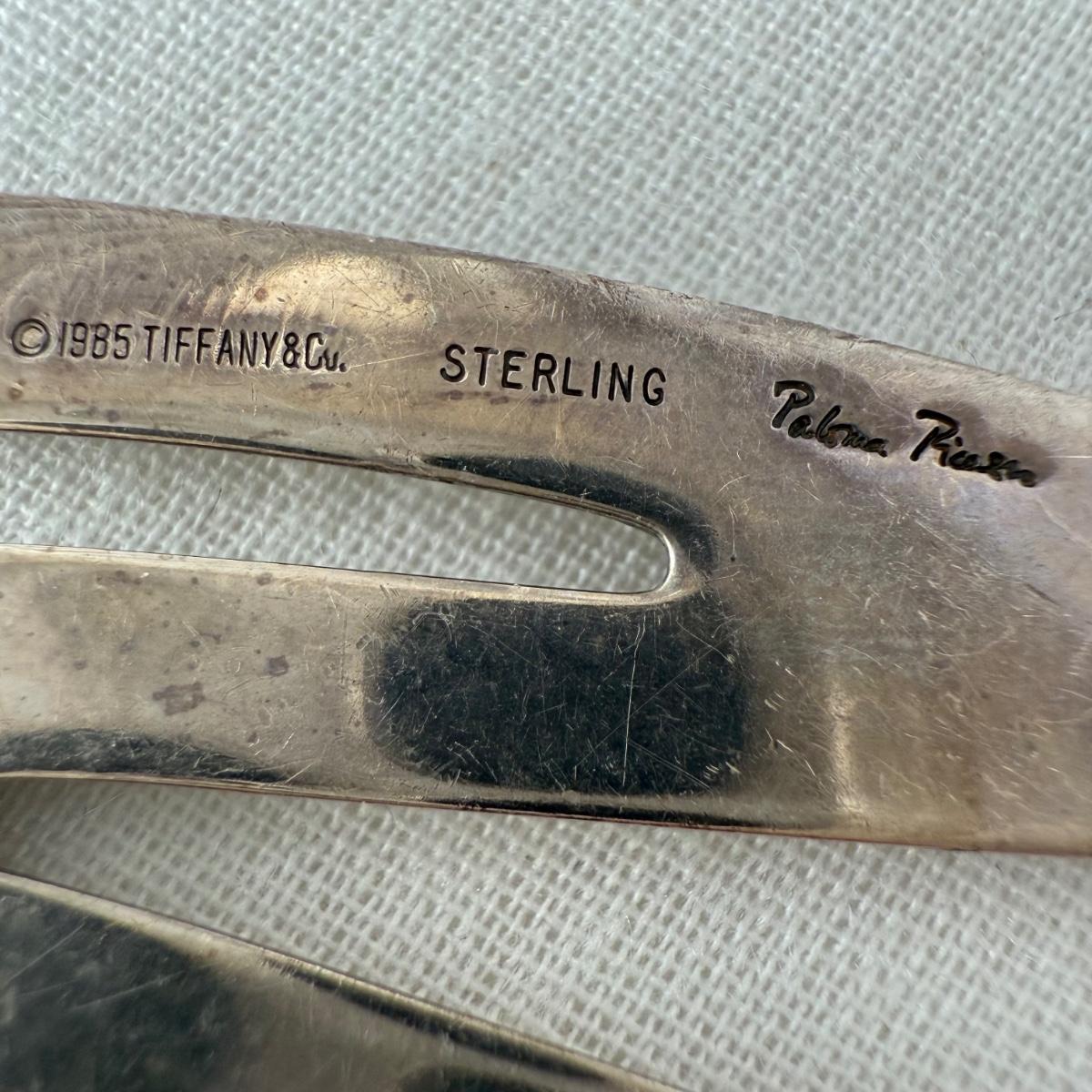 Tiffany & Co. Paloma Picasso zig zag brooch is stamped with Sterling and 1985. The brooch has some tarnishing. It measures approximately 2.5” x 2”. A Tiffany & Co. case is included, not likely original to this brooch.