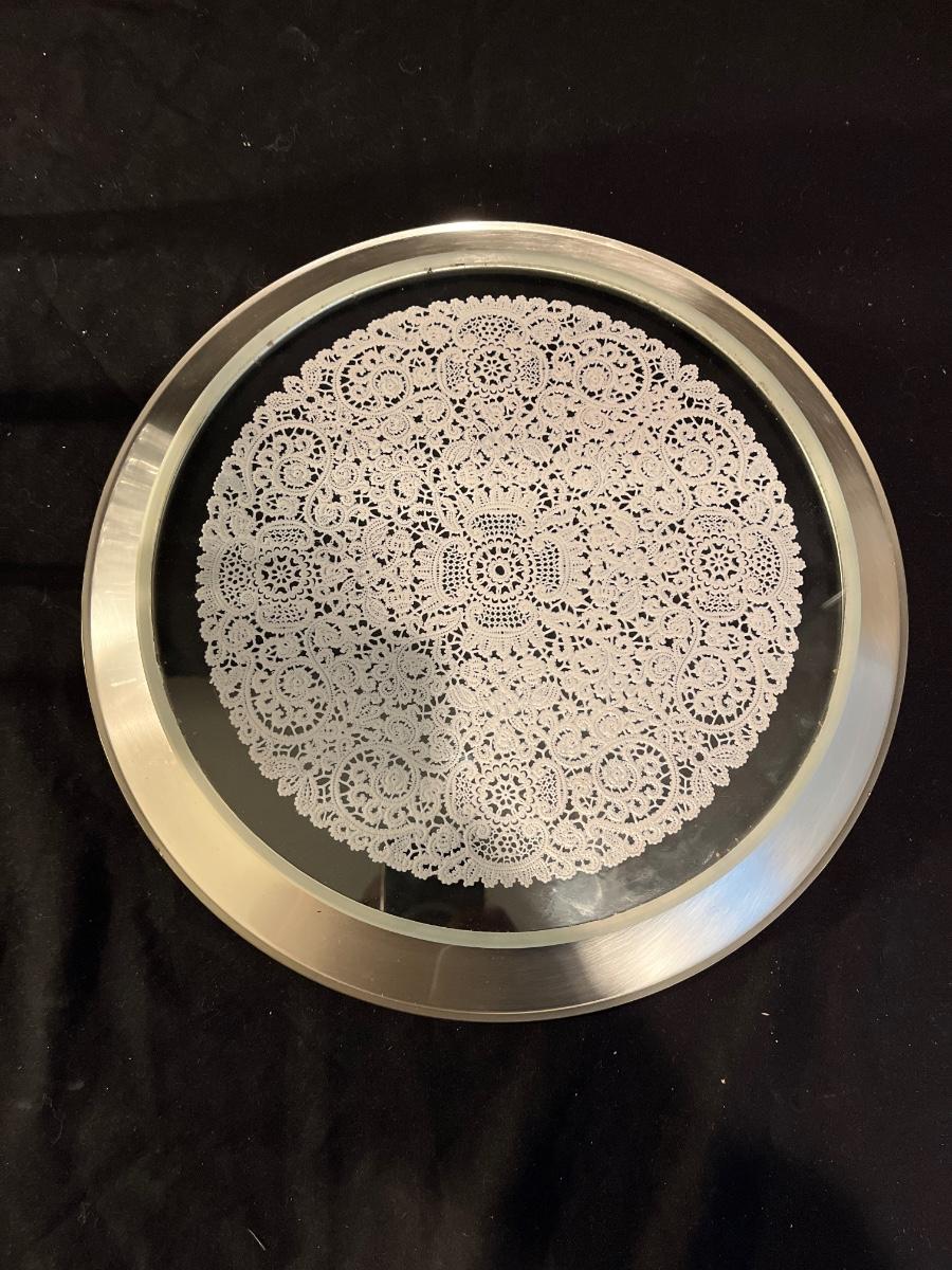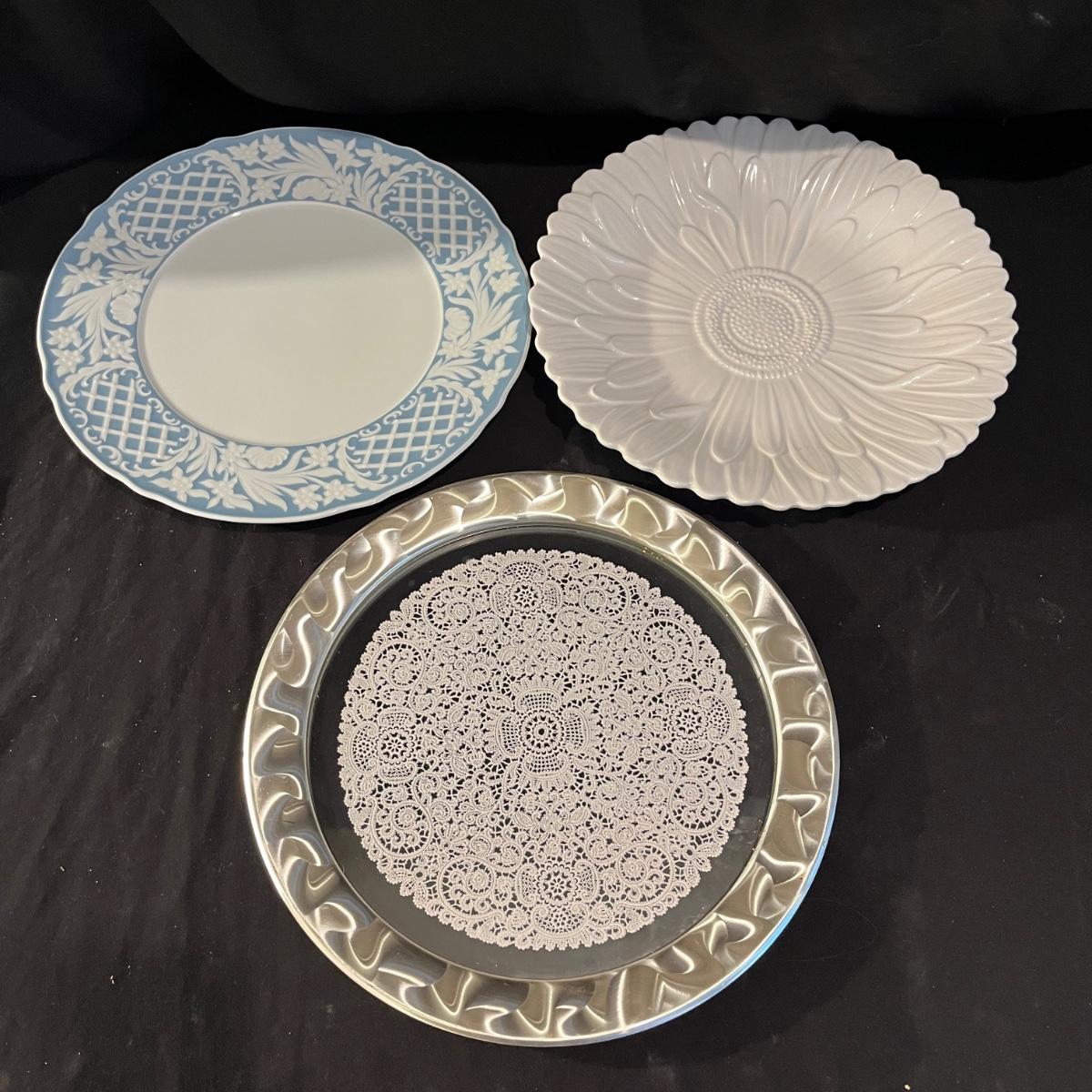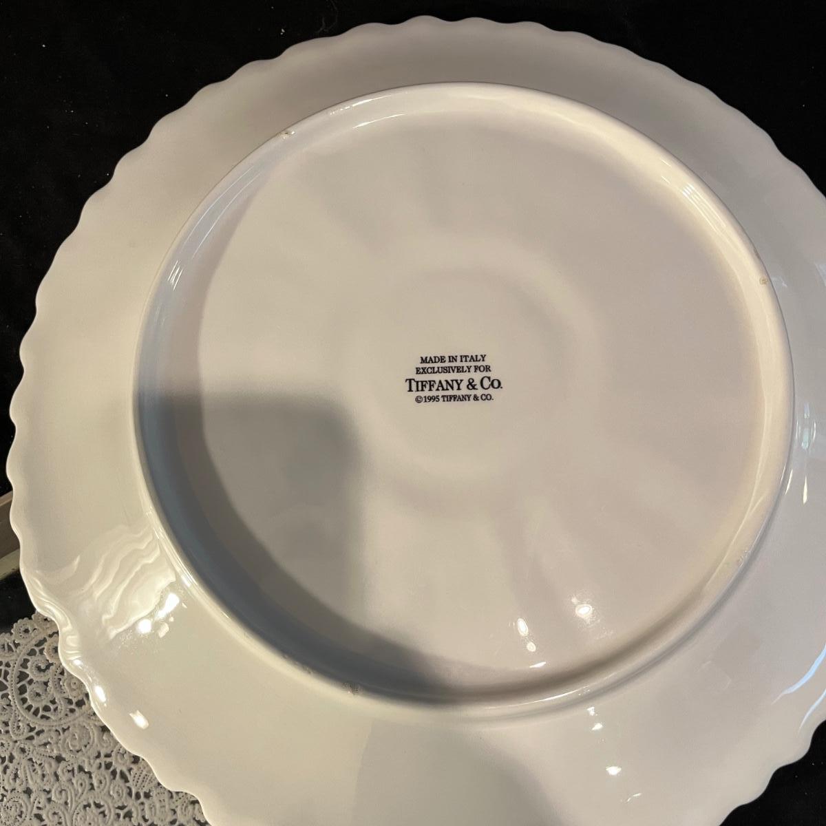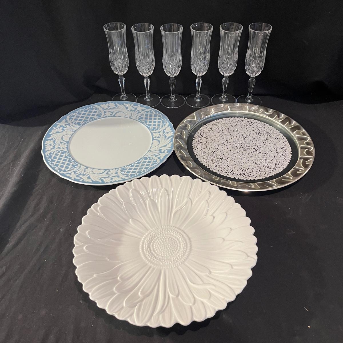 Lot includes a Tiffany & Co. sunflower platter, Oscar De La Renta serving platter, glass and metal cake plate and six glass champagne flutes. Tiffany platter measures 12”D.