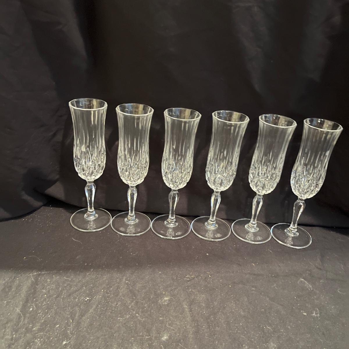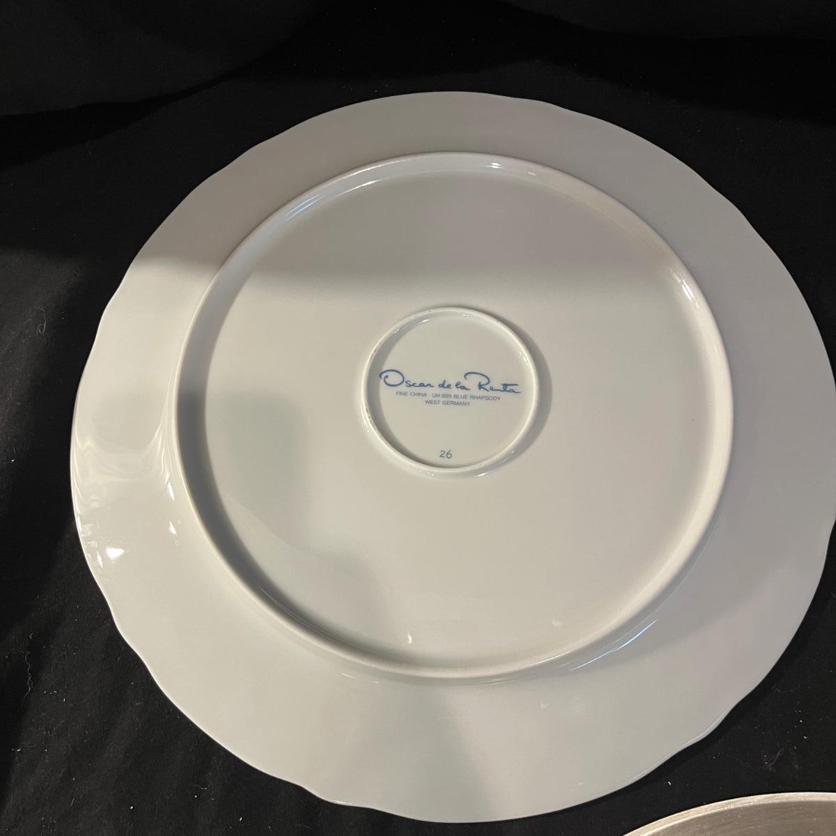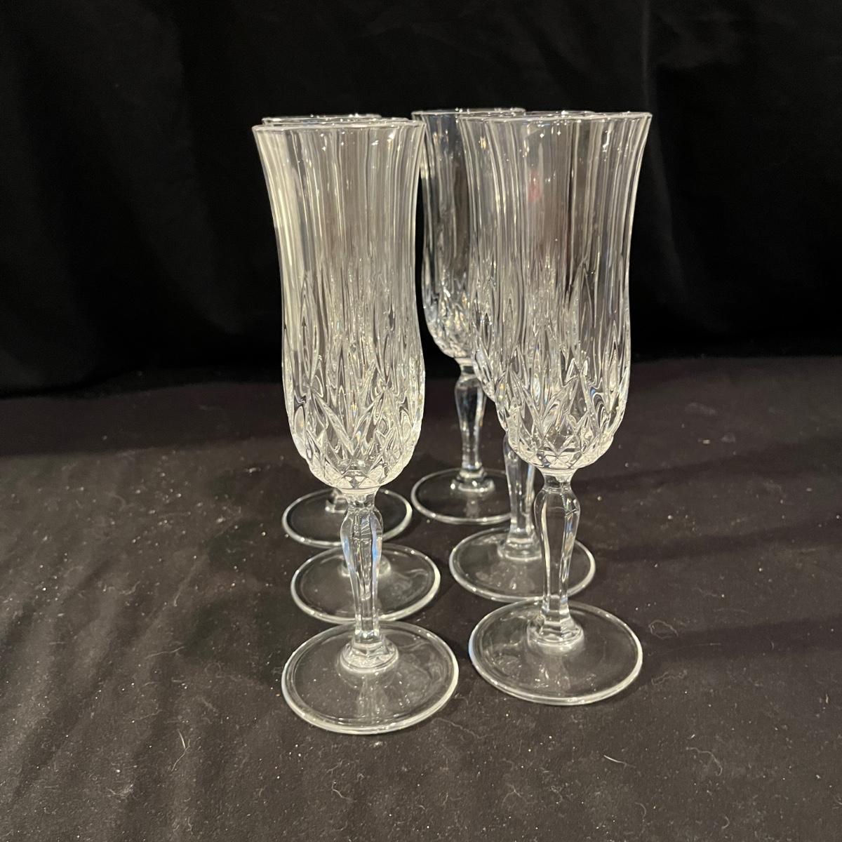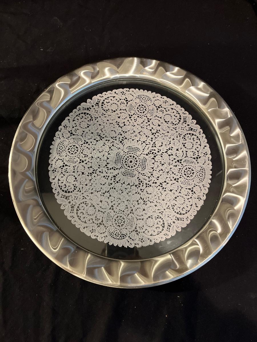 Lot includes a Tiffany & Co. sunflower platter, Oscar De La Renta serving platter, glass and metal cake plate and six glass champagne flutes. Tiffany platter measures 12”D.
