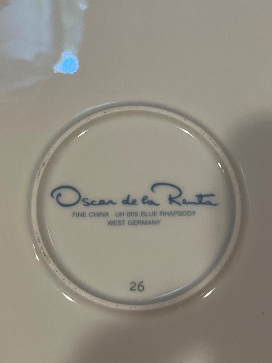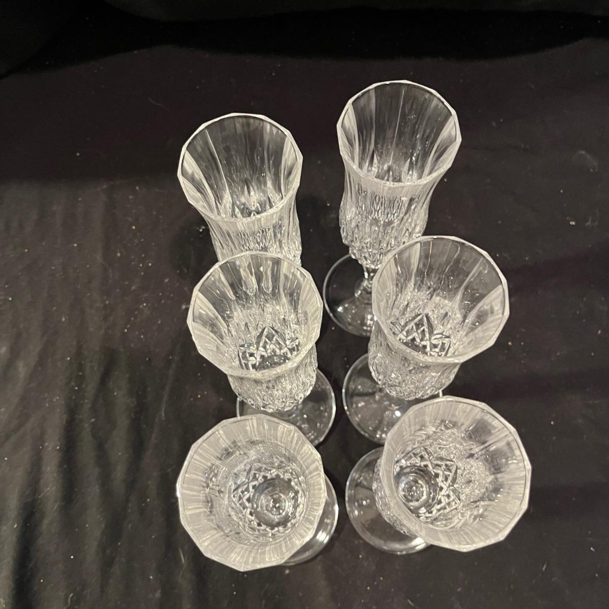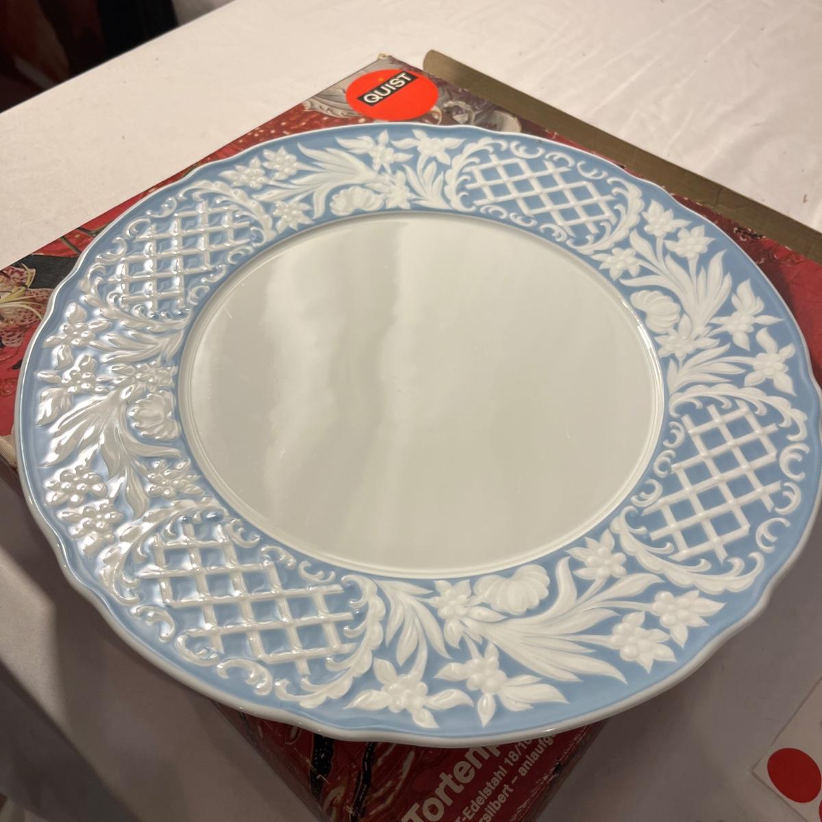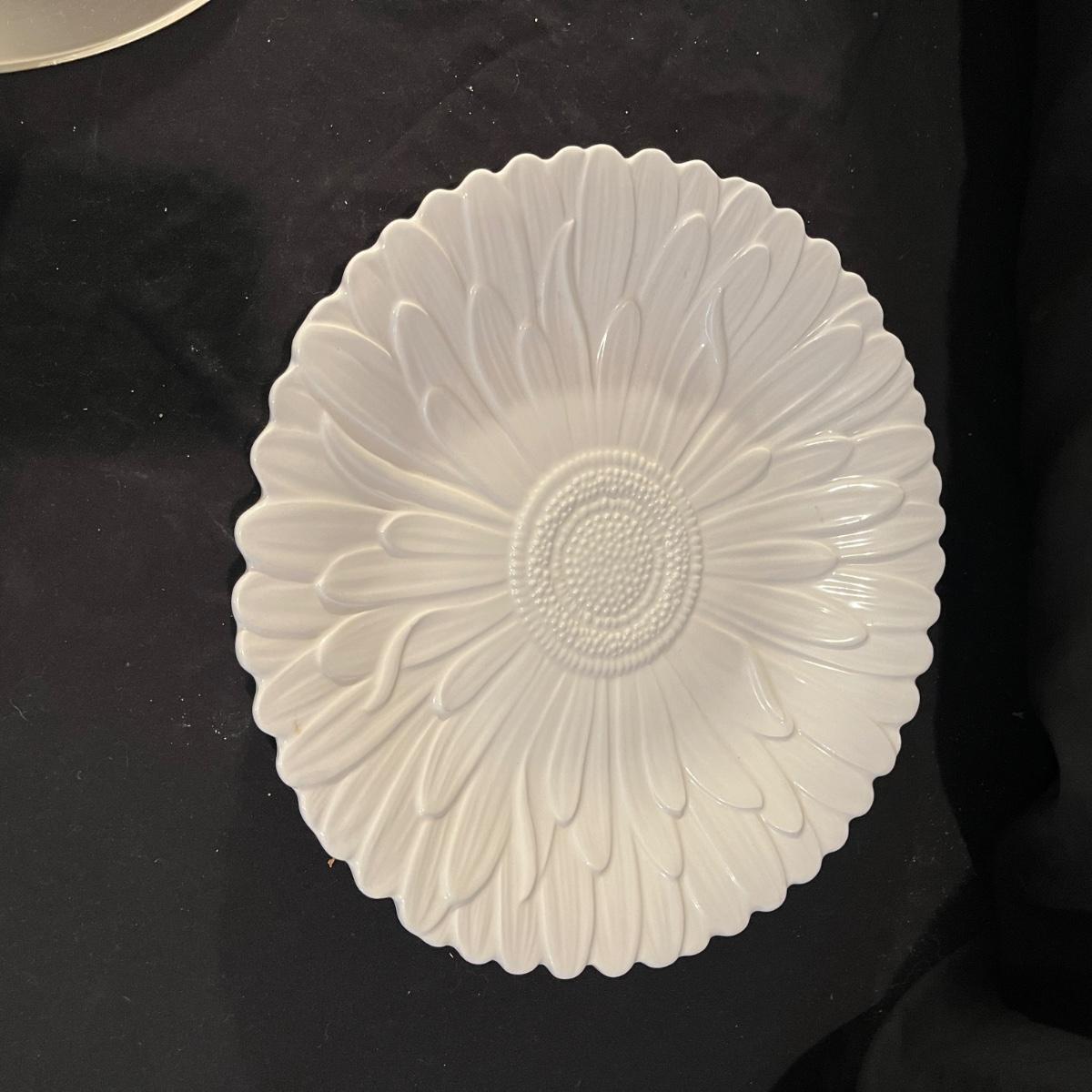 Lot includes a Tiffany & Co. sunflower platter, Oscar De La Renta serving platter, glass and metal cake plate and six glass champagne flutes. Tiffany platter measures 12”D.