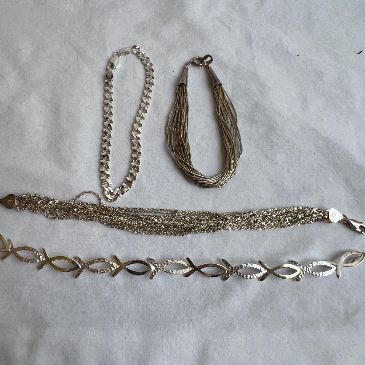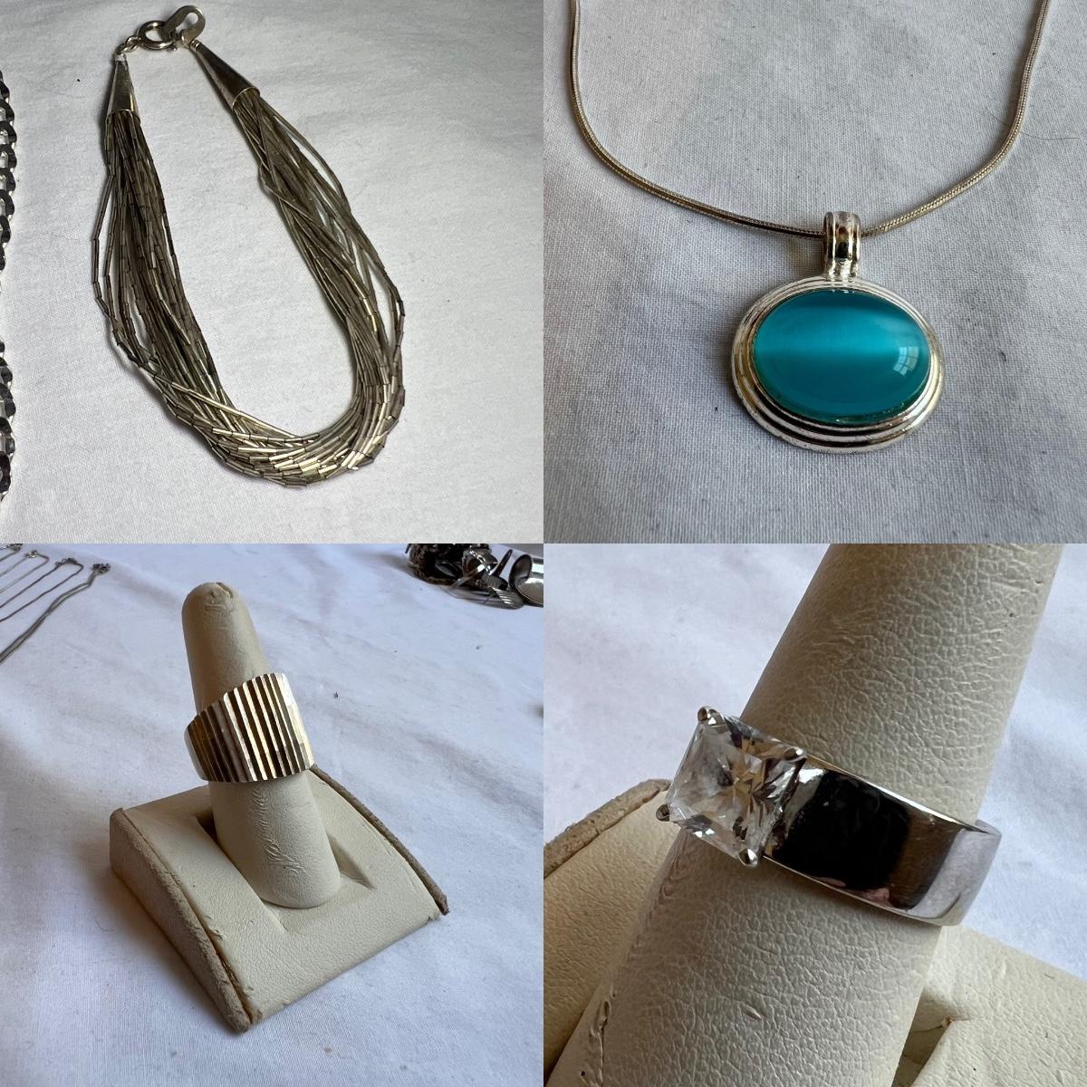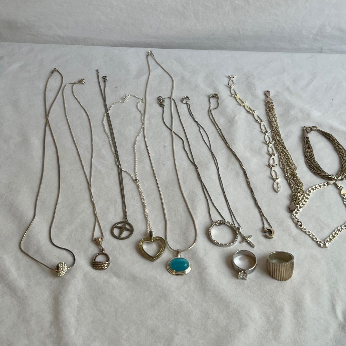 14 items all stamped 925/sterling. Eight necklaces, four bracelets and two rings. One necklace is marked Tiffany & Co. Three of the necklaces and one ring have simulated diamonds. Longest necklace has the blue stone and measures 23” long. All sales are final. No returns or refunds. Please bid accordingly.
