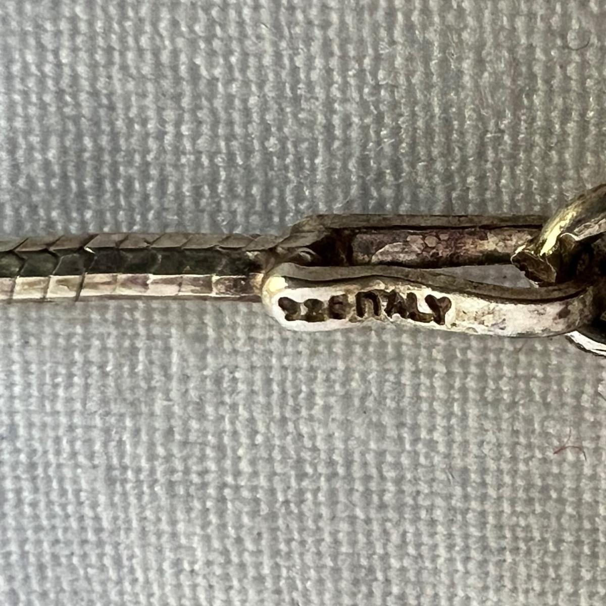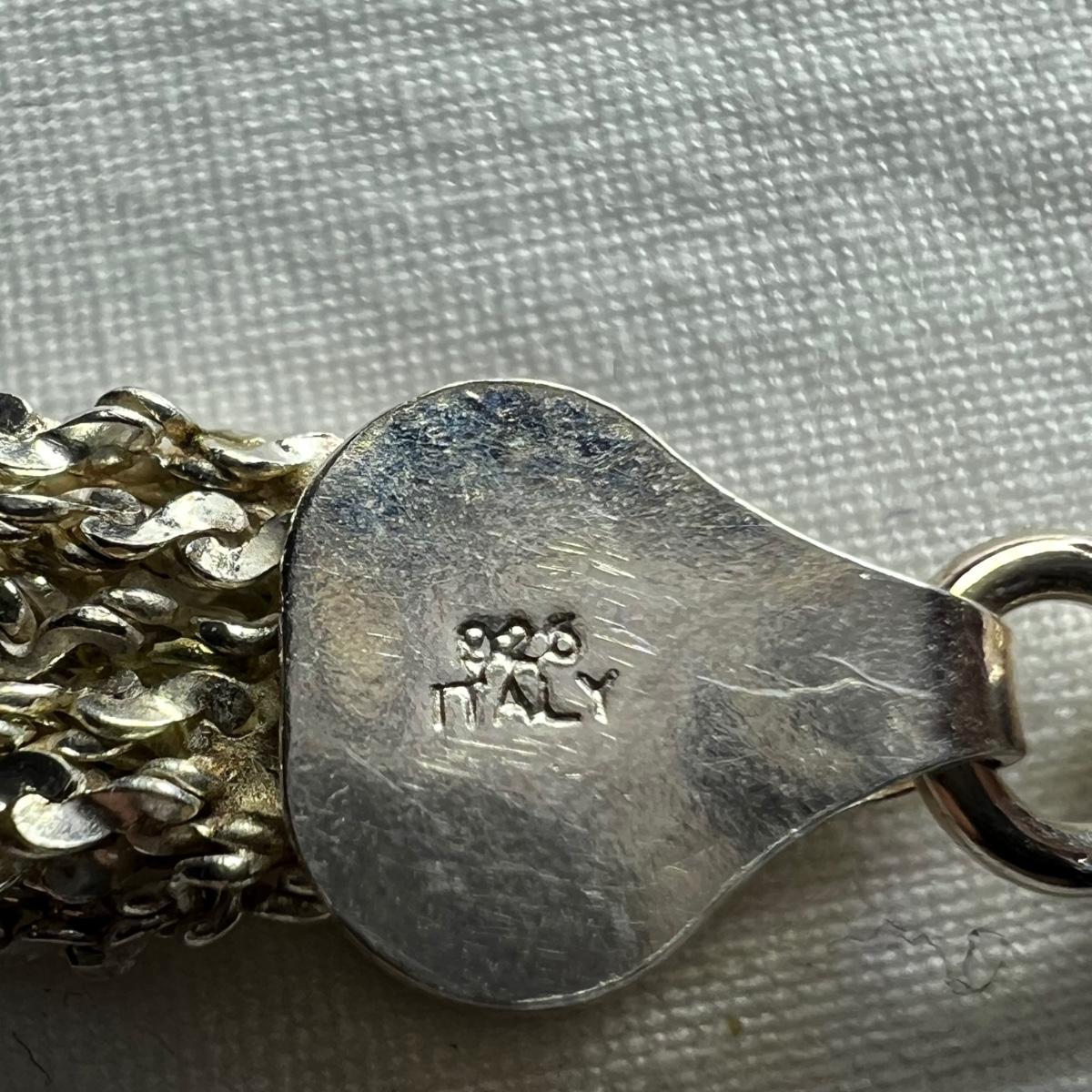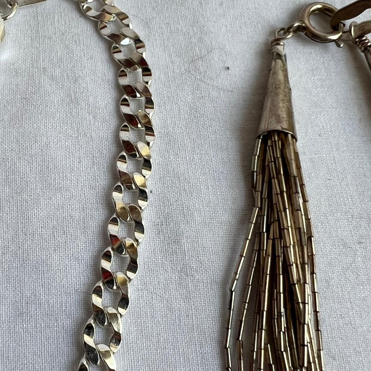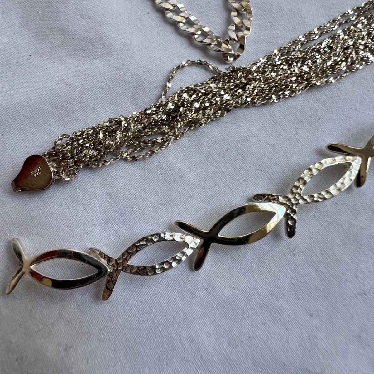 14 items all stamped 925/sterling. Eight necklaces, four bracelets and two rings. One necklace is marked Tiffany & Co. Three of the necklaces and one ring have simulated diamonds. Longest necklace has the blue stone and measures 23” long. All sales are final. No returns or refunds. Please bid accordingly.
