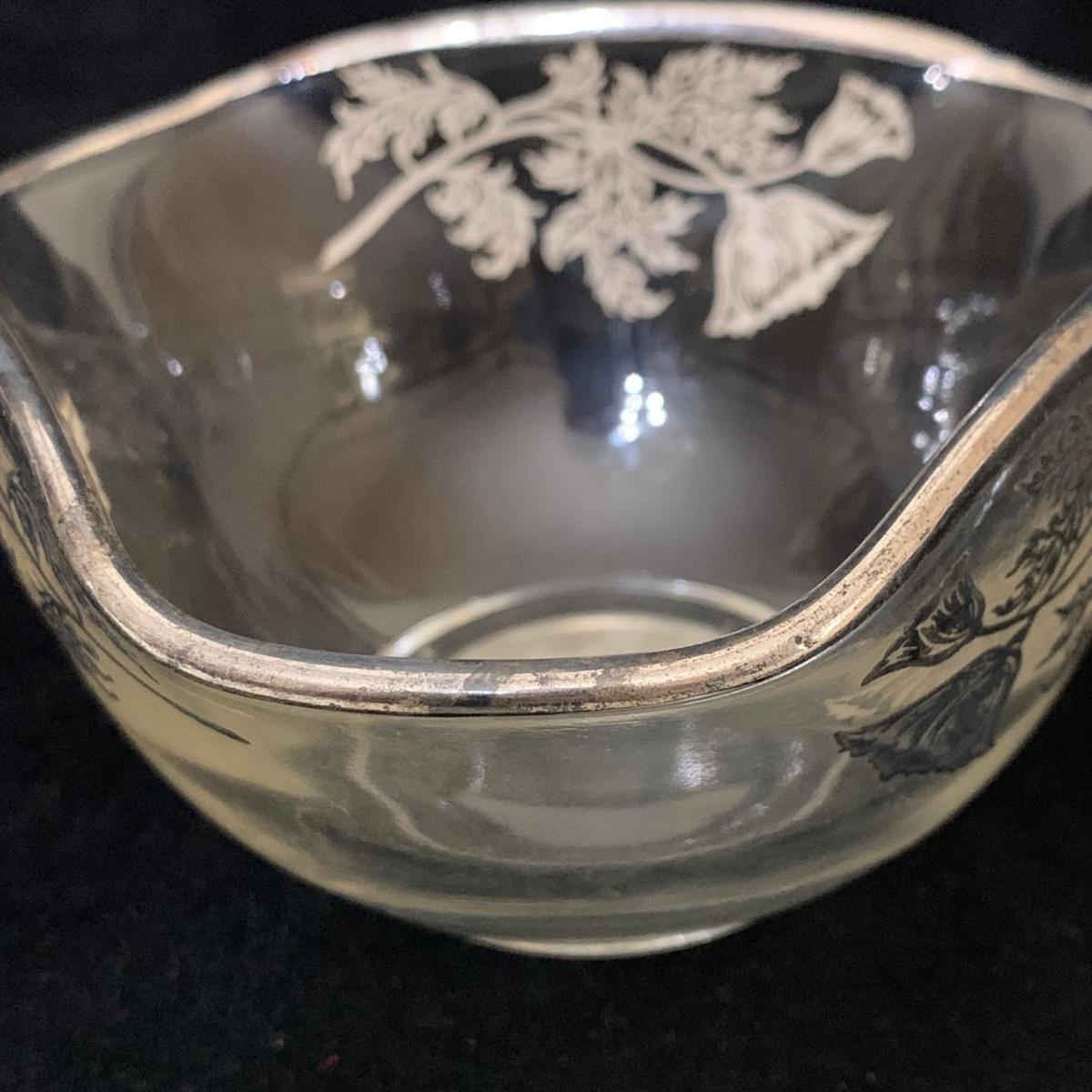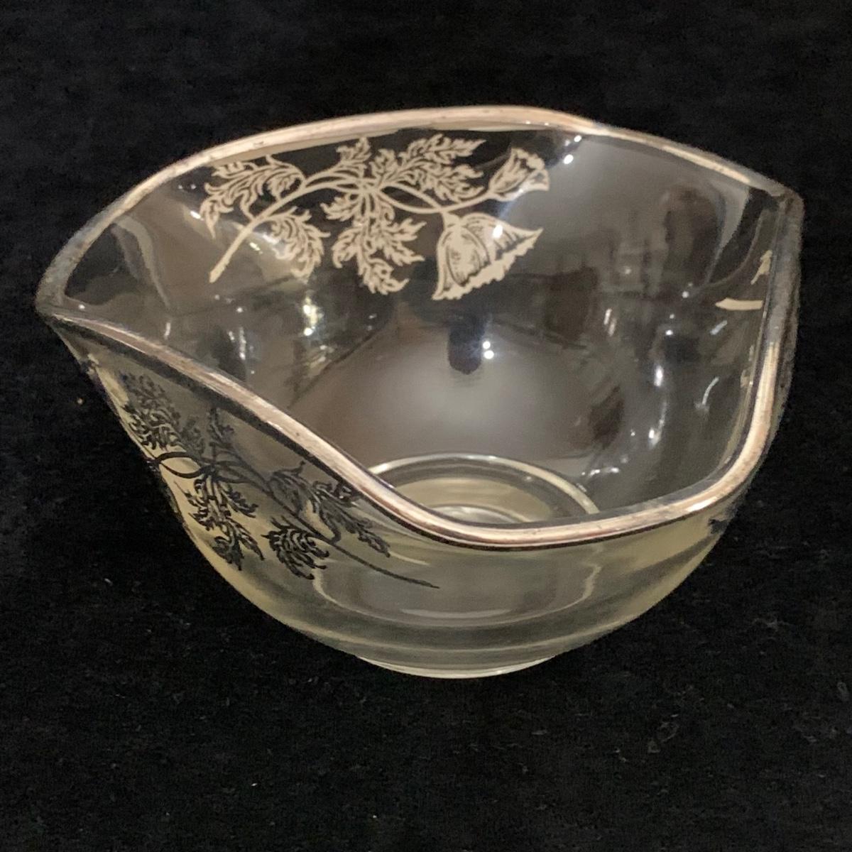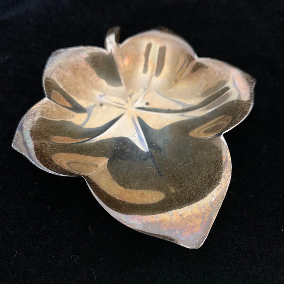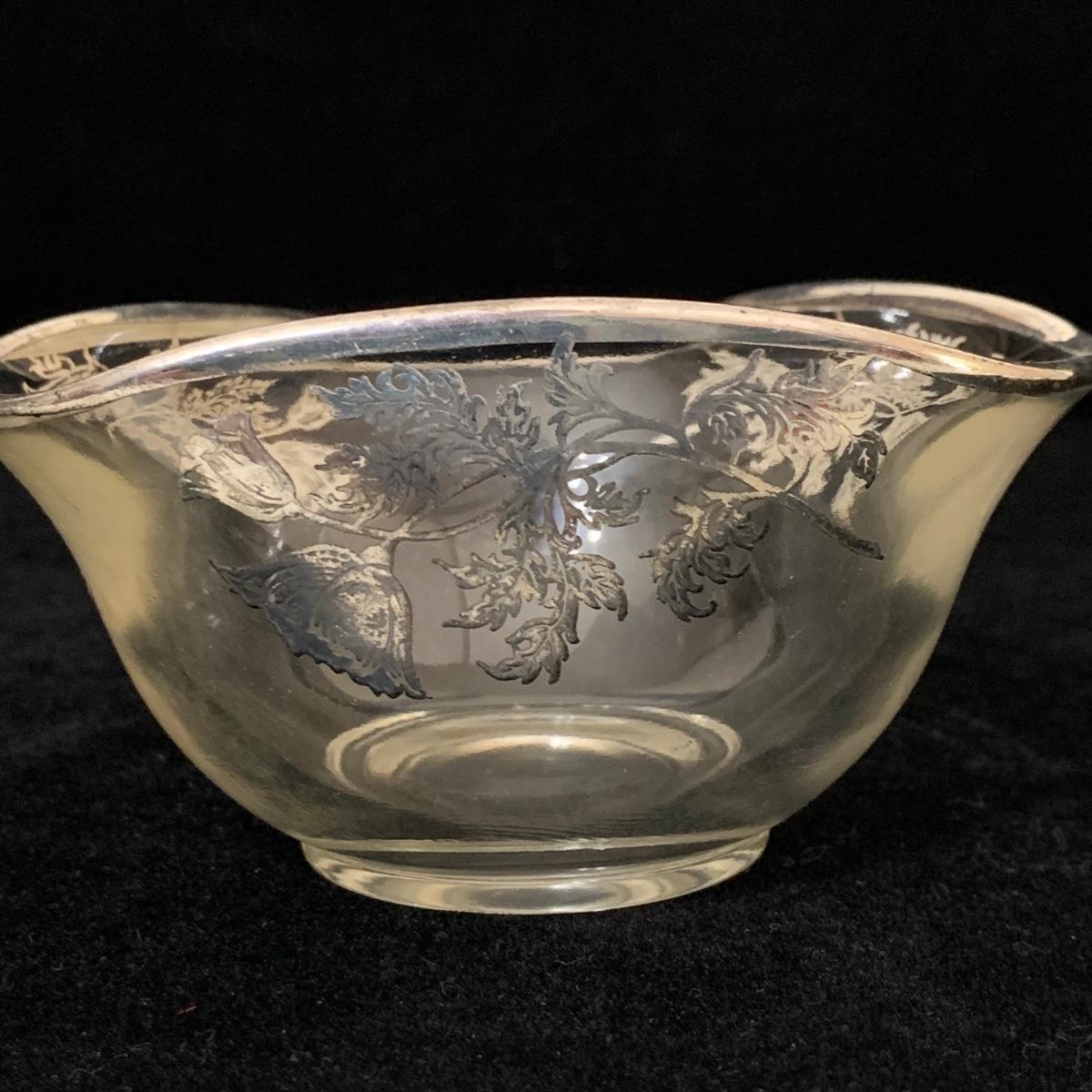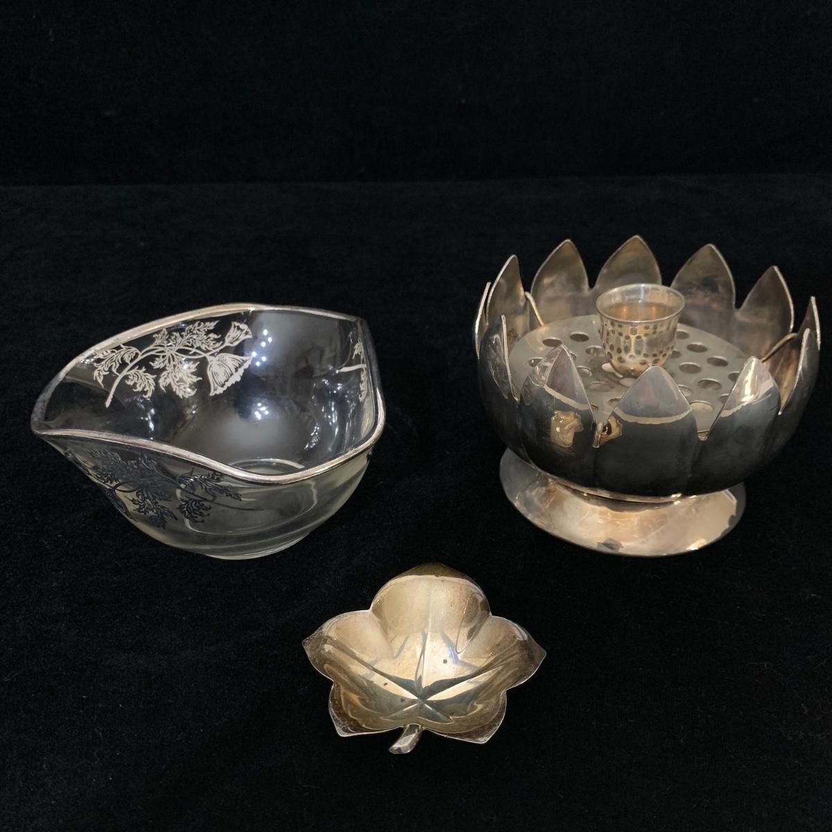 Seven total items in this collection. A leaf-shaped trinket dish marked “Tiffany & Co. Makers Sterling 22475”. Dish is about 3” x 3”. It has some tarnishing and small speckles. Also included is a silver plated lotus-shaped candle and flower holder, a glass bowl with a silver rim and floral accents, a metal cream and sugar set, and a set of salt and pepper shakers with floral etched glass jars and metal lids. Note the tiny star details in the lids of the salt and pepper shakers. All items show some wear which adds to their vintage charm.