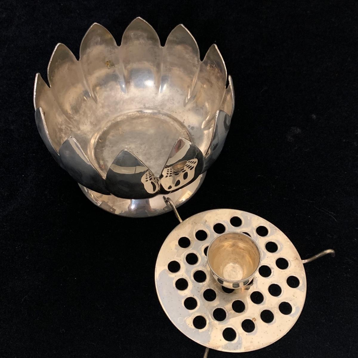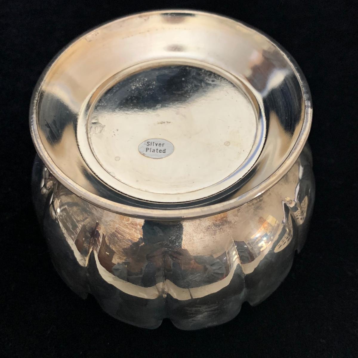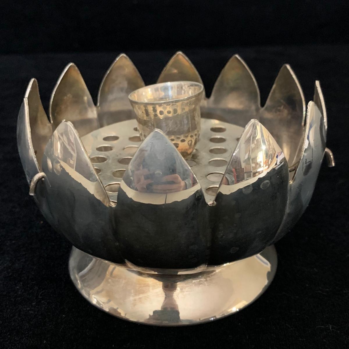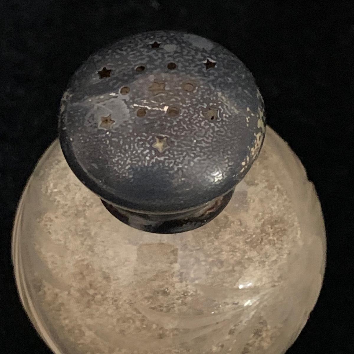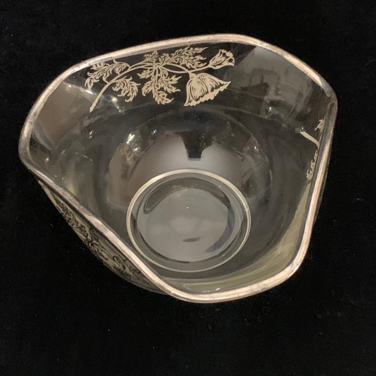 Seven total items in this collection. A leaf-shaped trinket dish marked “Tiffany & Co. Makers Sterling 22475”. Dish is about 3” x 3”. It has some tarnishing and small speckles. Also included is a silver plated lotus-shaped candle and flower holder, a glass bowl with a silver rim and floral accents, a metal cream and sugar set, and a set of salt and pepper shakers with floral etched glass jars and metal lids. Note the tiny star details in the lids of the salt and pepper shakers. All items show some wear which adds to their vintage charm.