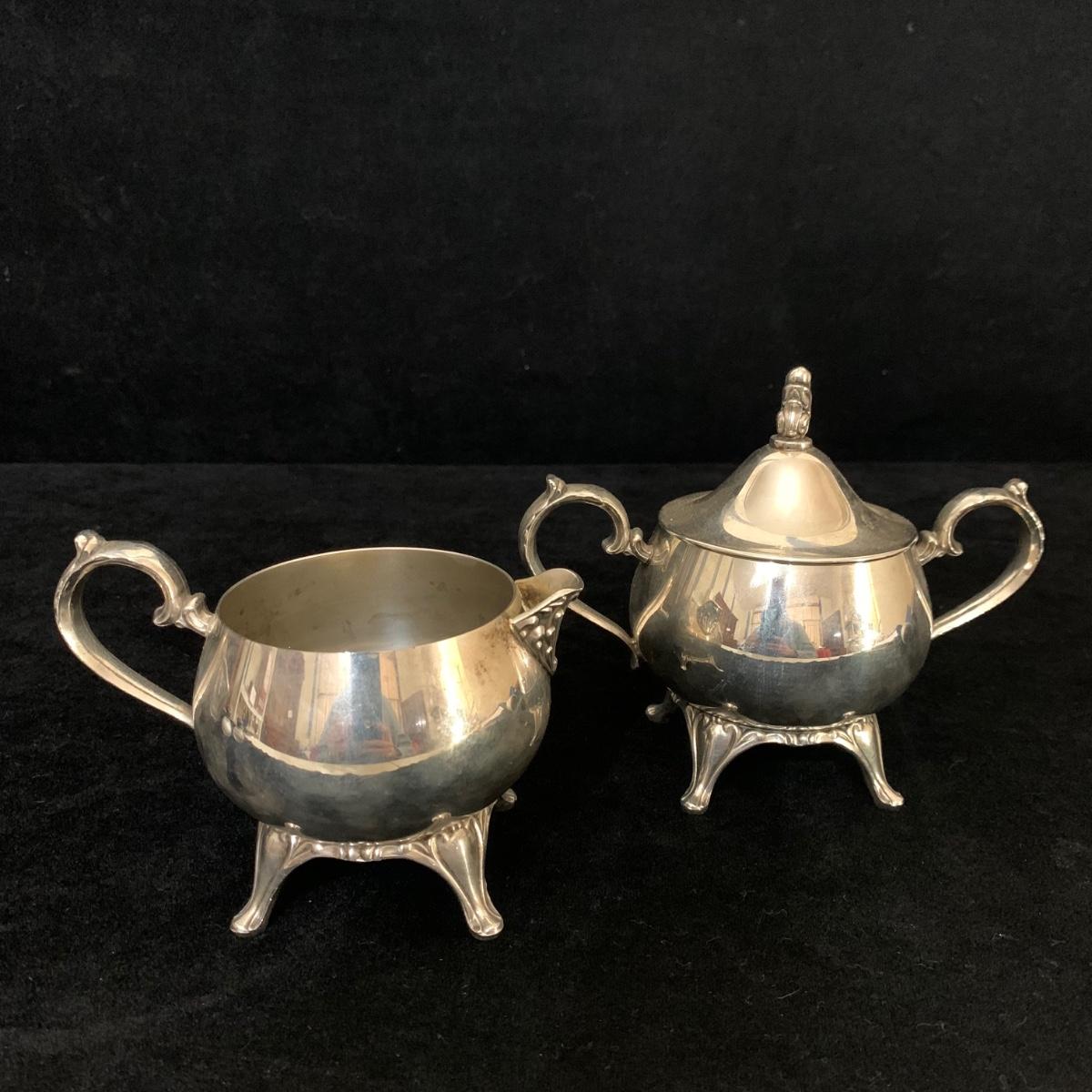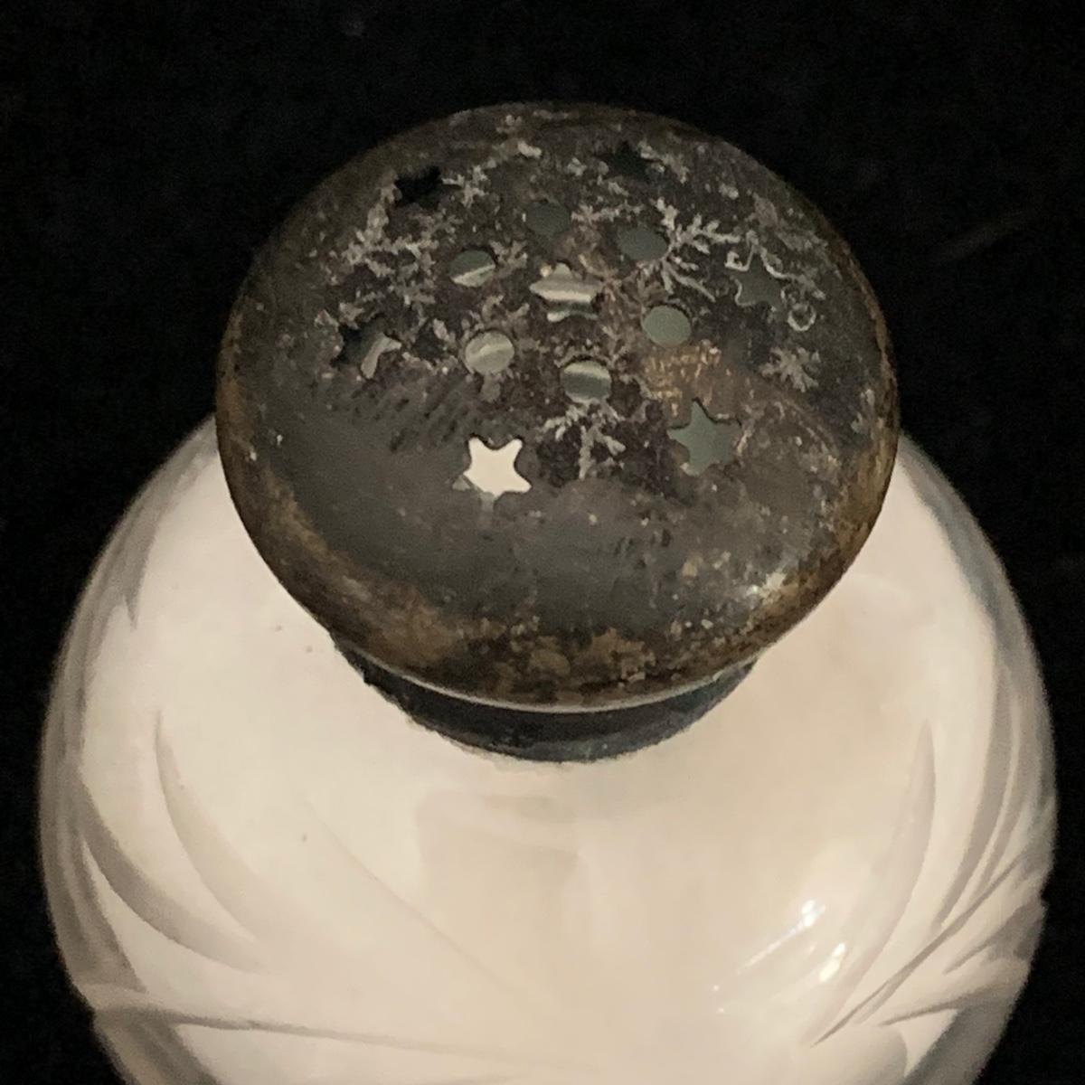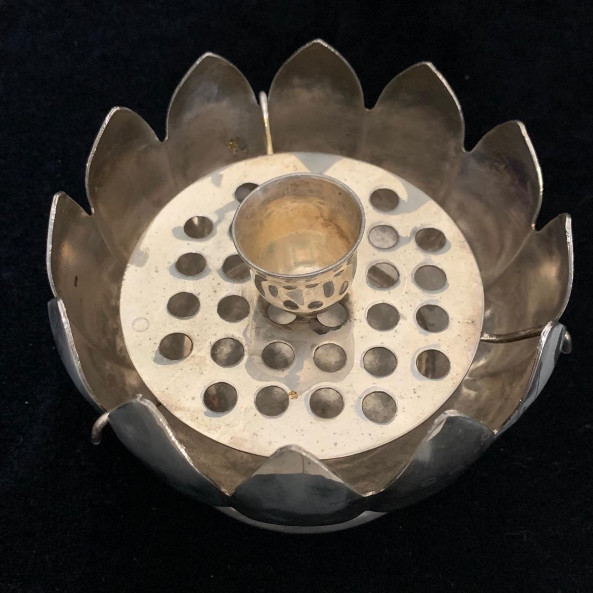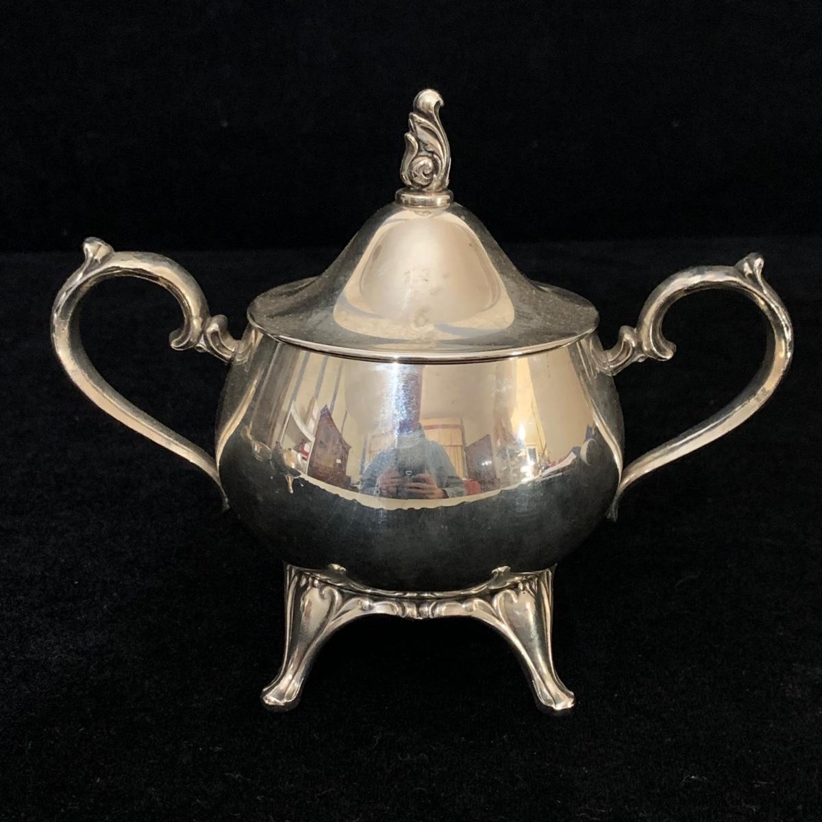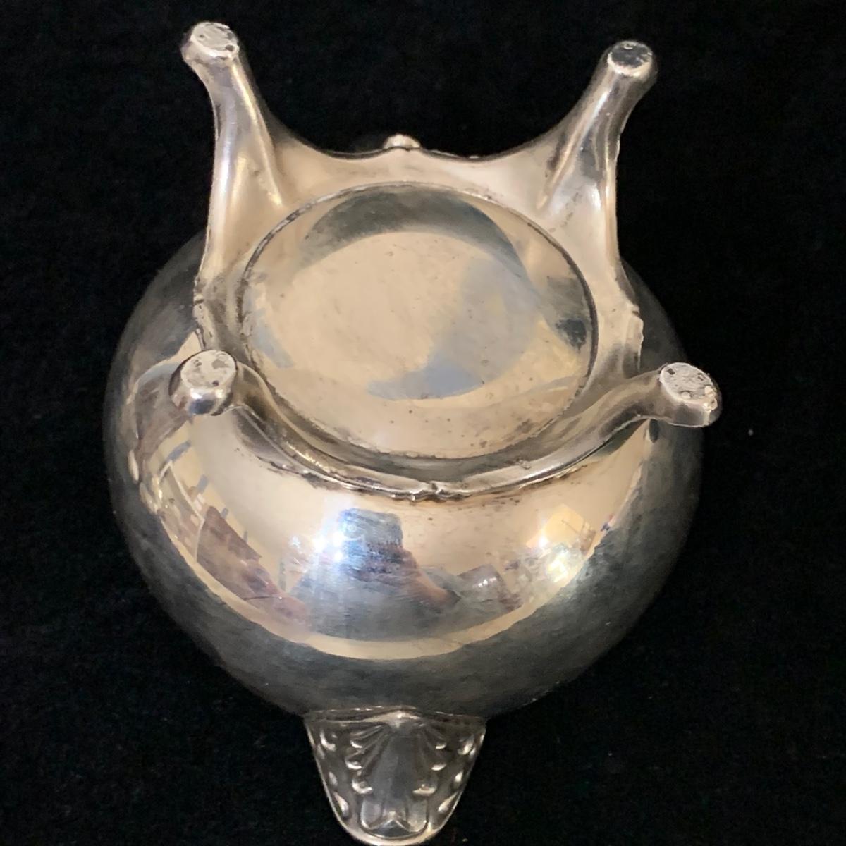 Seven total items in this collection. A leaf-shaped trinket dish marked “Tiffany & Co. Makers Sterling 22475”. Dish is about 3” x 3”. It has some tarnishing and small speckles. Also included is a silver plated lotus-shaped candle and flower holder, a glass bowl with a silver rim and floral accents, a metal cream and sugar set, and a set of salt and pepper shakers with floral etched glass jars and metal lids. Note the tiny star details in the lids of the salt and pepper shakers. All items show some wear which adds to their vintage charm.