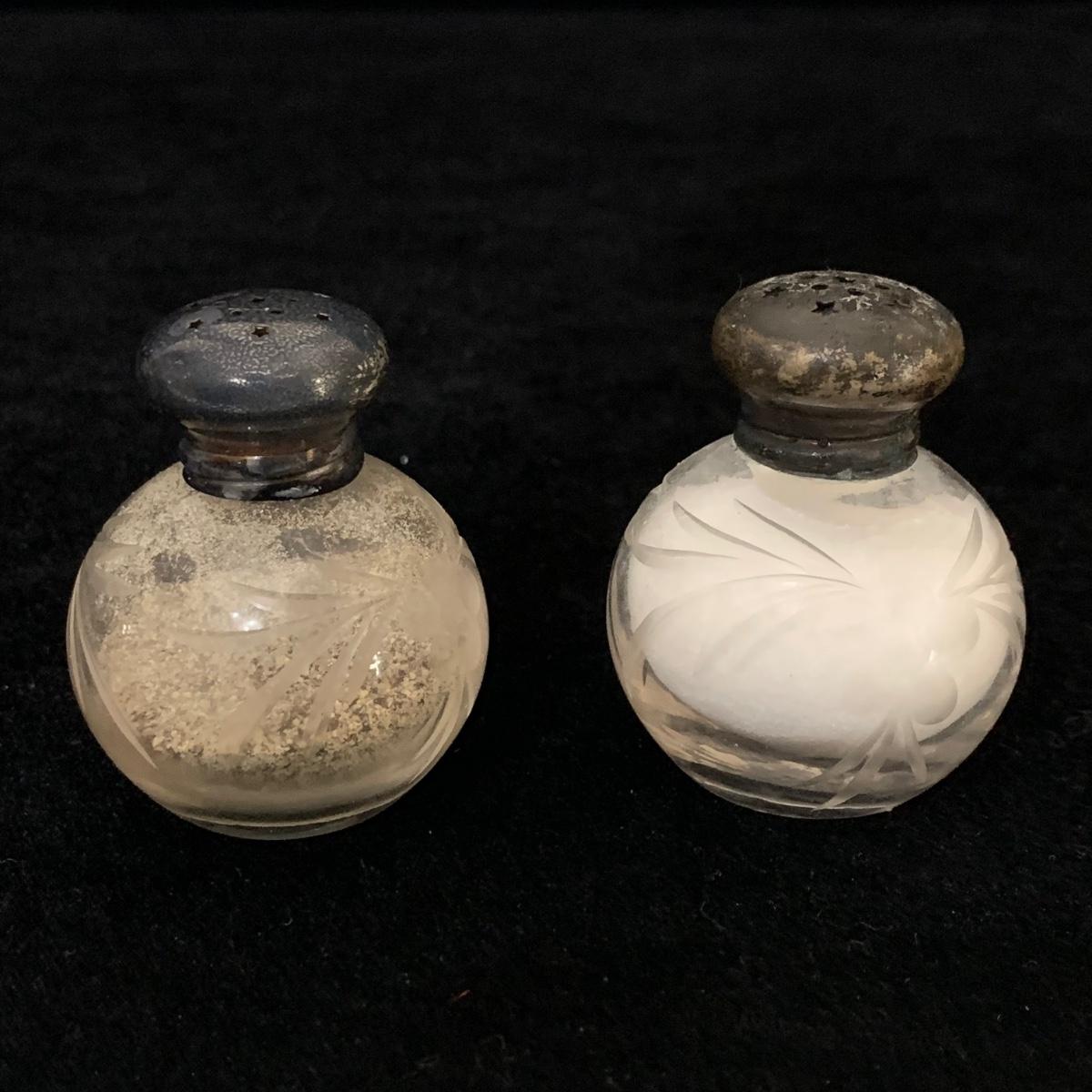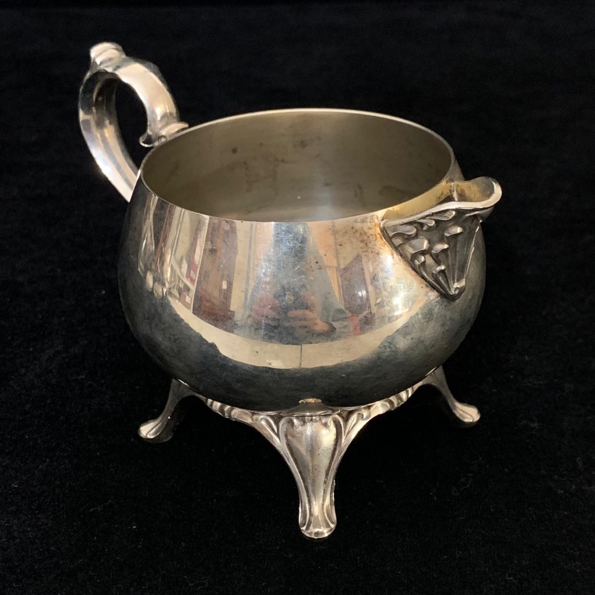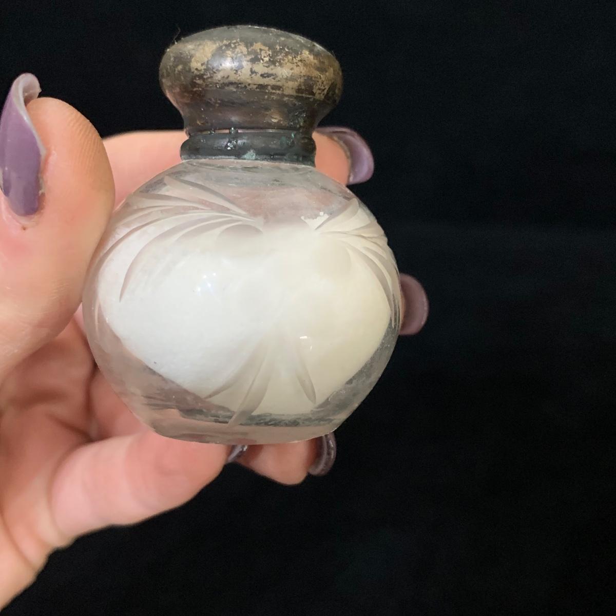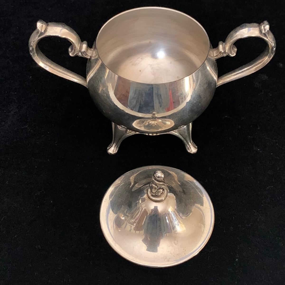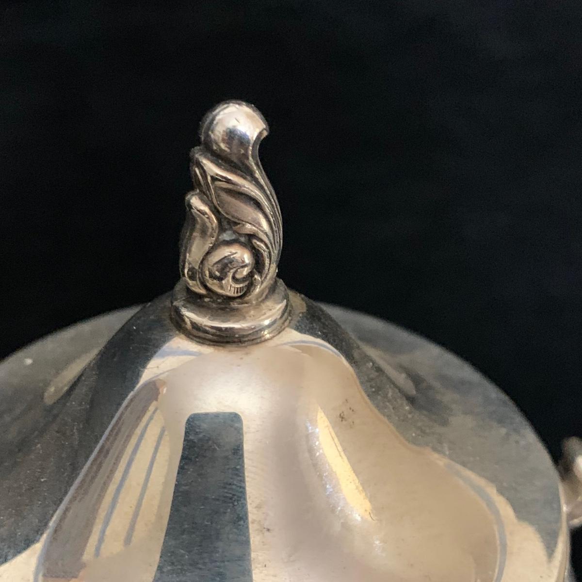 Seven total items in this collection. A leaf-shaped trinket dish marked “Tiffany & Co. Makers Sterling 22475”. Dish is about 3” x 3”. It has some tarnishing and small speckles. Also included is a silver plated lotus-shaped candle and flower holder, a glass bowl with a silver rim and floral accents, a metal cream and sugar set, and a set of salt and pepper shakers with floral etched glass jars and metal lids. Note the tiny star details in the lids of the salt and pepper shakers. All items show some wear which adds to their vintage charm.