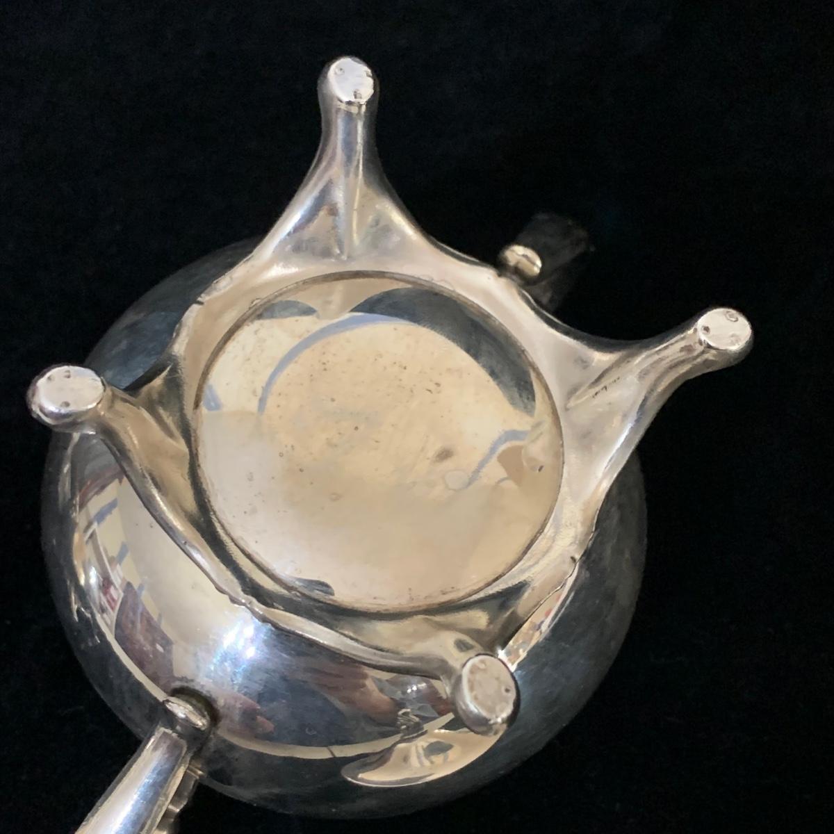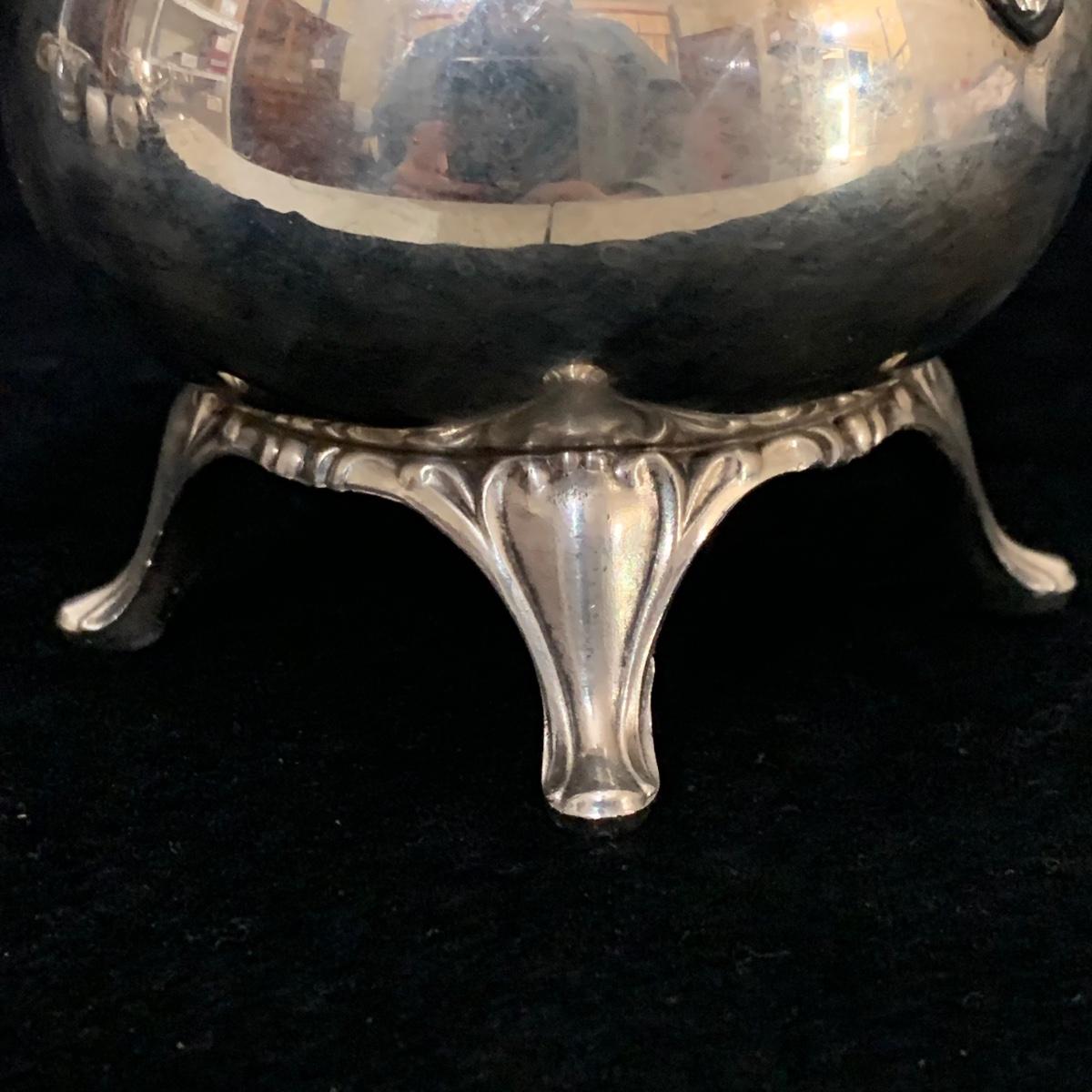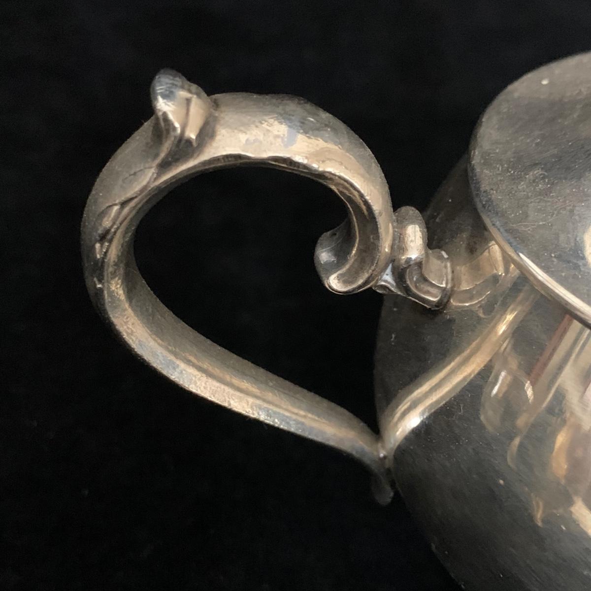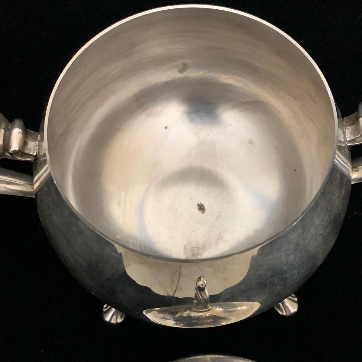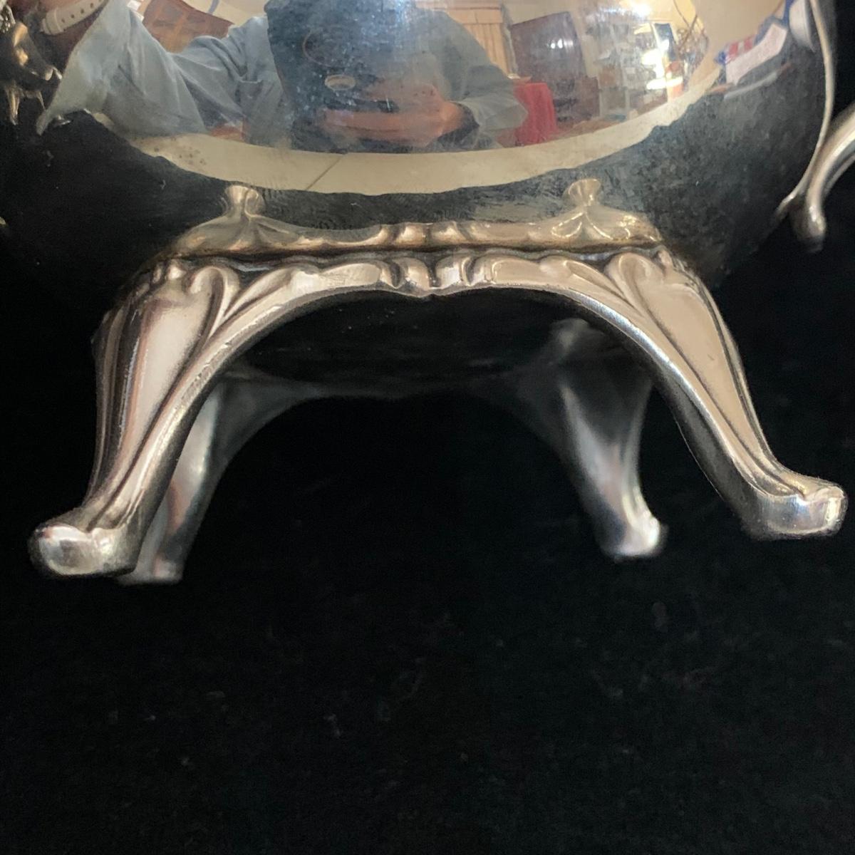 Seven total items in this collection. A leaf-shaped trinket dish marked “Tiffany & Co. Makers Sterling 22475”. Dish is about 3” x 3”. It has some tarnishing and small speckles. Also included is a silver plated lotus-shaped candle and flower holder, a glass bowl with a silver rim and floral accents, a metal cream and sugar set, and a set of salt and pepper shakers with floral etched glass jars and metal lids. Note the tiny star details in the lids of the salt and pepper shakers. All items show some wear which adds to their vintage charm.