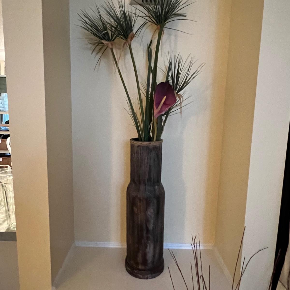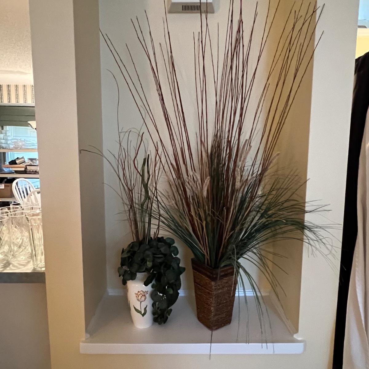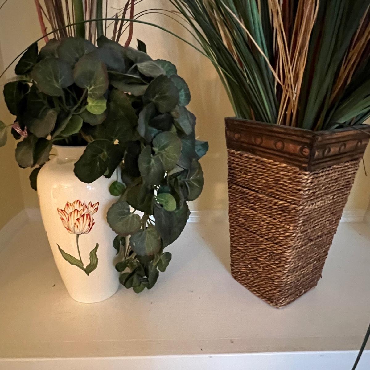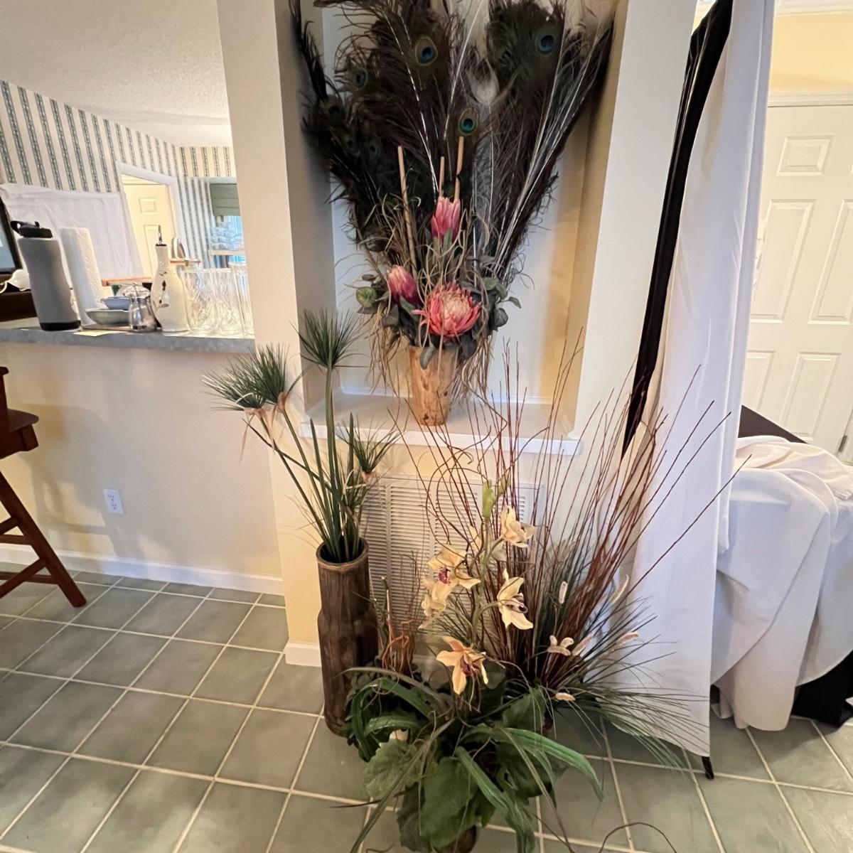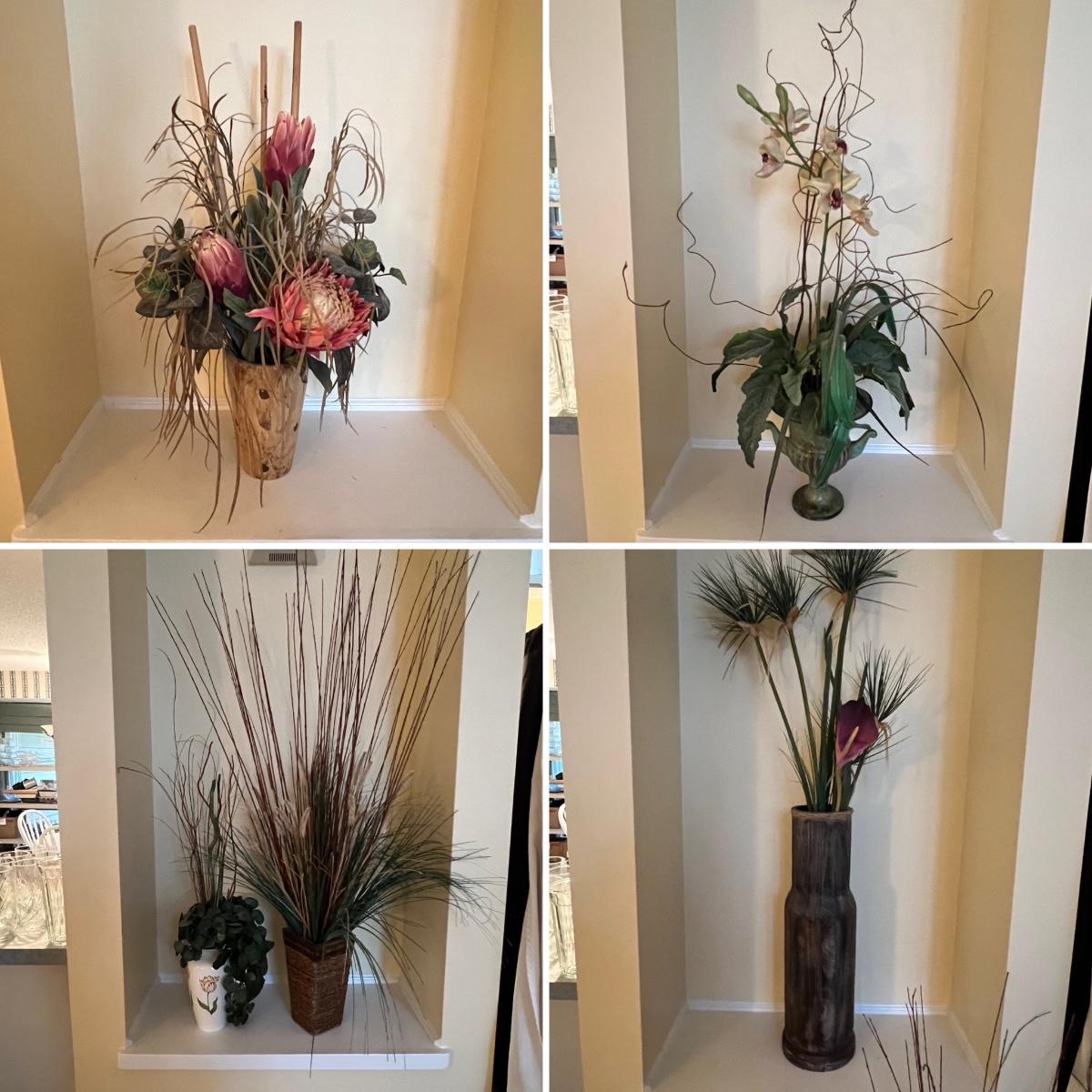 Five faux floral arrangements plus over 20 peacock feathers. Vases include a faux wood (this is the tallest vase measuring 7”D x 22”H), a woven rope, metal urn and two ceramic; the ceramic tulip vase is made by Tiffany & Co and measures 3”D (base) x 9”H.
