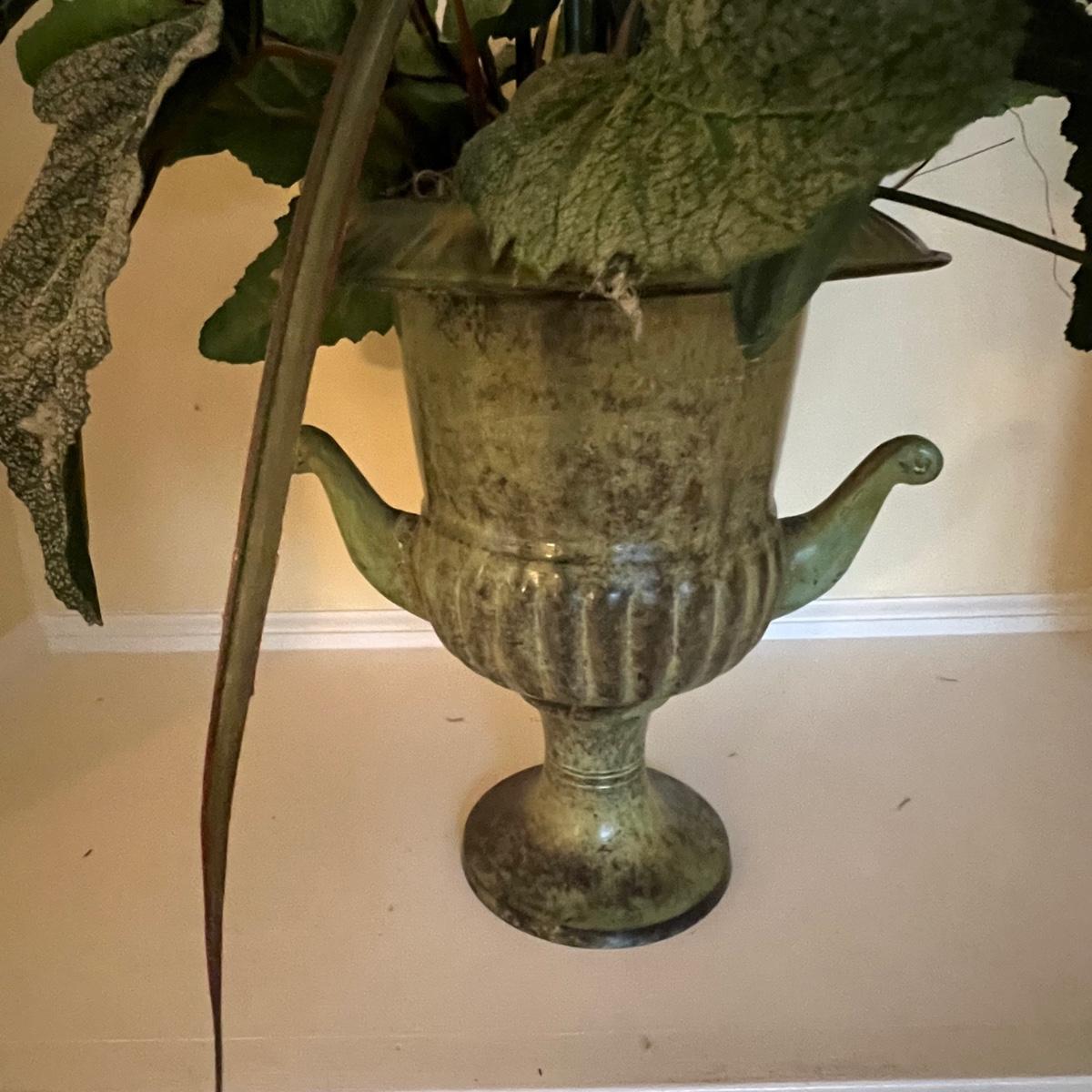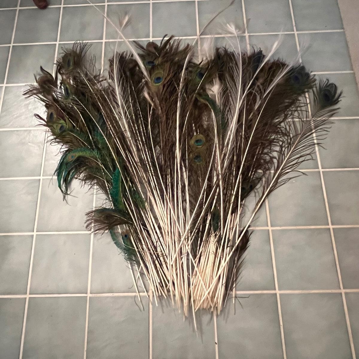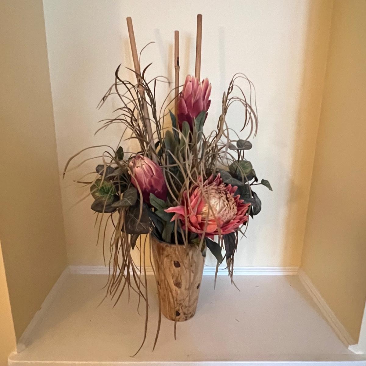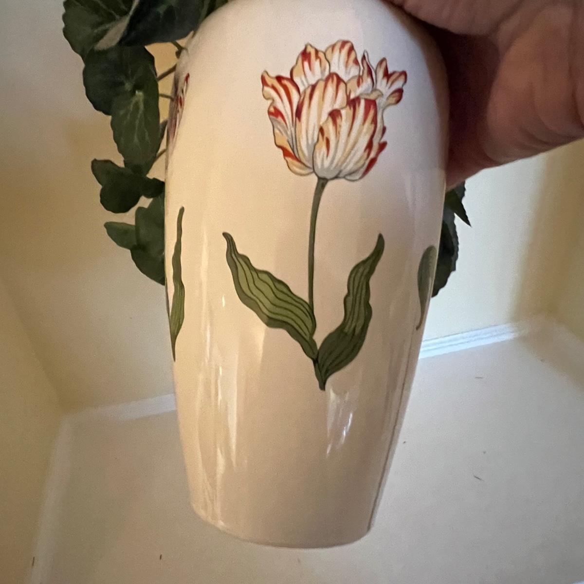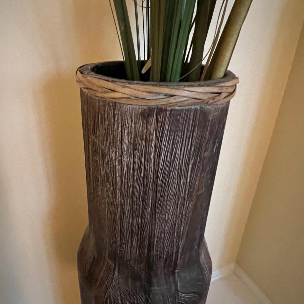 Five faux floral arrangements plus over 20 peacock feathers. Vases include a faux wood (this is the tallest vase measuring 7”D x 22”H), a woven rope, metal urn and two ceramic; the ceramic tulip vase is made by Tiffany & Co and measures 3”D (base) x 9”H.