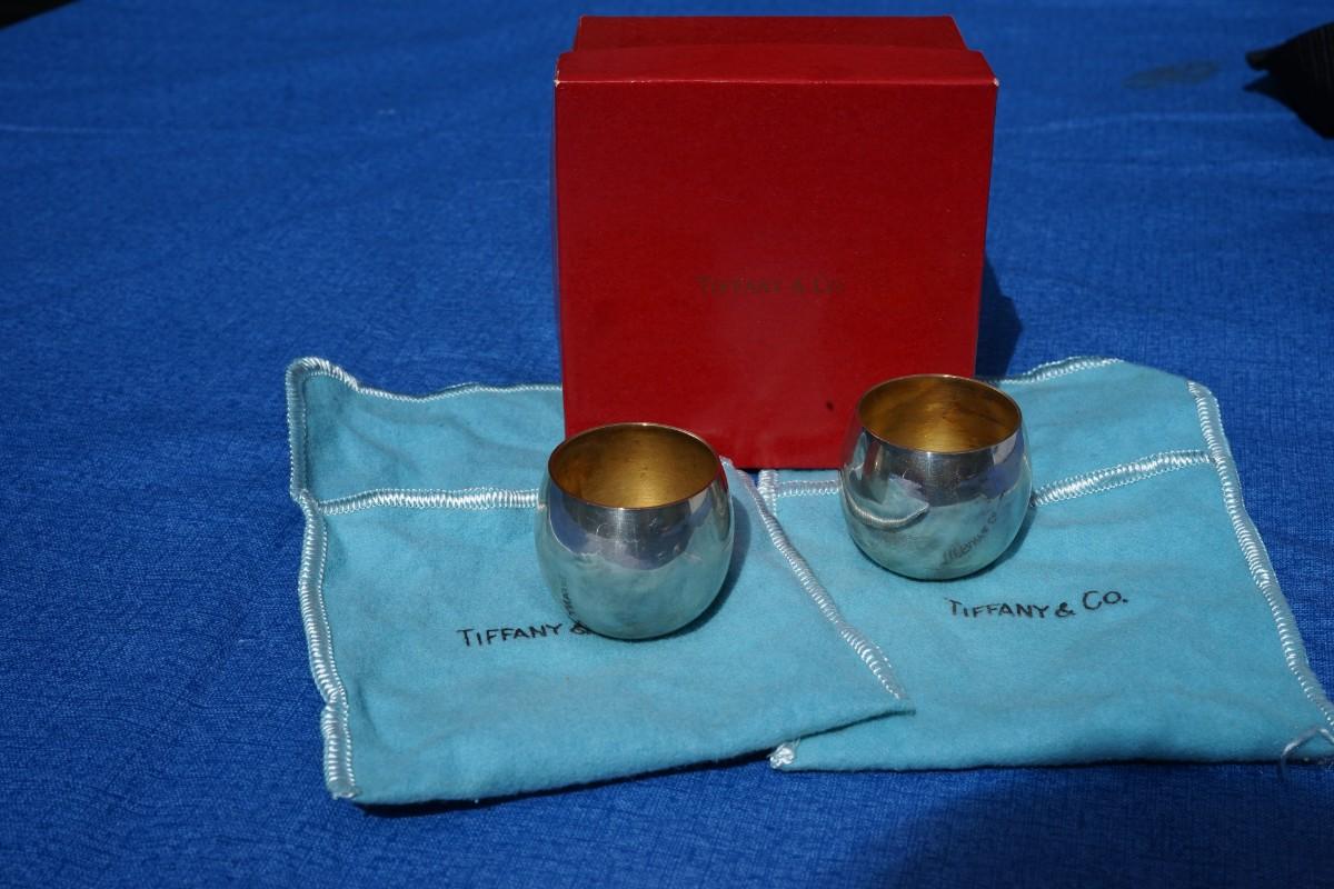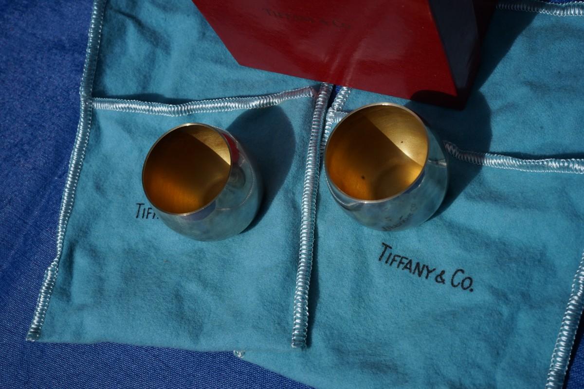 TIFFANY STERLING SHOT LIQUOR CUPS PAIR W/POUCH AND BOX