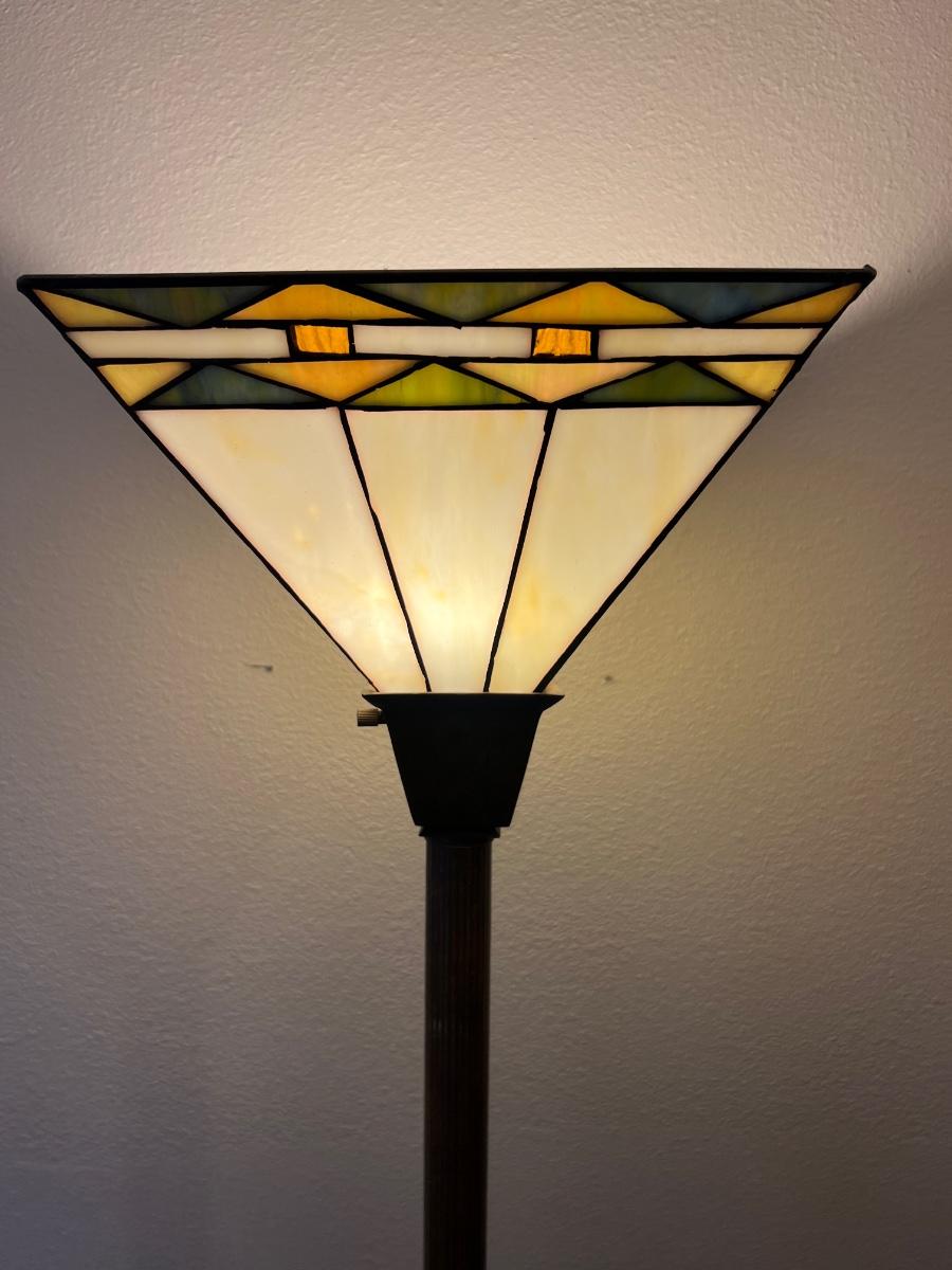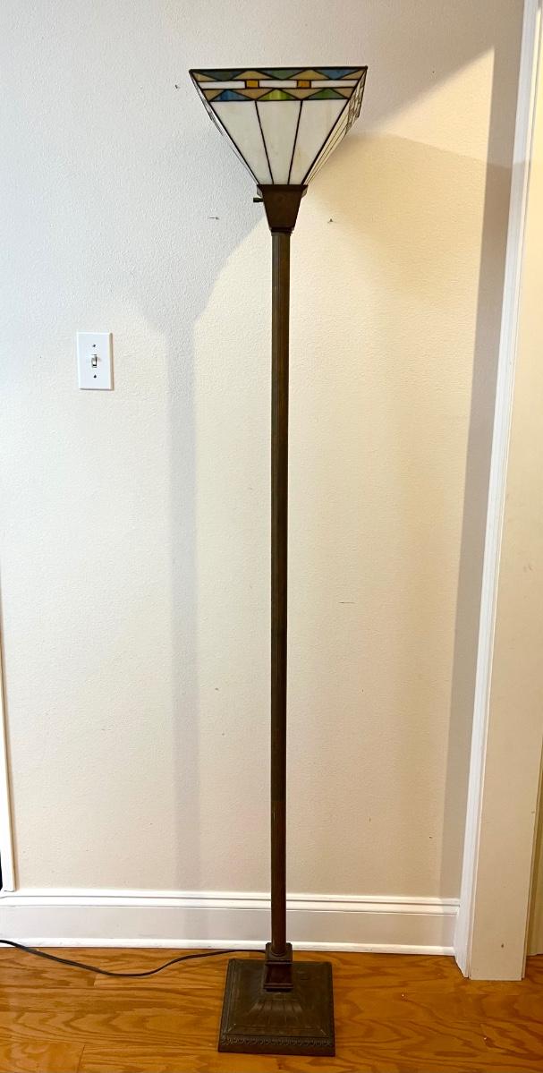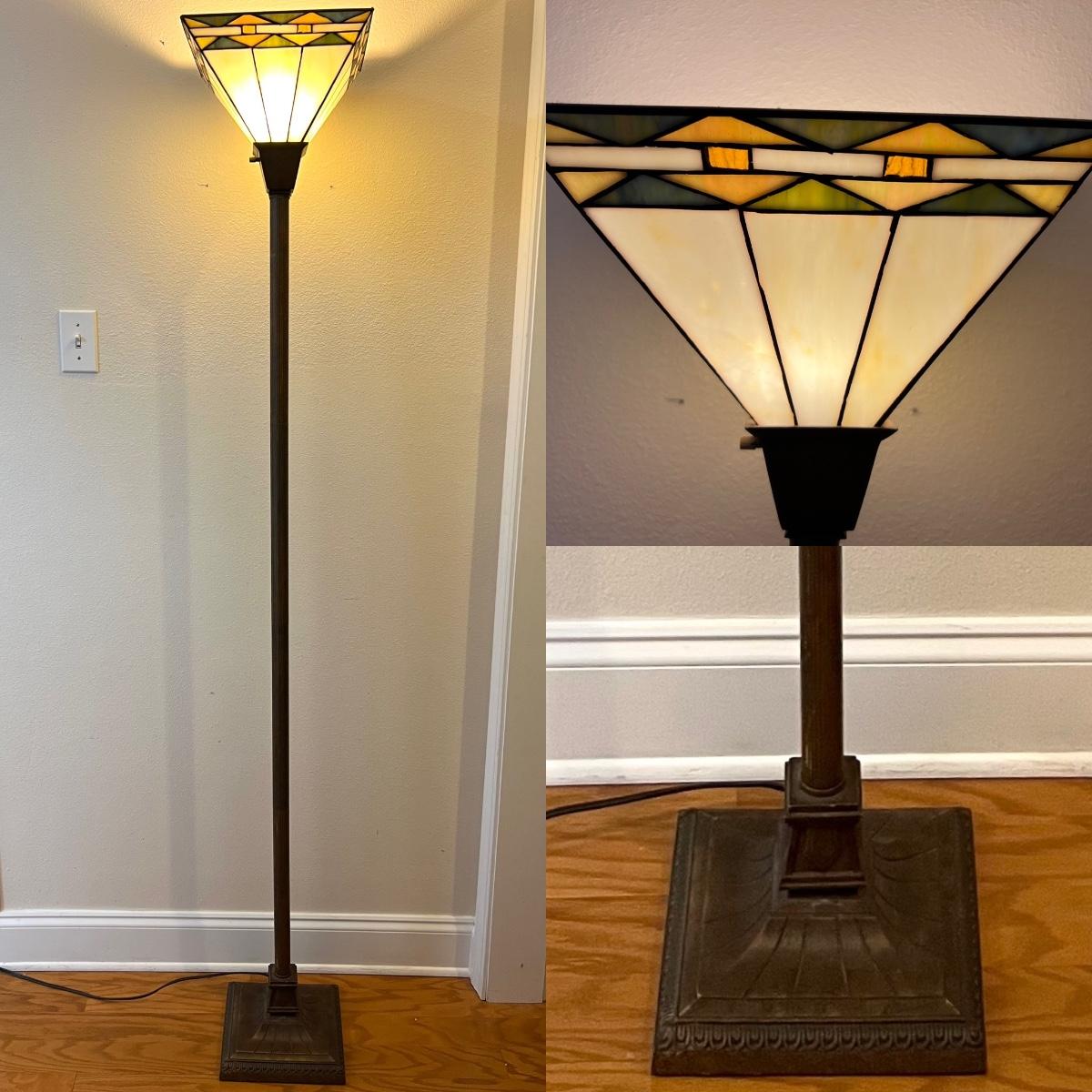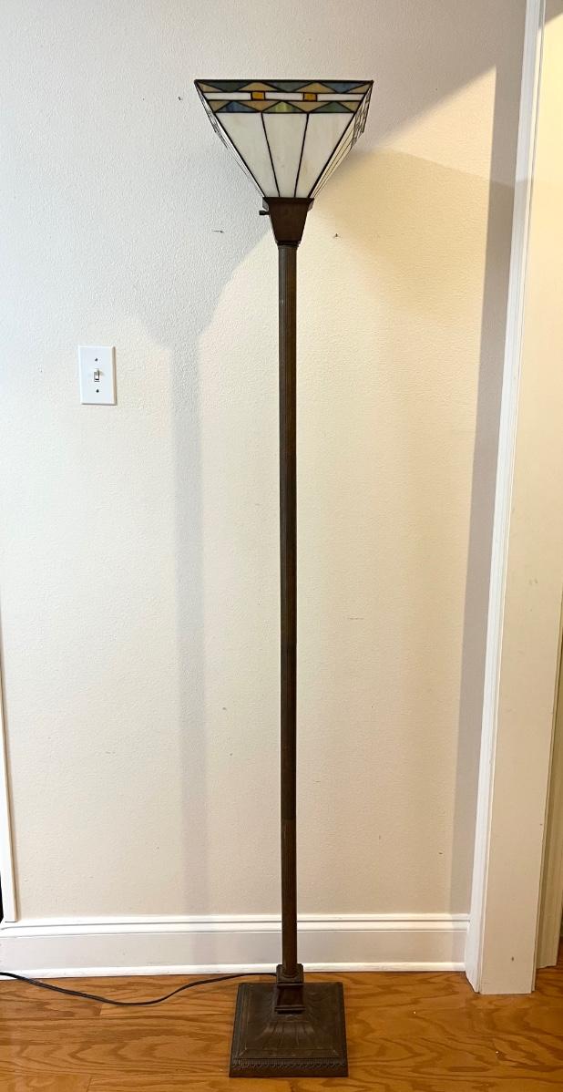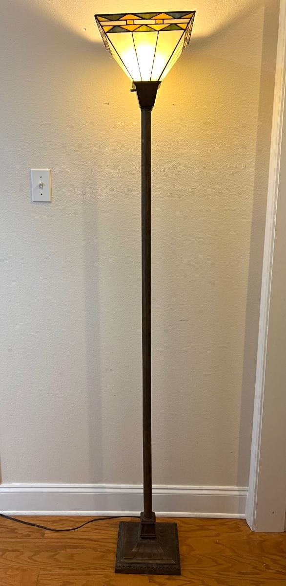 Tiffany Style 3 Way Floor Lamp With heavy plastic Faux stained glass colored shade. Measures 6 feet tall. Base measures 9 1/2 wide and 9 1/2 deep