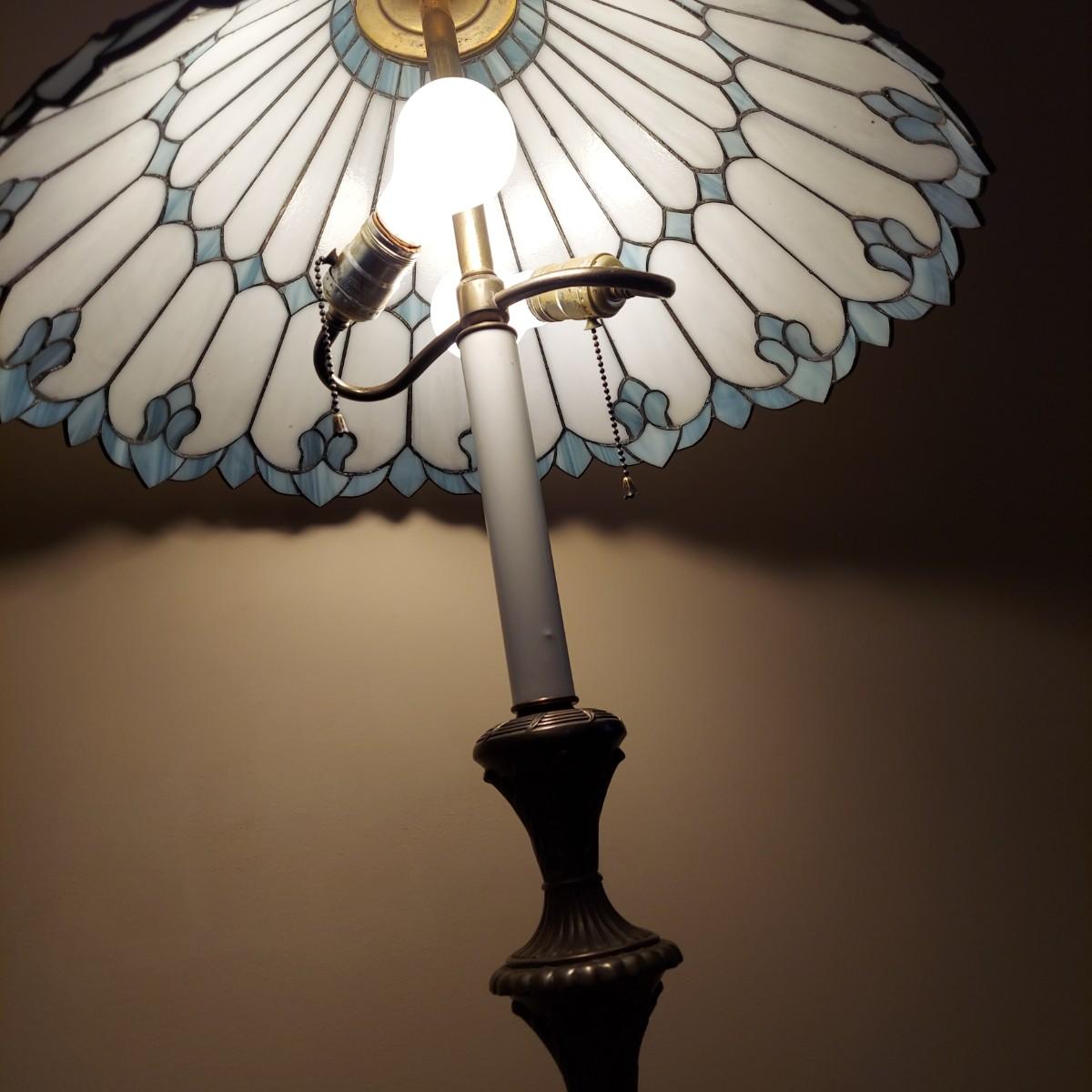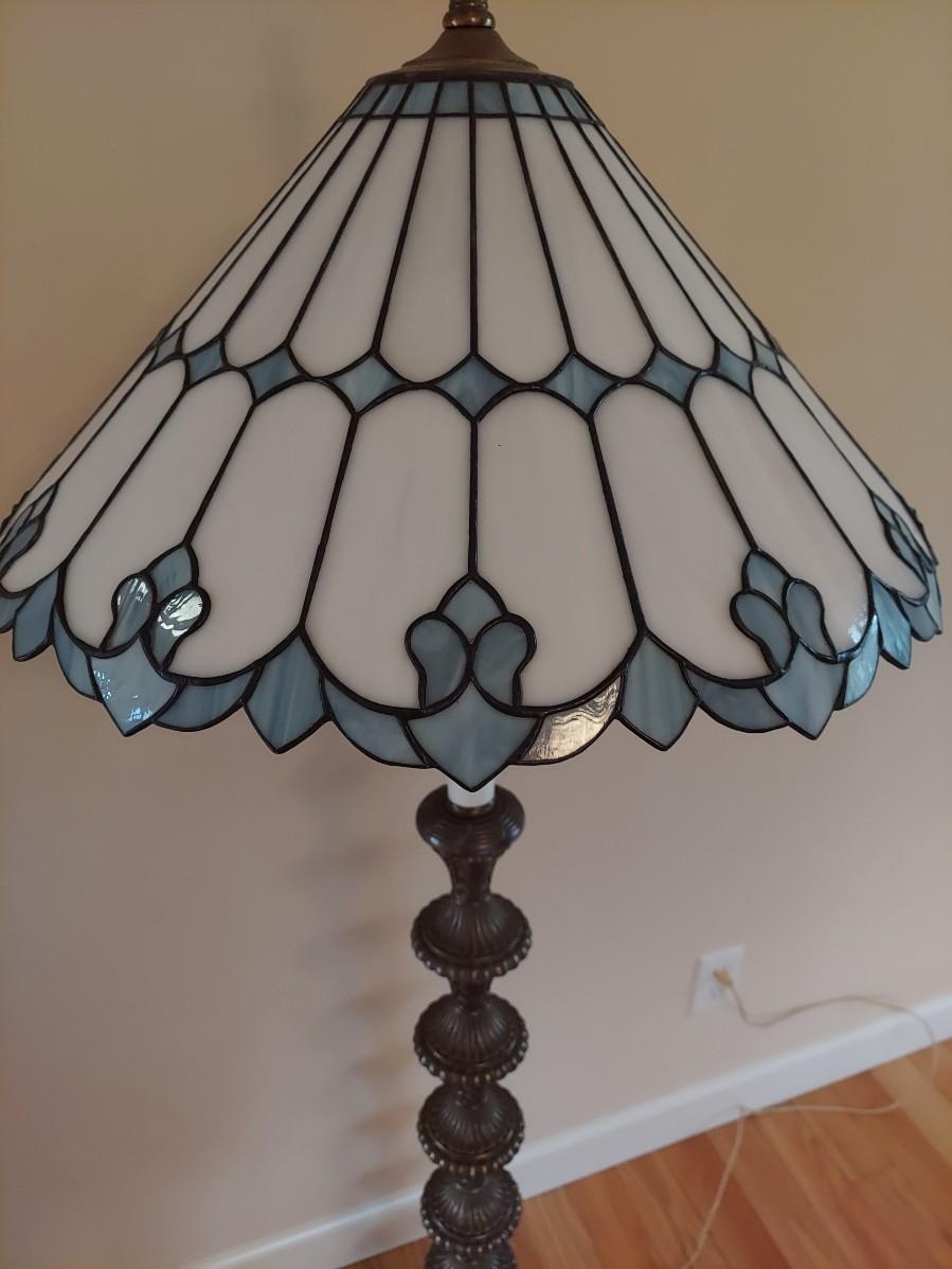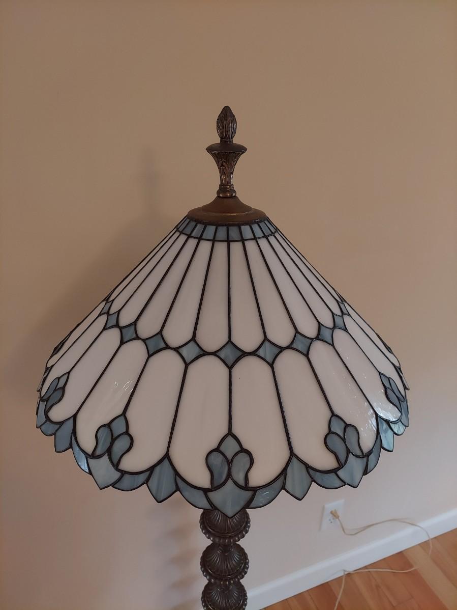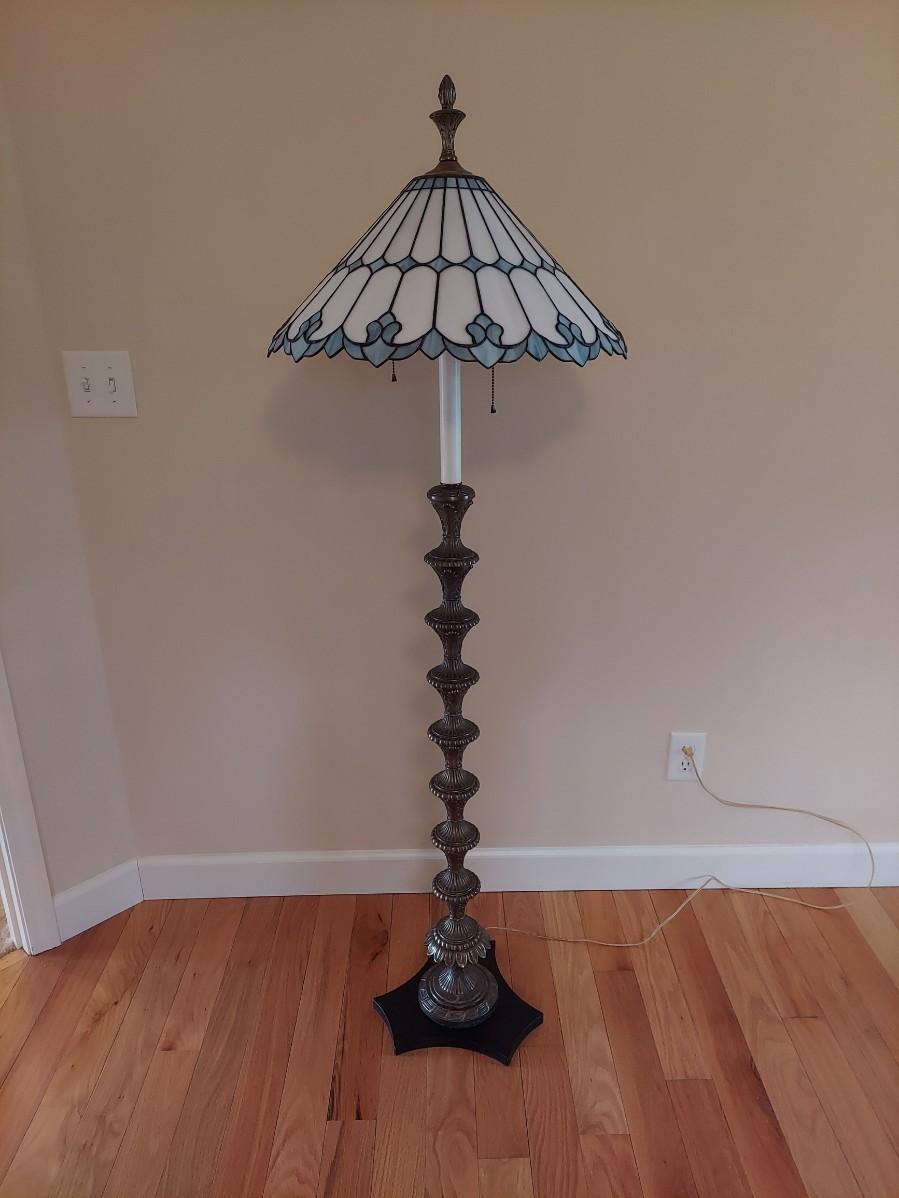 Floor lamp with Tiffany style shade and brass accents. Shade has 21"D. Lamp is approximately 63"H w/ finial. Please see photos for details. Shipping available. Shipping certain items can be costly. We suggest contacting our preferred local shipping provider, Postage Express, with dimensions and getting an estimate before bidding: (828) 255-9250 or shipping@postageexpressnc.com