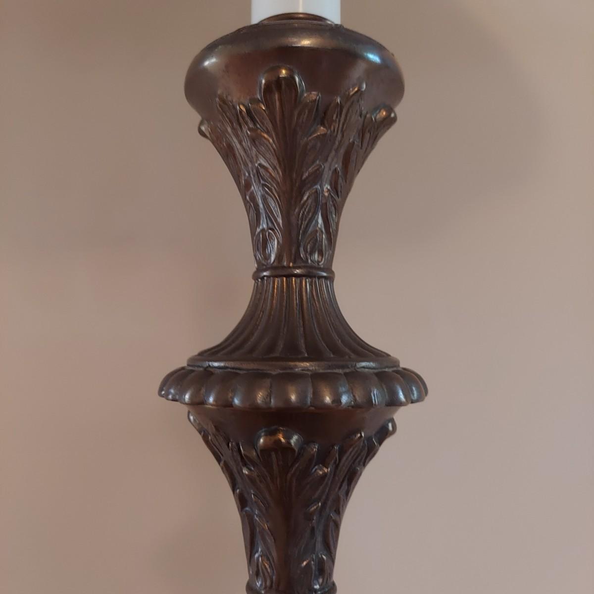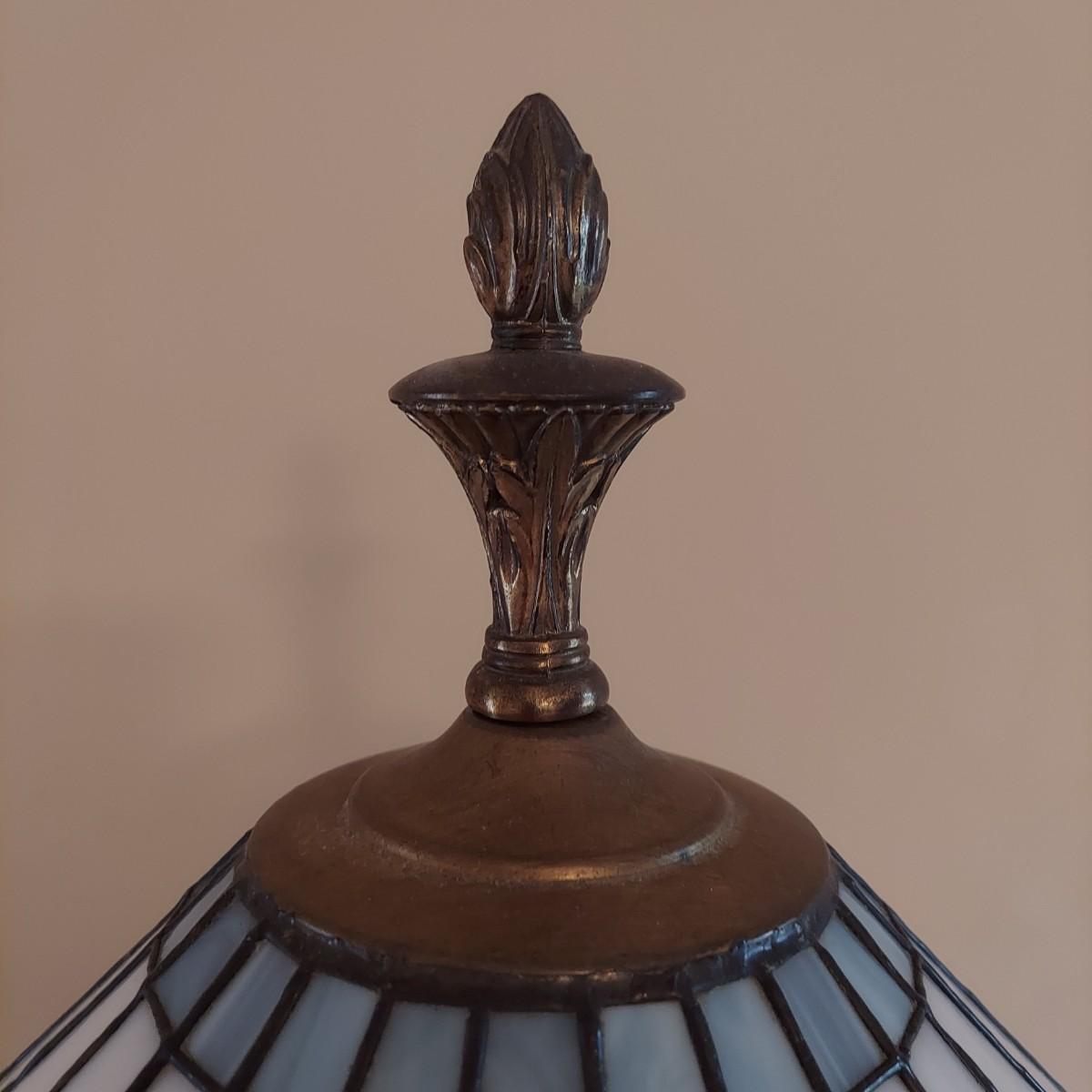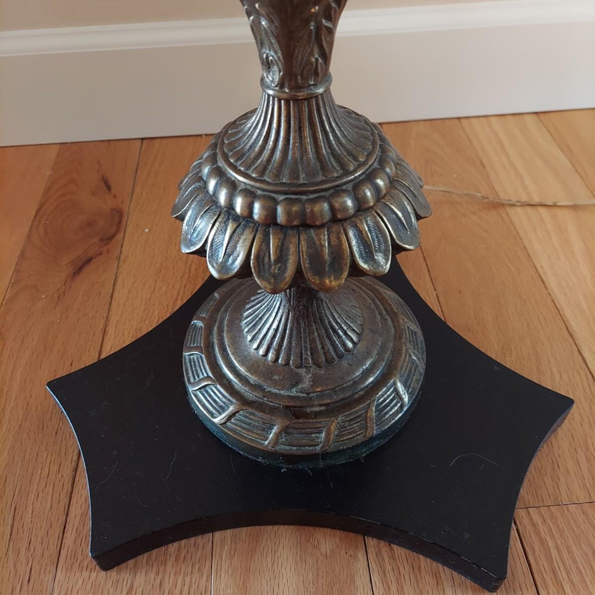 Floor lamp with Tiffany style shade and brass accents. Shade has 21"D. Lamp is approximately 63"H w/ finial. Please see photos for details. Shipping available. Shipping certain items can be costly. We suggest contacting our preferred local shipping provider, Postage Express, with dimensions and getting an estimate before bidding: (828) 255-9250 or shipping@postageexpressnc.com