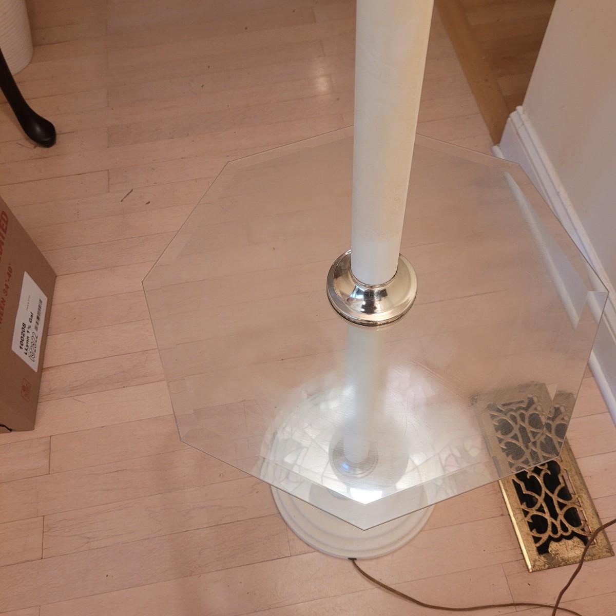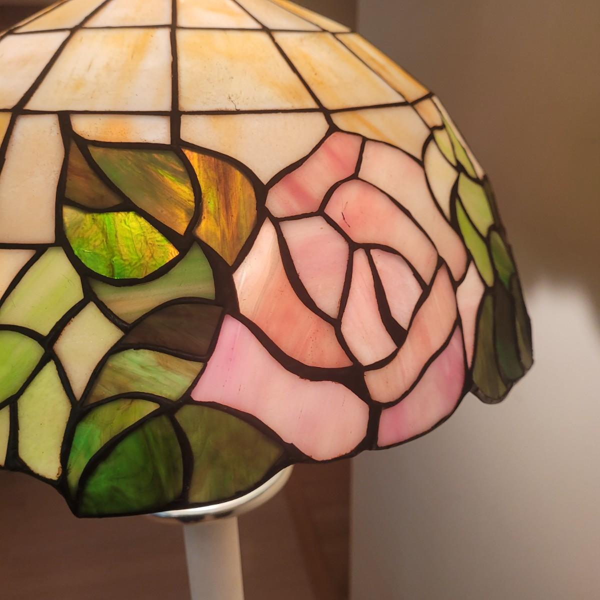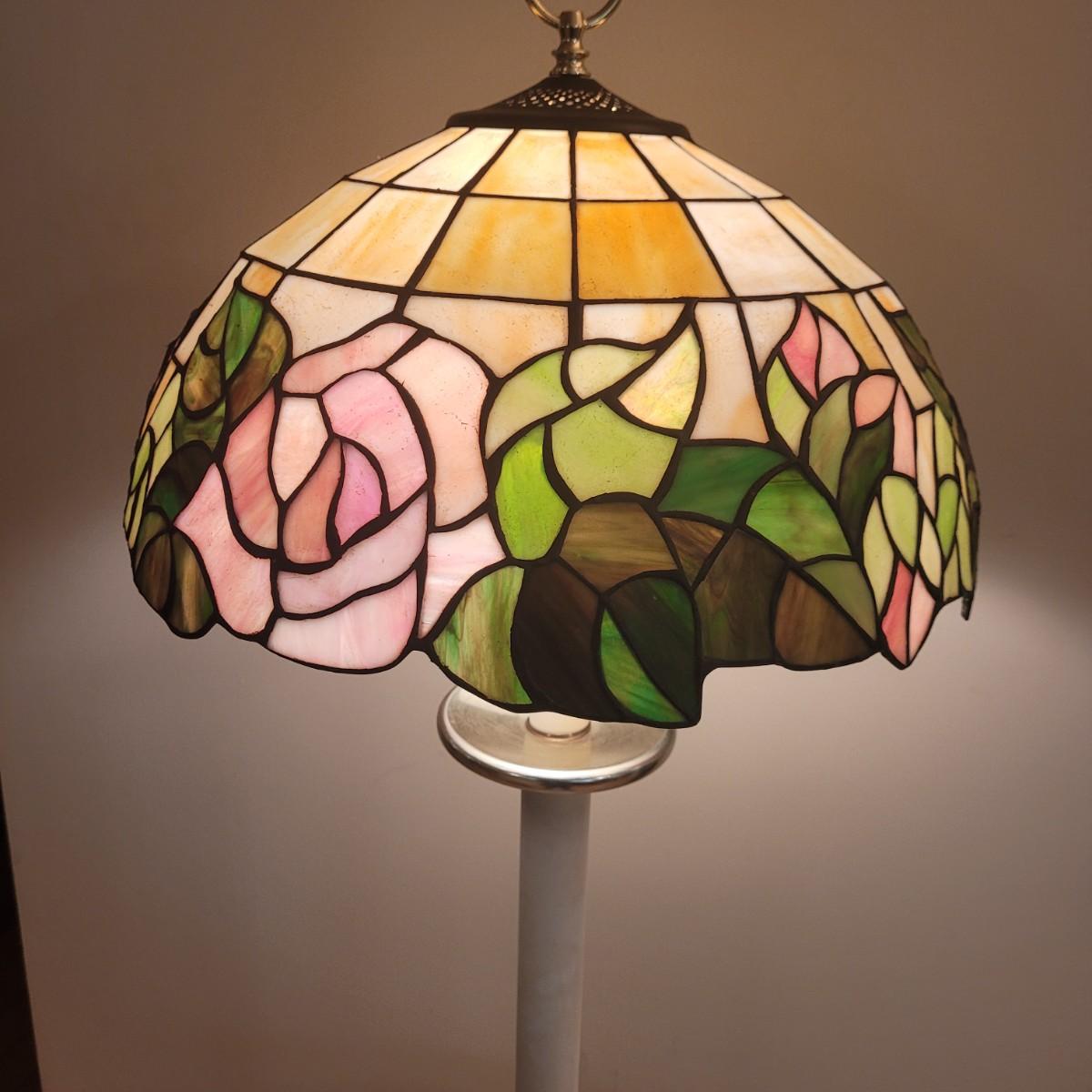 Faux stained glass Tiffany style lamp with rose design. Shade appears to be a heavy plastic, pole is metal with a glass table. Measures approximately 59"H, lamp shade 16"DIA, glass table 15"DIA x23"H. Local pickup only.