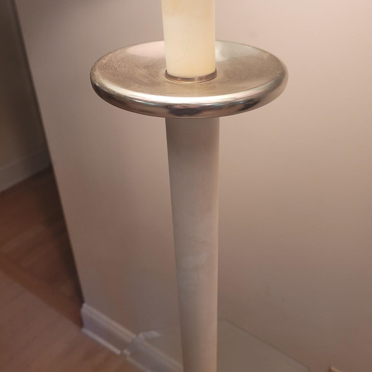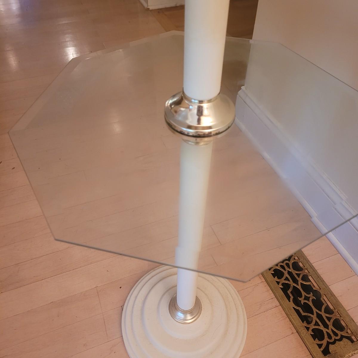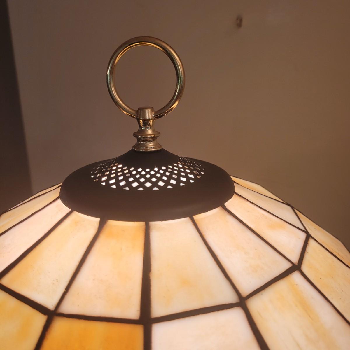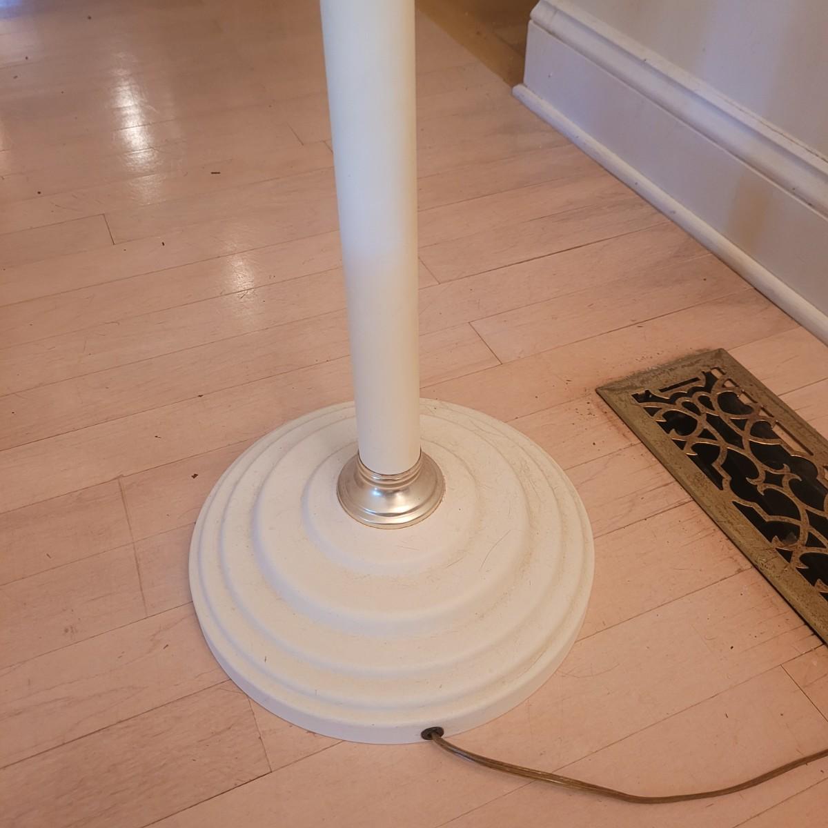 Faux stained glass Tiffany style lamp with rose design. Shade appears to be a heavy plastic, pole is metal with a glass table. Measures approximately 59"H, lamp shade 16"DIA, glass table 15"DIA x23"H. Local pickup only.