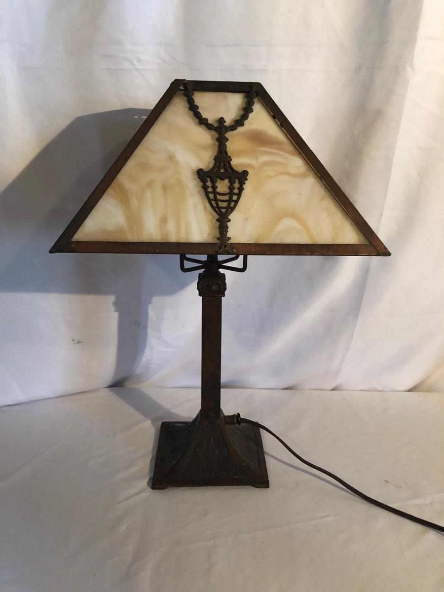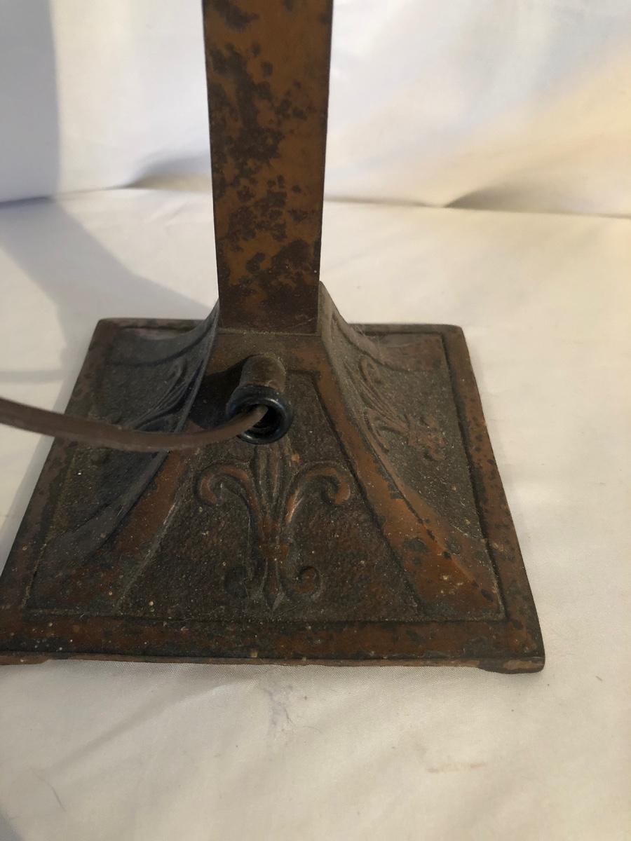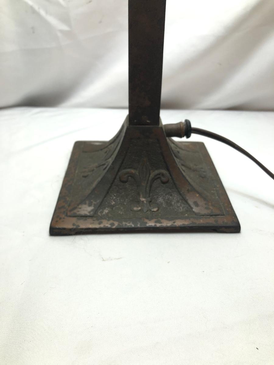 Lot includes a Tiffany style lamp in Mission design with slag glass and metal shade and a metal body with Fleur De Light s on bottom. Lamp worked when tested, but switch does not work so it is stuck on. Lamp measures 11” x 11” x 19.5”.