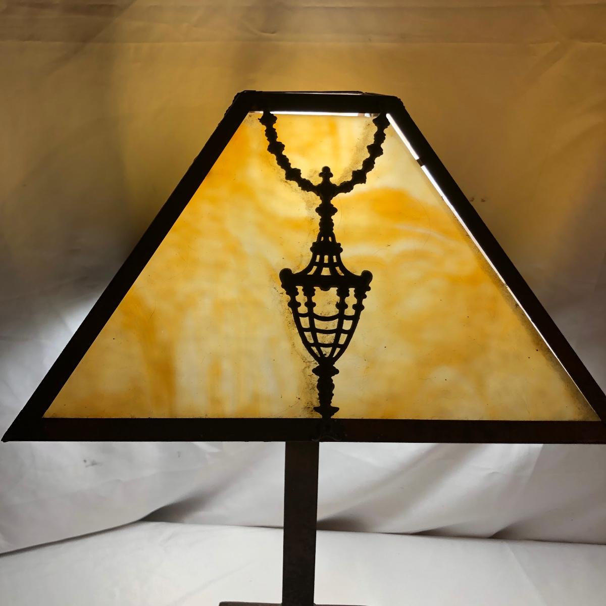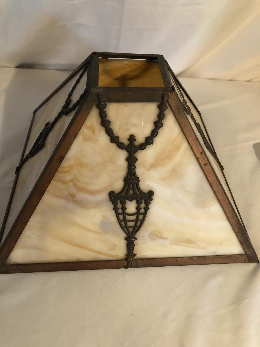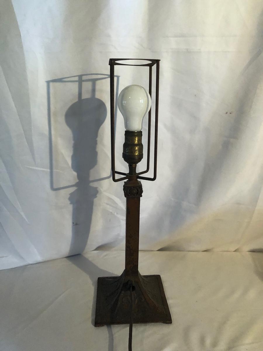 Lot includes a Tiffany style lamp in Mission design with slag glass and metal shade and a metal body with Fleur De Light s on bottom. Lamp worked when tested, but switch does not work so it is stuck on. Lamp measures 11” x 11” x 19.5”.