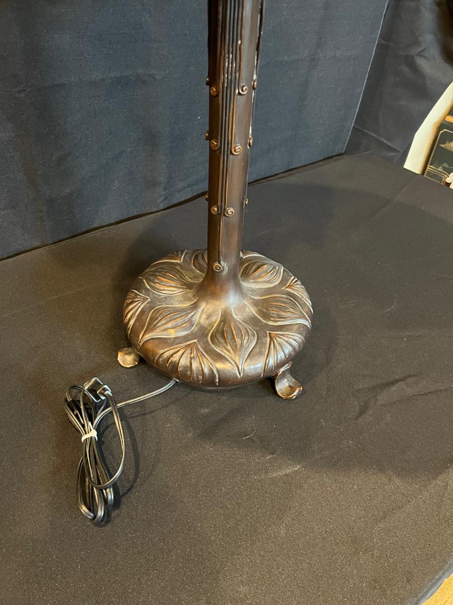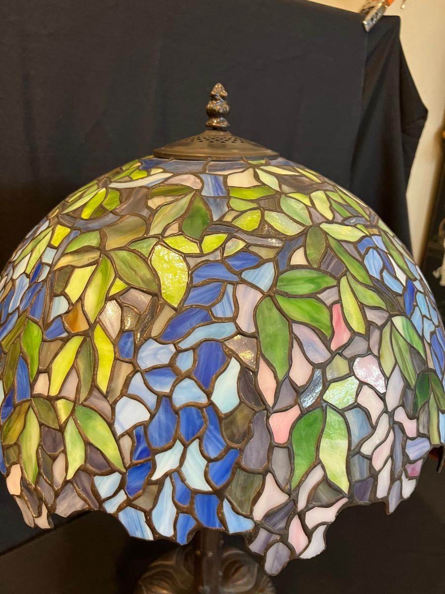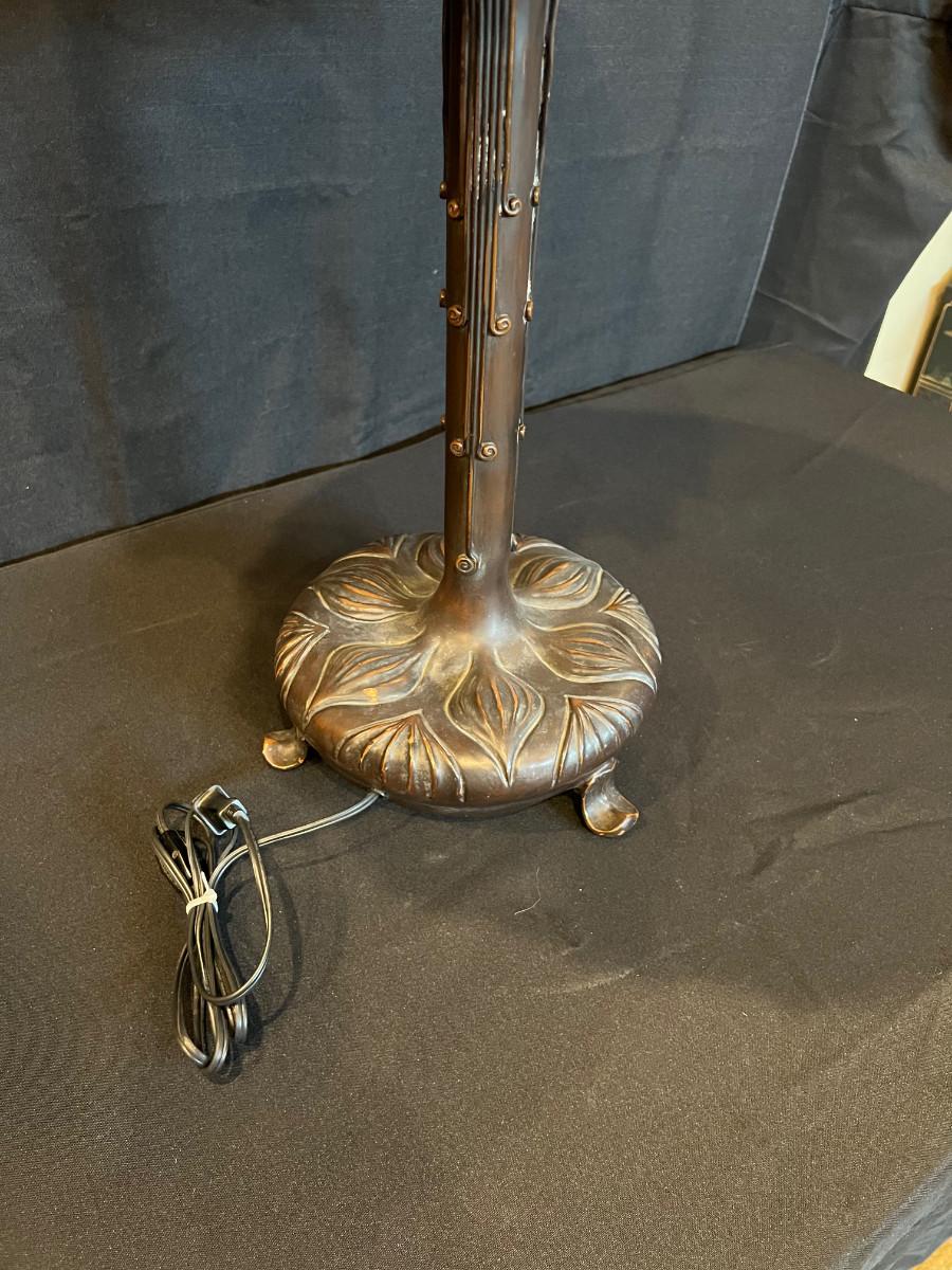 Tiffany Style Stainglass Lamp by Quoizel Collectables, signature tab on shade. Beautiful well made antique reproduction of a Tiffany lamp. Solid bronze base with leaded glass shade. 32" tall shade has a 20" diameter and is 12' high. weight is approximately 40 pounds. This item can be shipped but we will have a boxing fee.